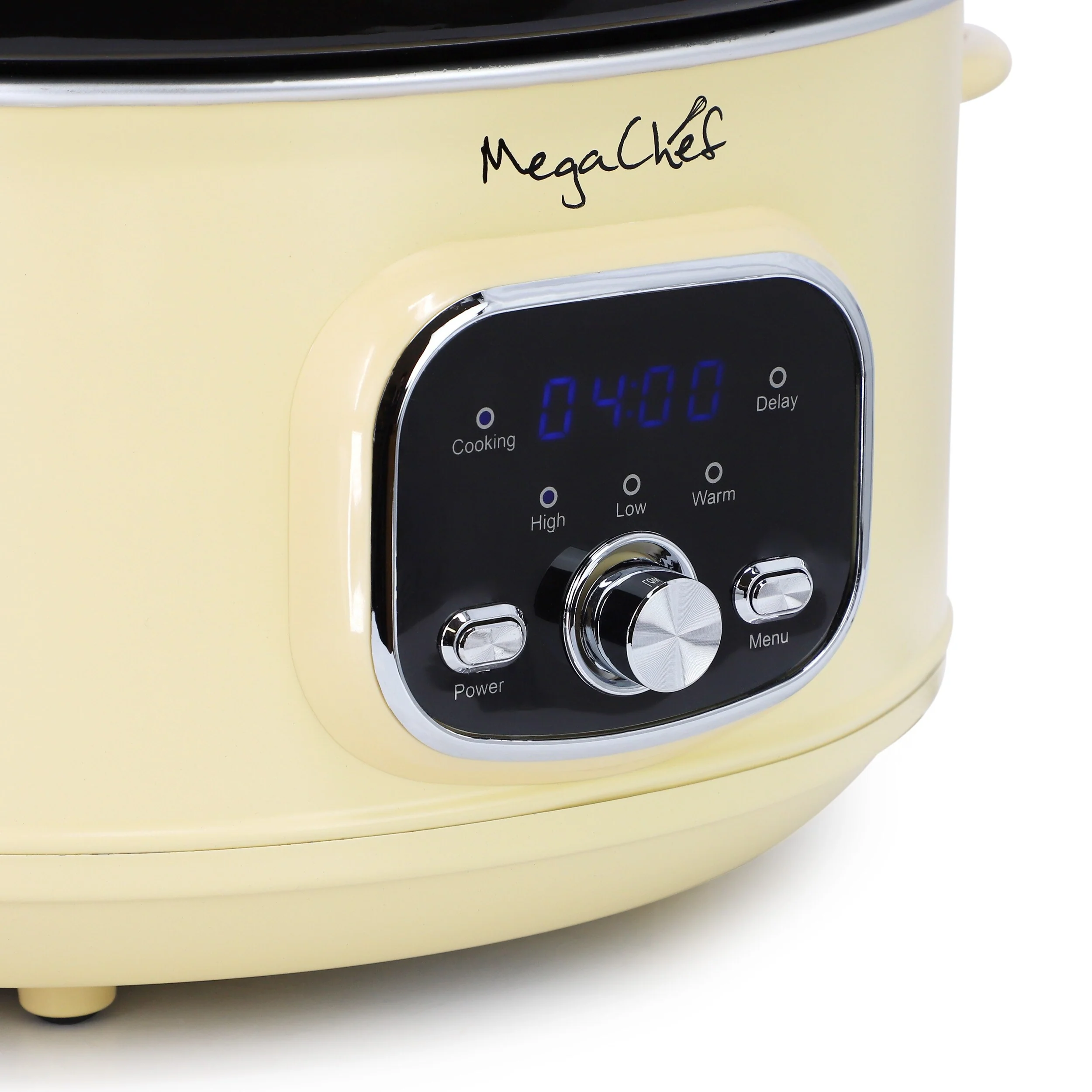 Introducing the MegaChef 3.7 Quart Electric Slow Cooker in Ivory, a stylish addition to any kitchen. This appliance features a removable inner oval ceramic pot in a matching Ivory color, complemented by a modern cream-colored outer shell and panel in the same shade. The digital panel, accented with a soothing Blue light, allows for easy control and monitoring of cooking settings, ensuring precise results with every use.For added convenience and safety, cool-touch handles and knobs in cream color provide a secure grip during handling. The tempered clear glass lid lets you keep an eye on your culinary creations without lifting the lid, preserving heat and flavors. A silver chrome panel at the bottom and edges adds durability and a touch of sophistication.Both the lid and ceramic crock of the MegaChef slow cooker are dishwasher safe, simplifying cleanup after meals. This appliance combines functionality with aesthetic appeal. Whether you’re preparing comforting soups, savory stews, or tender roasts, the MegaChef 3.7 Quart Electric Slow Cooker in Ivory is designed to deliver delicious results effortlessly, making it an essential kitchen companion. Item Dimensions: 9.70" x 13.75" x 10.00"Item Weight: 8.60lbs