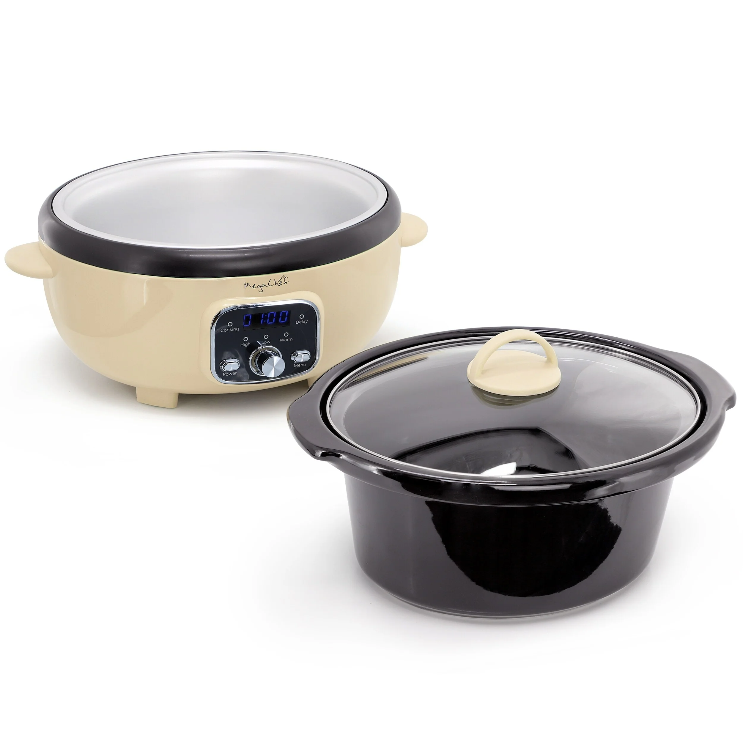 Introducing the MegaChef 3.7 Quart Electric Slow Cooker in Cream, a stylish addition to any kitchen. This appliance features a removable inner oval ceramic pot, complemented by a modern cream-colored outer shell and panel in the same shade. The digital panel, accented with a soothing Blue light, allows for easy control and monitoring of cooking settings, ensuring precise results with every use.For added convenience and safety, cool-touch handles and knobs in cream color provide a secure grip during handling. The tempered clear glass lid lets you keep an eye on your culinary creations without lifting the lid, preserving heat and flavors. A sleek black panel at the bottom and edges adds durability and a touch of sophistication.Both the lid and ceramic crock of the MegaChef slow cooker are dishwasher safe, simplifying cleanup after meals. This appliance combines functionality with aesthetic appeal. Whether you’re preparing comforting soups, savory stews, or tender roasts, the MegaChef 3.7 Quart Electric Slow Cooker in Cream is designed to deliver delicious results effortlessly, making it an essential kitchen companion. Item Dimensions: 15.15" x 10.80" x 9.45"Item Weight: 8.00lbs