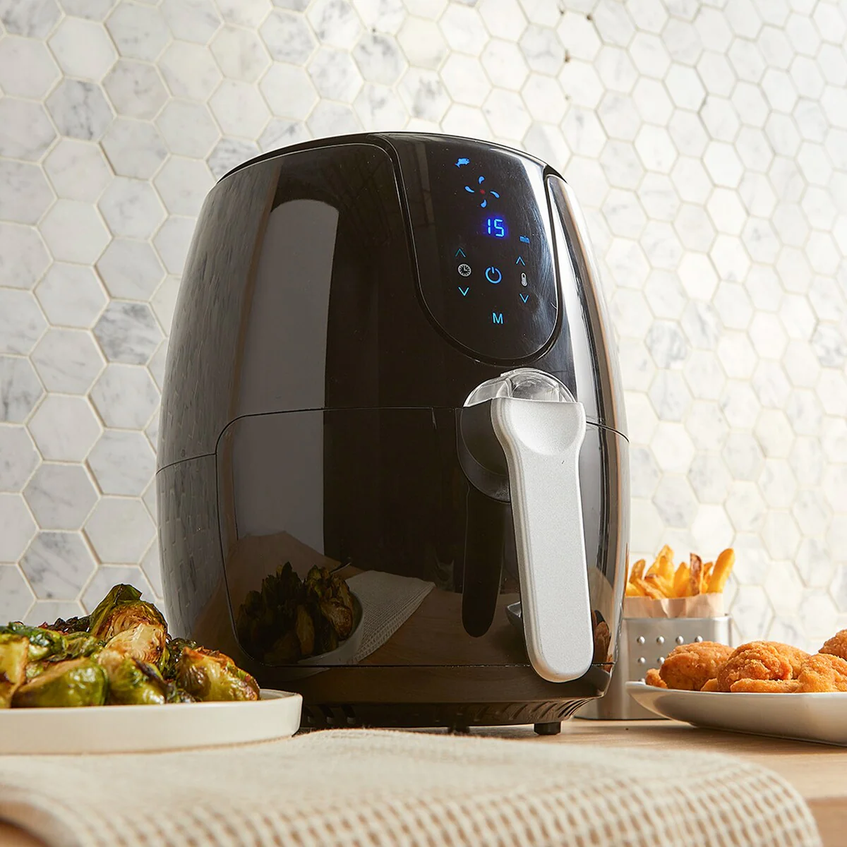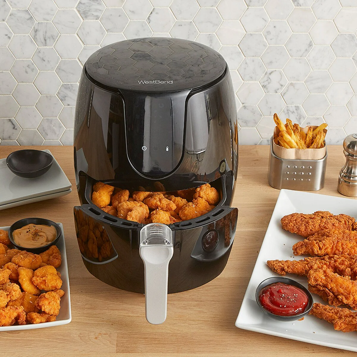 The West Bend 3.7Qt. Digital Air Fryer has a countertop friendly size that is ideal for quick meals, snacks and side dishes. This air fryer is sure to become your family’s go-to favorite appliance for your every day cooking needs. The unique Cyclonic Crisping Technology power crisps your air fryer food with super speed hot air circulation so you get evenly cooked crunchy food every time. Imagine being able to enjoy and indulge in all of your delicious fried favorites without the guilt. Now you can, because the West Bend Digital Air Fryer uses little or no oil in a fast, hot baking cycle. And, any oil that is used, gets caught by the drip pan so you’ll get 75 percent less fat in your cooking than with traditional deep fryers. Nonstick Diamond Shield protective coating on the fry basket provides enhanced durability. The digital controls allow for the temperature to be easily set from 100-400 degrees Fahrenheit. The adjustable timer can be programed from 1-30 minutes. You can also use the 6 one-touch air fryer presets which perfectly set controls for steak, fish, shrimp, chicken, fries and baked items. Includes a dishwasher safe fry basket and rack for quick cleanup.