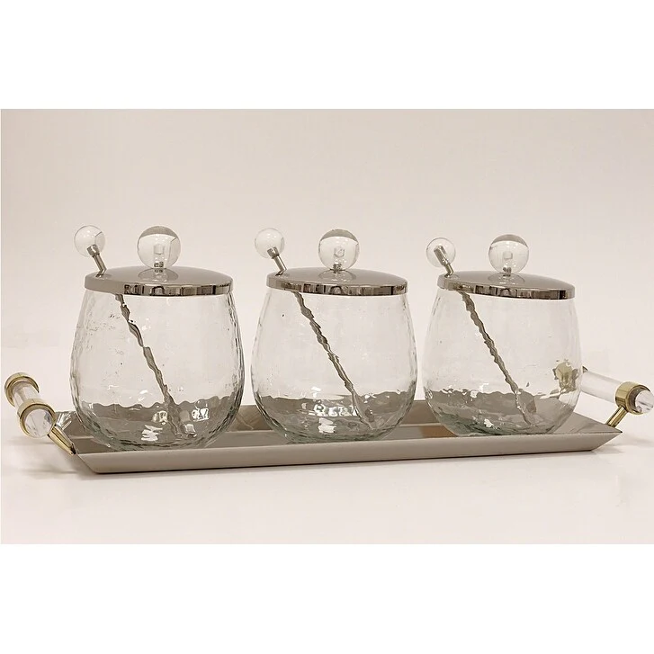Enhance your kitchen storage with the 33 Canisters on Rectangle Tray with with Clear Ball Knobs. This stylish set includes three canisters on a convenient rectangle tray, each featuring a clear ball knob for easy opening. Keep your pantry organized and your ingredients fresh with this functional and elegant addition to your kitchen.