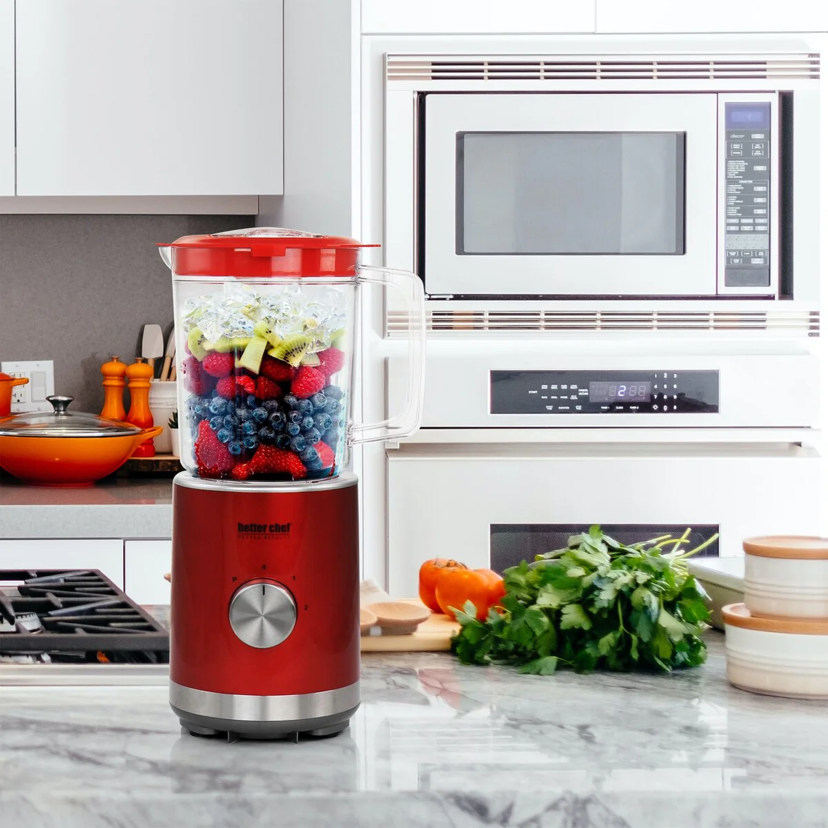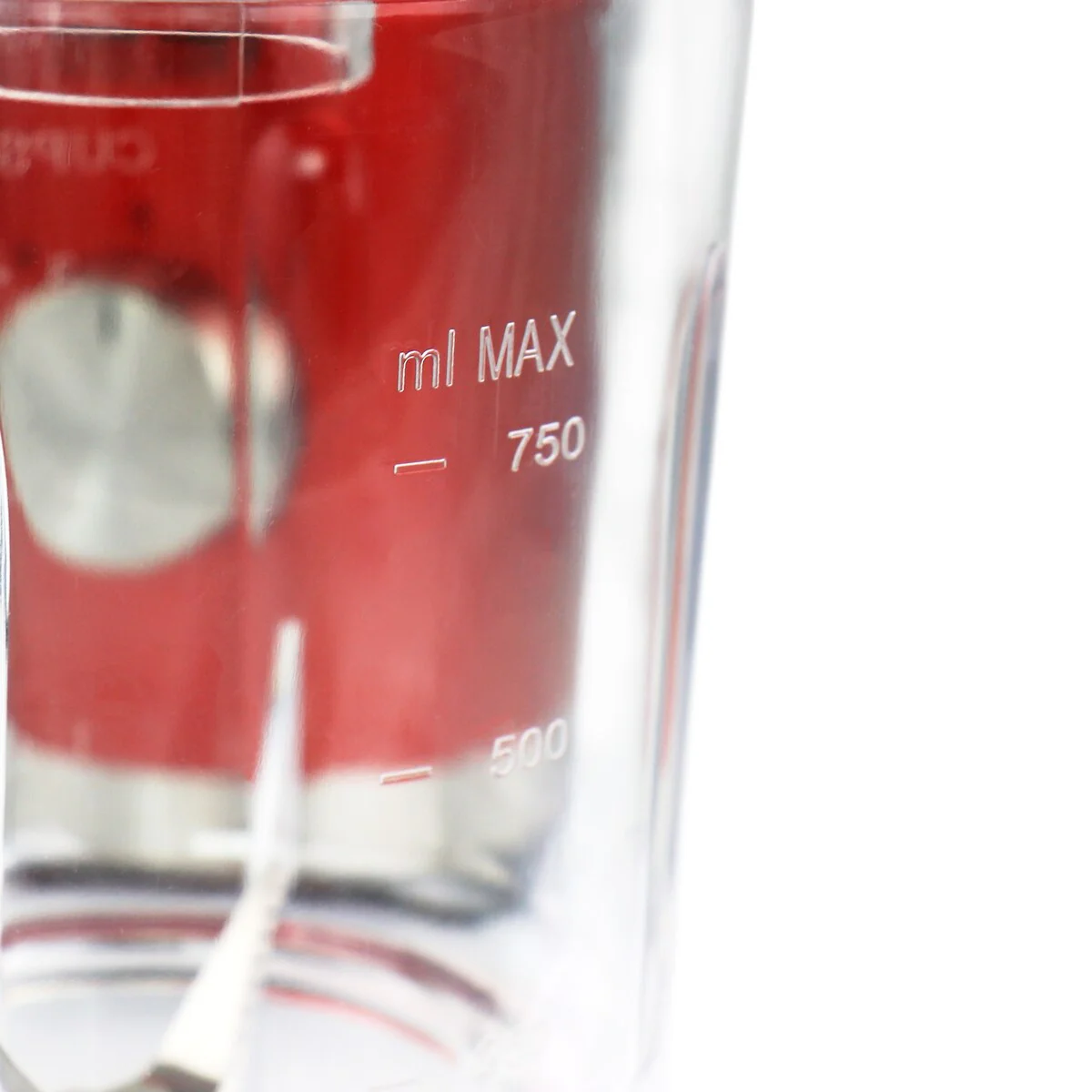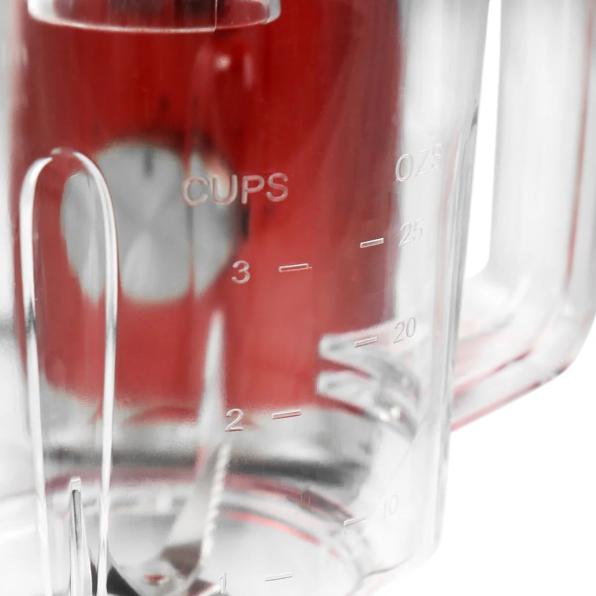 This three cup compact blender is perfect for your daily smoothies or side dish sauces. This blender has a 25 ounce capacity, which is the perfect size for small families and personal use. It’s compact construction allows you to store easily on the countertop or out of the way in a cabinet. Features 300 watts of ice-crushing power and a rotary dial that lets you pulse or blend at low and high speeds. 25 Ounce blender cup is made with BPA-free plastic and the base is made with stainless steel. Hand Wash RecommendedMaterials: BPA-free plastic and Stainless SteelHand Wash RecommendedColor: RedHigh and Low Speeds with Pulse OptionRotary Control Dial300 Watt PowerAC 120V / 60Hz 300W25 fl Oz or 3 Cup capacityNon Slip Rubber FeetTwist and Seal Lid with Removable Middle PieceSet Includes:One 25oz Blender Cup with built in bladeOne Plastic Lid with Removable Middle PieceOne Stainless Steel BasePer Item Measurements:Blender Cup: 6.5in length with handle, 4.5in diameter, 7.4in height, 25oz capacityBase: 4.5in diameter, 6.25in heightFull Blender: 6.5in length, 4.5in width, 11.9in height,28in power cable