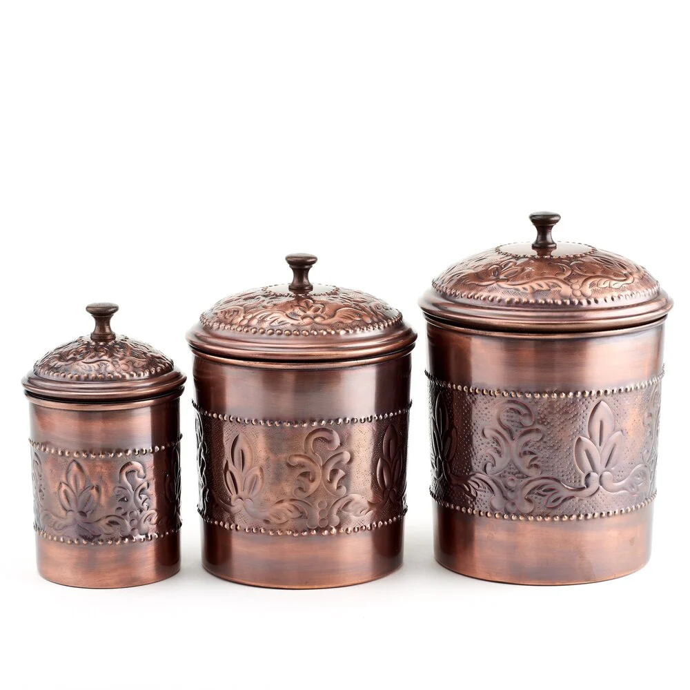 3 Piece Antique Copper "Victoria" Embossed Canister Set 5.5 Qt., 4 Qt., 3 Qt.