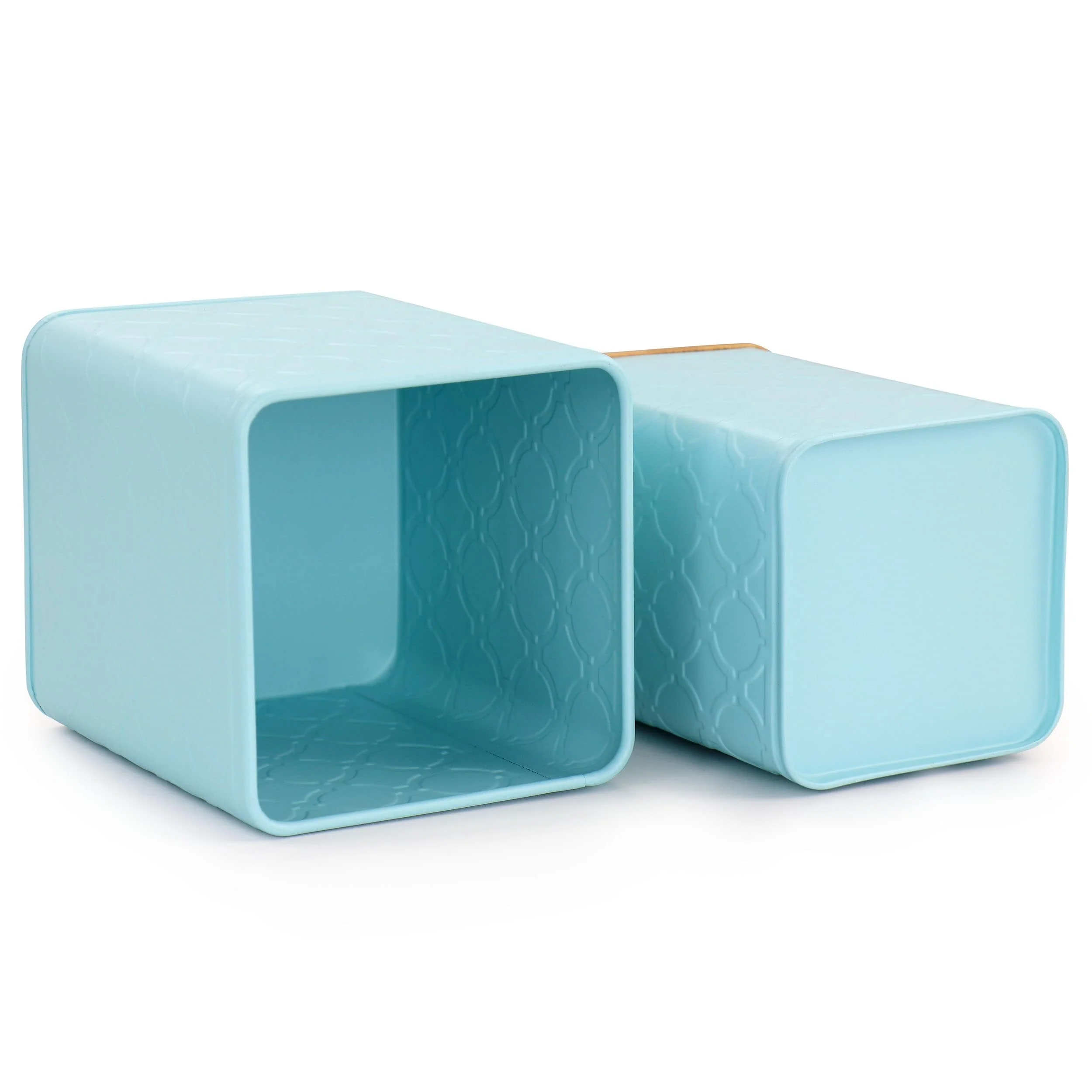 Keep your kitchen neat and organized with this food storage and organization 3 piece canister set by MegaChef. Assorted sizes are perfect for separating your countertop essentials. Organize your coffee, tea, sugar, flour, rice, pastas, or anything in between! Each canister has an embossed alternating diamond and circle pattern design with a matte finished, adding a pop of color to your kitchen decor. Bamboo lids keep an air tight seal when closed, locking in freshness. Lightweight iron squared canisters are powder coated in turquoise and are durably made for long lasting use. Set includes on 6.3in canister, one 5.51in canister, and one 5.31in canister for varied uses. Item Dimensions: 5.51" x 5.51" x 6.30"Item Weight: 2.25lbs
