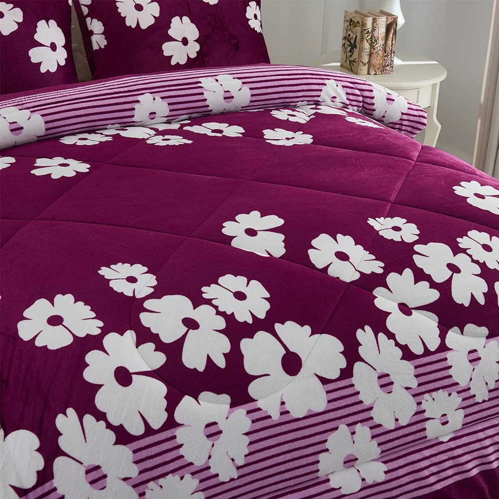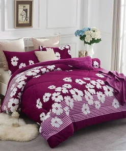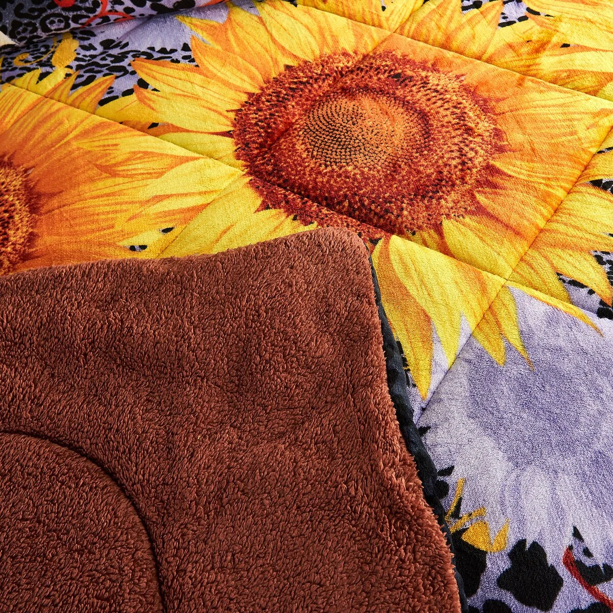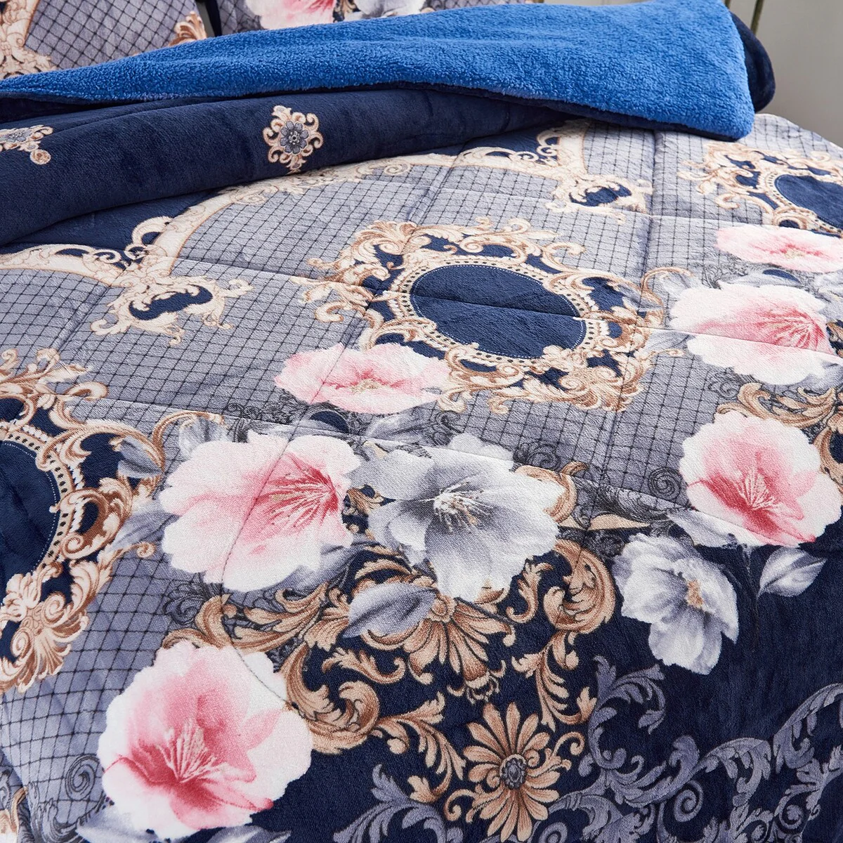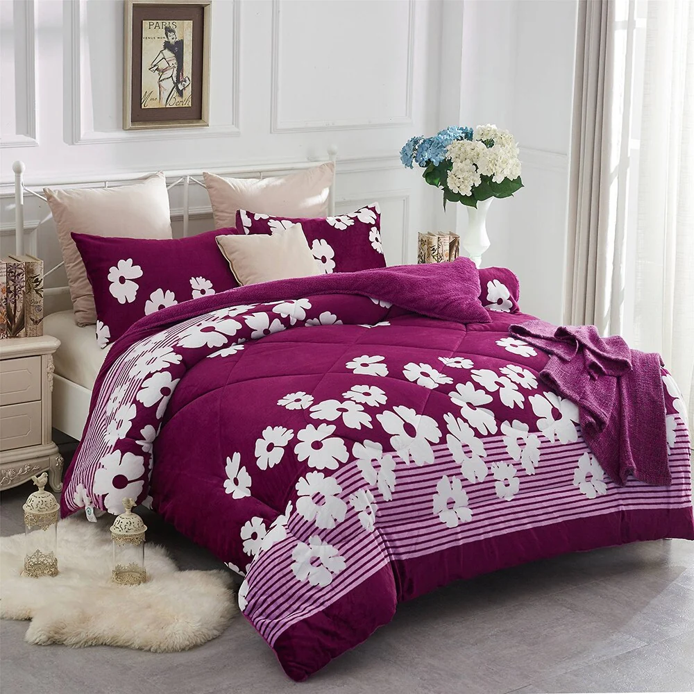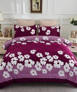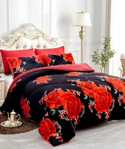 Update your bedroom decor with this cozy and stylish 3-piece floral printed sherpa-backing reversible comforter set. Available in three different patterns and sizes, this set includes a plush sherpa blanket and two pillow covers, providing the perfect combination of comfort and style. The reversible design allows you to switch up your bedroom look effortlessly. Whether you need to stay warm on a chilly spring morning or cozy up on a frosty winter night, this comforter set has got you covered.