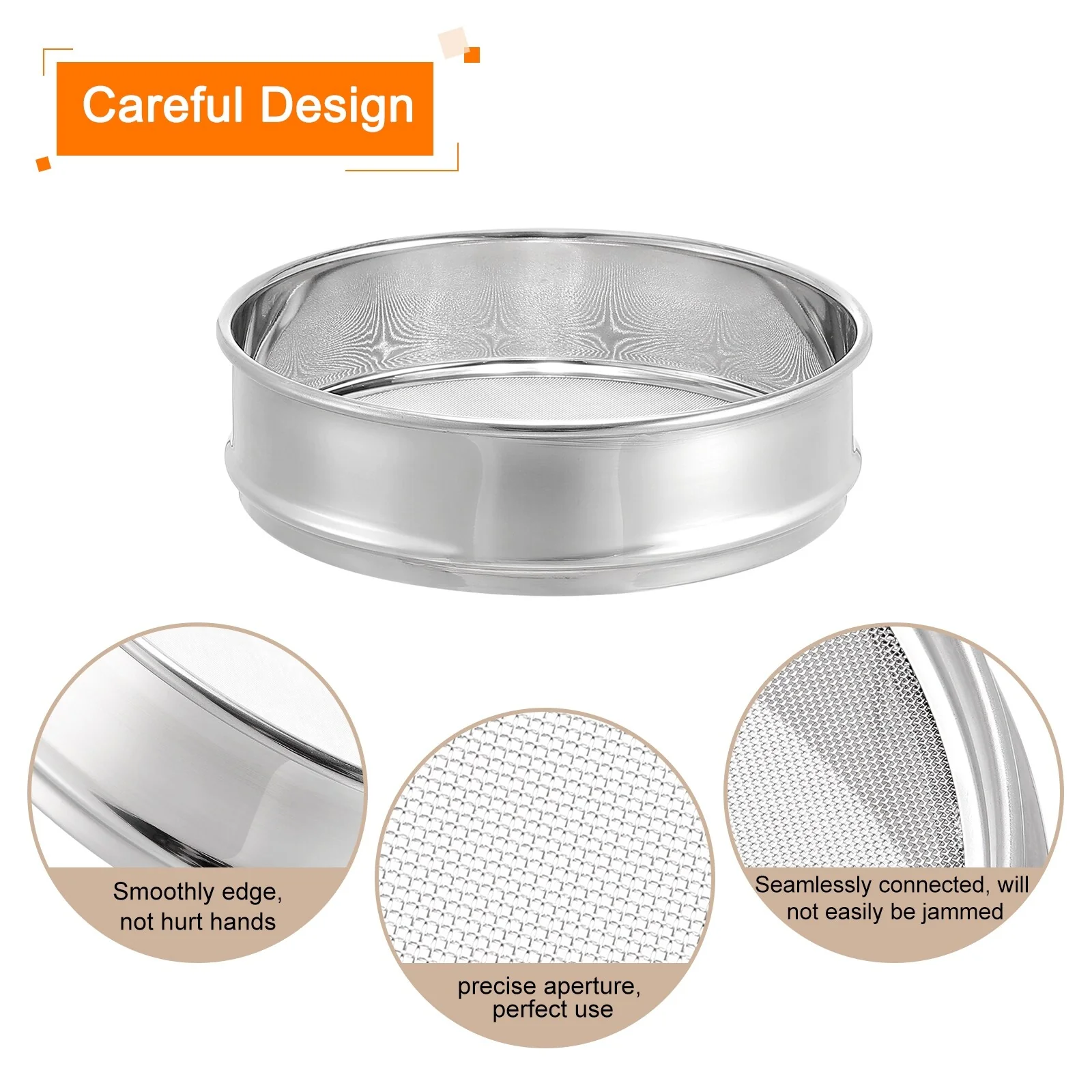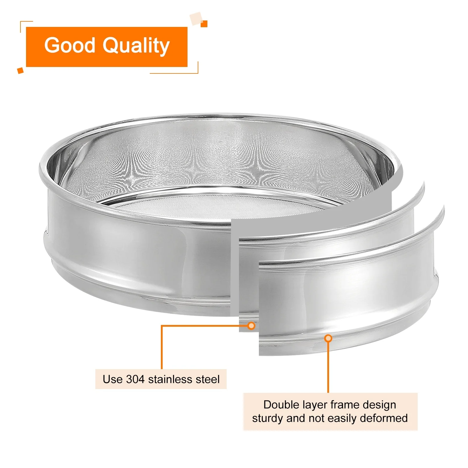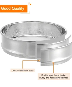 Use double layer frame design, all use 304 stainless steel, strong and sturdy and not easily deformed can bear weight up to 220 pounds, the screen mesh is made of standard 304 stainless steel, with precise aperture, flat and not easy to fall off
