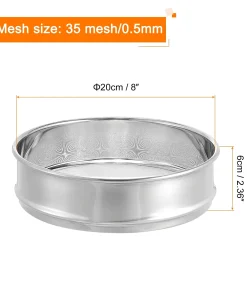 The size for this lab sieve is 35 mesh, 20cm/8" diameter, 6cm/2.36 height