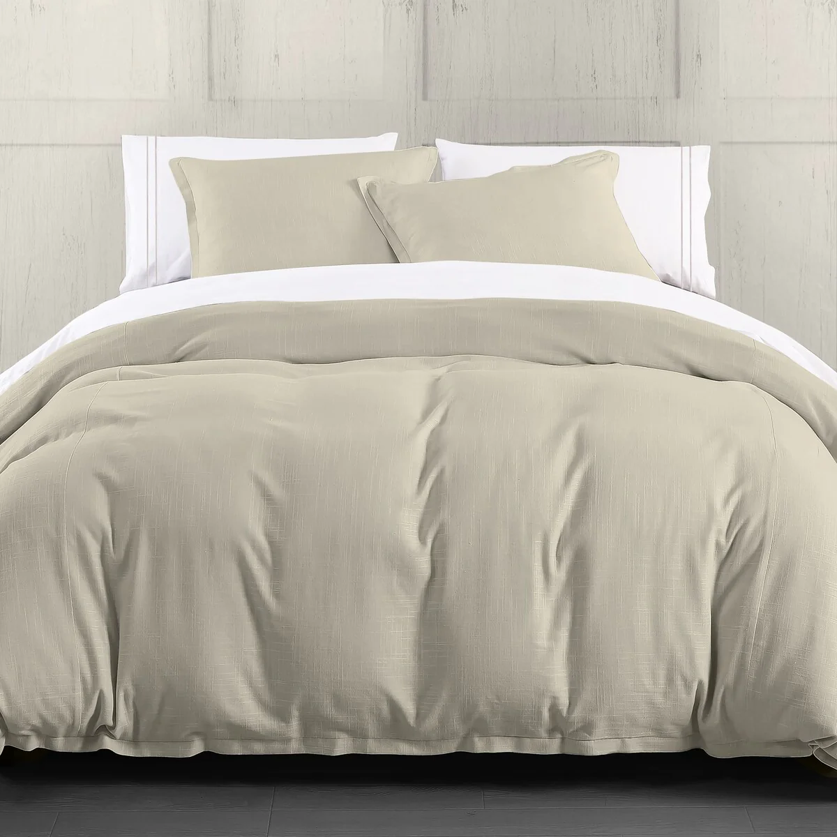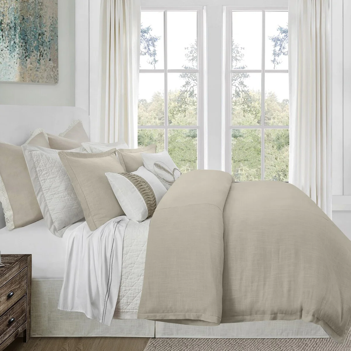 Give your bed a cozy, comfy feel with the Hera collection. The Hera 3PC Duvet set, in light tan, adds a soft, casual touch to your bed, perfect for a contemporary look by itself, or can be layered for a more designer look and feel with our stone wash velvet quilts. The Hera offers a versatile addition to your bedding, perfect for any bedroom in your home. Super Queen Duvet cover measures 92" x 96", Standard Shams measures 21"x27". Insert available separately. Material: Face:70% Viscose, 30% Linen. Back:100% Cotton. Care: Dry clean only. Imported.