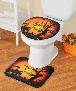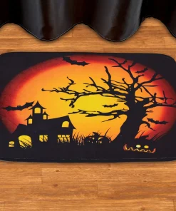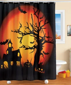This spooky bathroom set is the perfect way to decorate your bath for the season! The scene features a haunted house, jack-o-lanterns and a tree with bats flying against an orange and yellow background. This festive 4-piece set includes a shower curtain, bath mat, contour toilet rug and toilet seat cover. Shower curtain includes 12 plastic hooks for easy hanging. Cushioned rugs have skid-resistant backings. Machine wash. Polyester; imported. Shower Curtain: 71"L x 71"W, Bath Mat: 17 3/4"L x 28 3/4"W, Contour rug: 17"L x 15"W, Seat cover: 16"L x 15 1/4"W. 4-Piece Set.