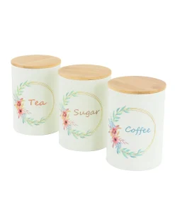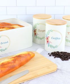 Keep your kitchen organized and your ingredients fresh with this 4 Piece Iron Canister Set With Bread Box in White. This matching set holds your tea, coffee, sugar, and bread in style and will keep your items fresh with the tight and secure bamboo construction lids. The vibrant and classic floral print pattern decal looks beautiful and timeless in just about any kitchen setting.