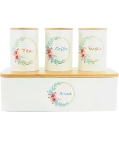 Keep your kitchen organized and your ingredients fresh with this 4 Piece Iron Canister Set With Bread Box in White. This matching set holds your tea, coffee, sugar, and bread in style and will keep your items fresh with the tight and secure bamboo construction lids. The vibrant and classic floral print pattern decal looks beautiful and timeless in just about any kitchen setting.