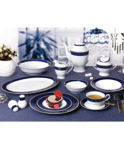 Impress your guests and elevate your dining experience with this stunning 57-piece bone China dinnerware set in midnight blue and gold. Perfect for hosting dinner parties, this set includes everything you need for service for 8 people. Crafted with the highest quality bone China and porcelain, this set is oven safe up to 350 degrees and features luxurious banded navy and gold patterns that add sophistication to any table setting.