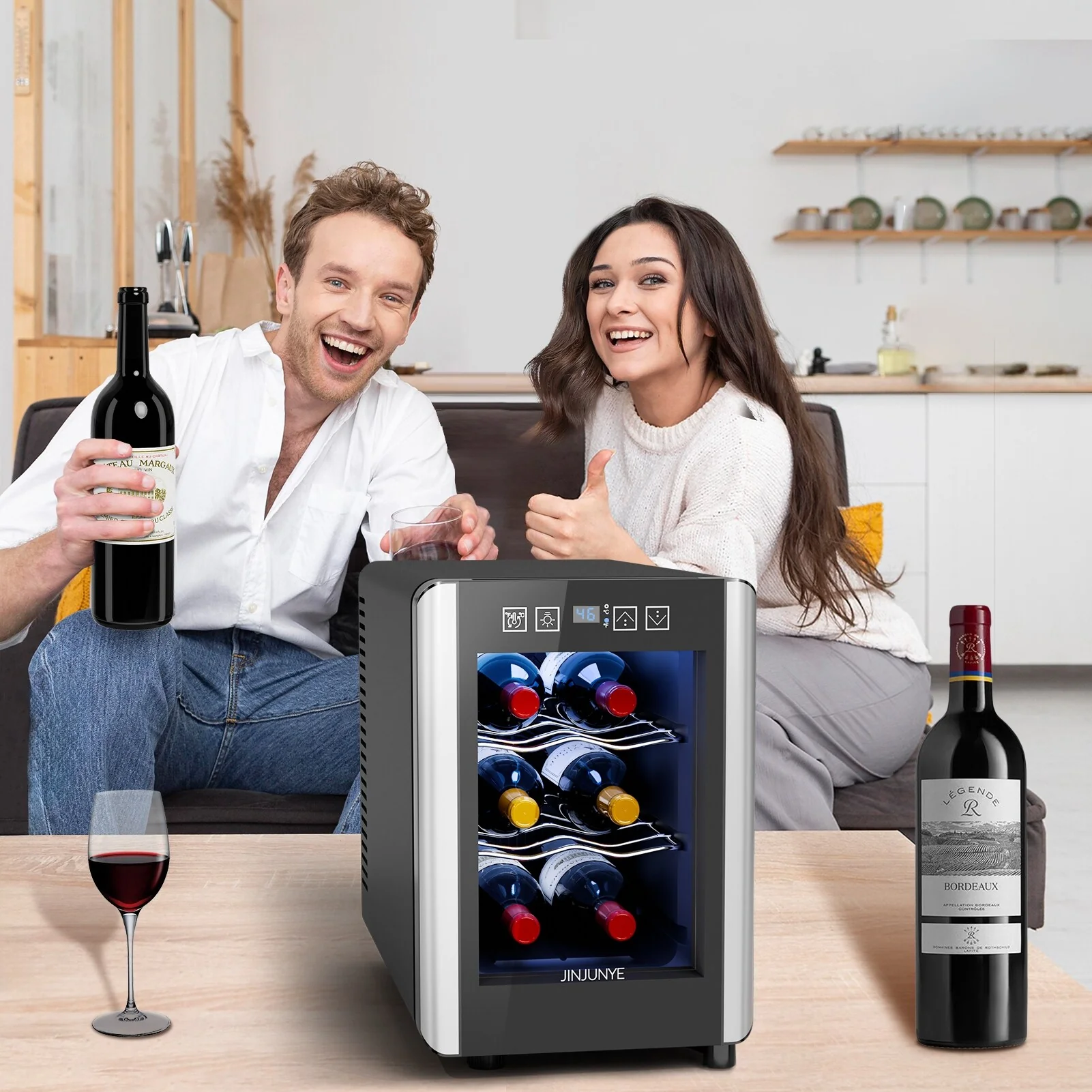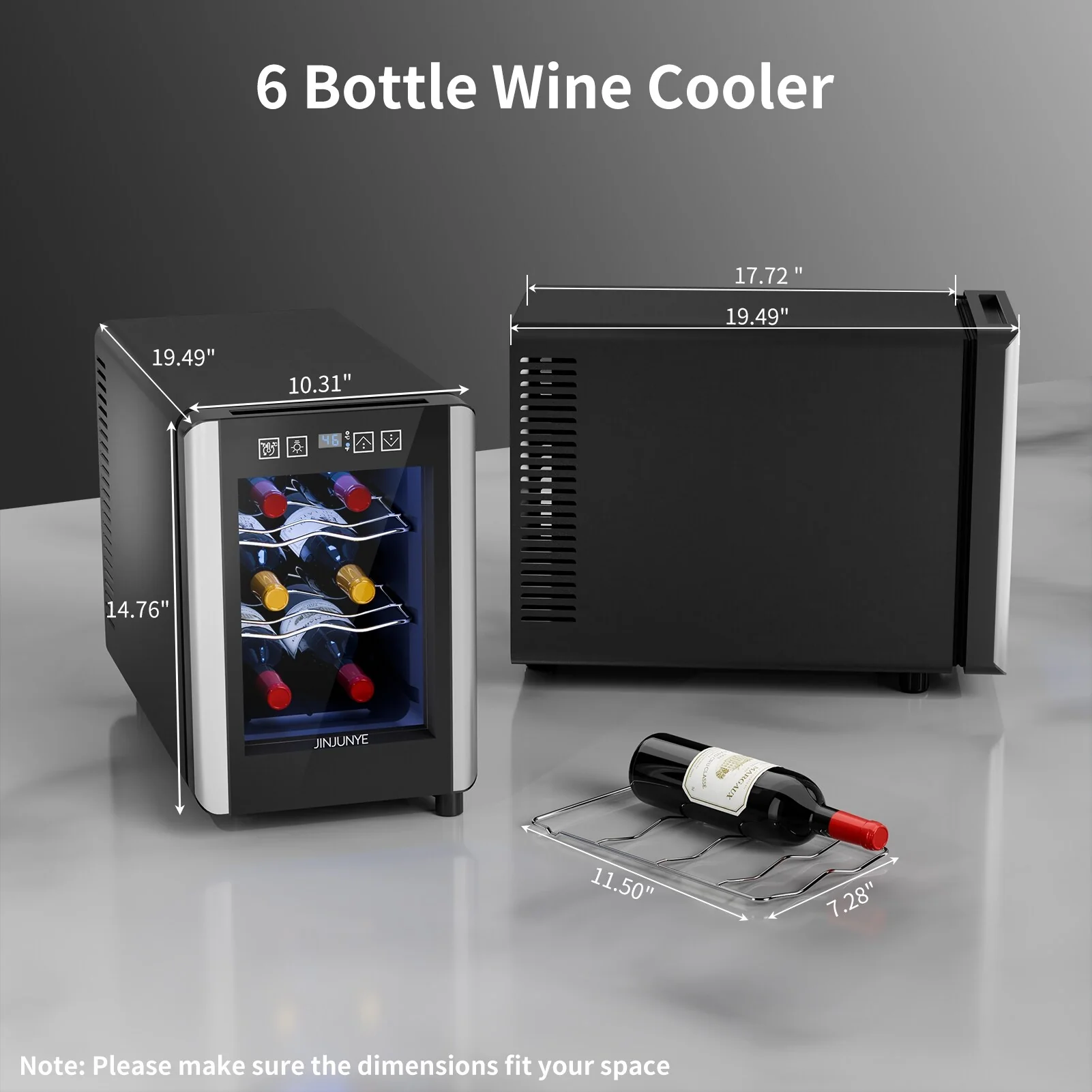 This 6 – bottle wine cooler is a sleek, modern appliance designed for wine enthusiasts with limited space. Its compact design, featuring a black body with silver accents and a glass door, makes it an elegant addition to any home setting, be it a kitchen counter, living room side table, or office break room.