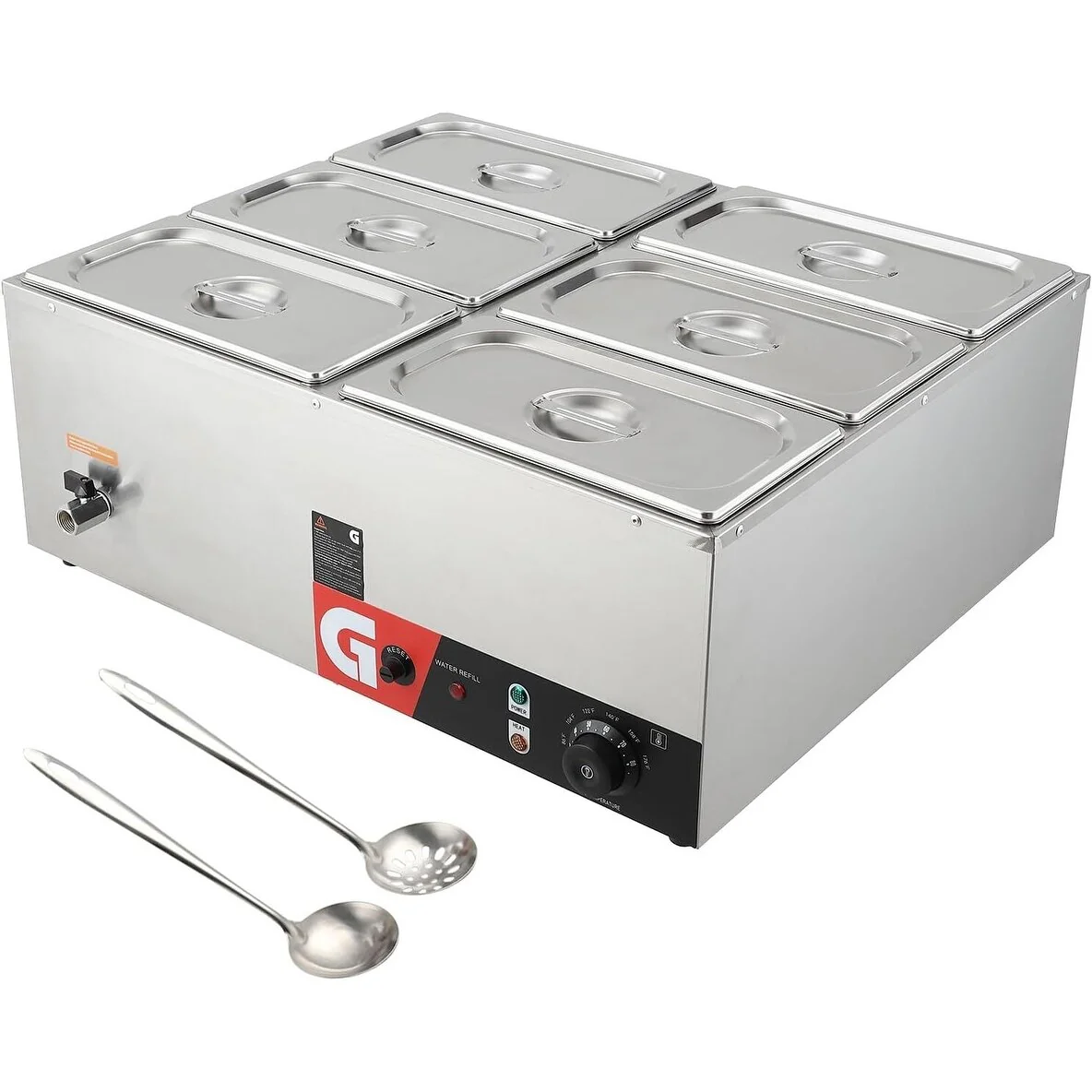 User-Friendly Design: This food warmer is designed with convenience in mind, featuring a faucet for simple water drainage, water level markers for easy monitoring, and extra-long ladles for efficient serving. These user-friendly elements streamline operation and simplify post-service cleaning.