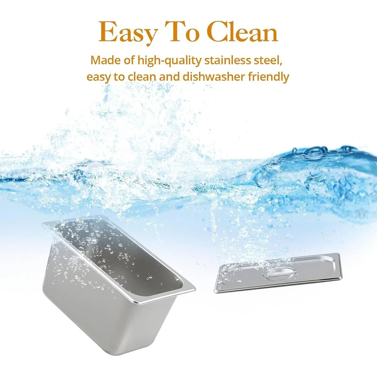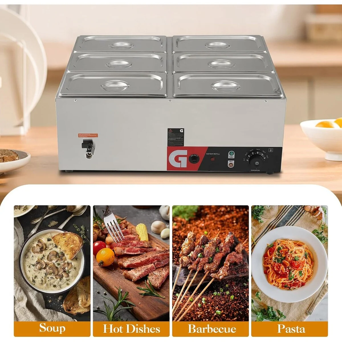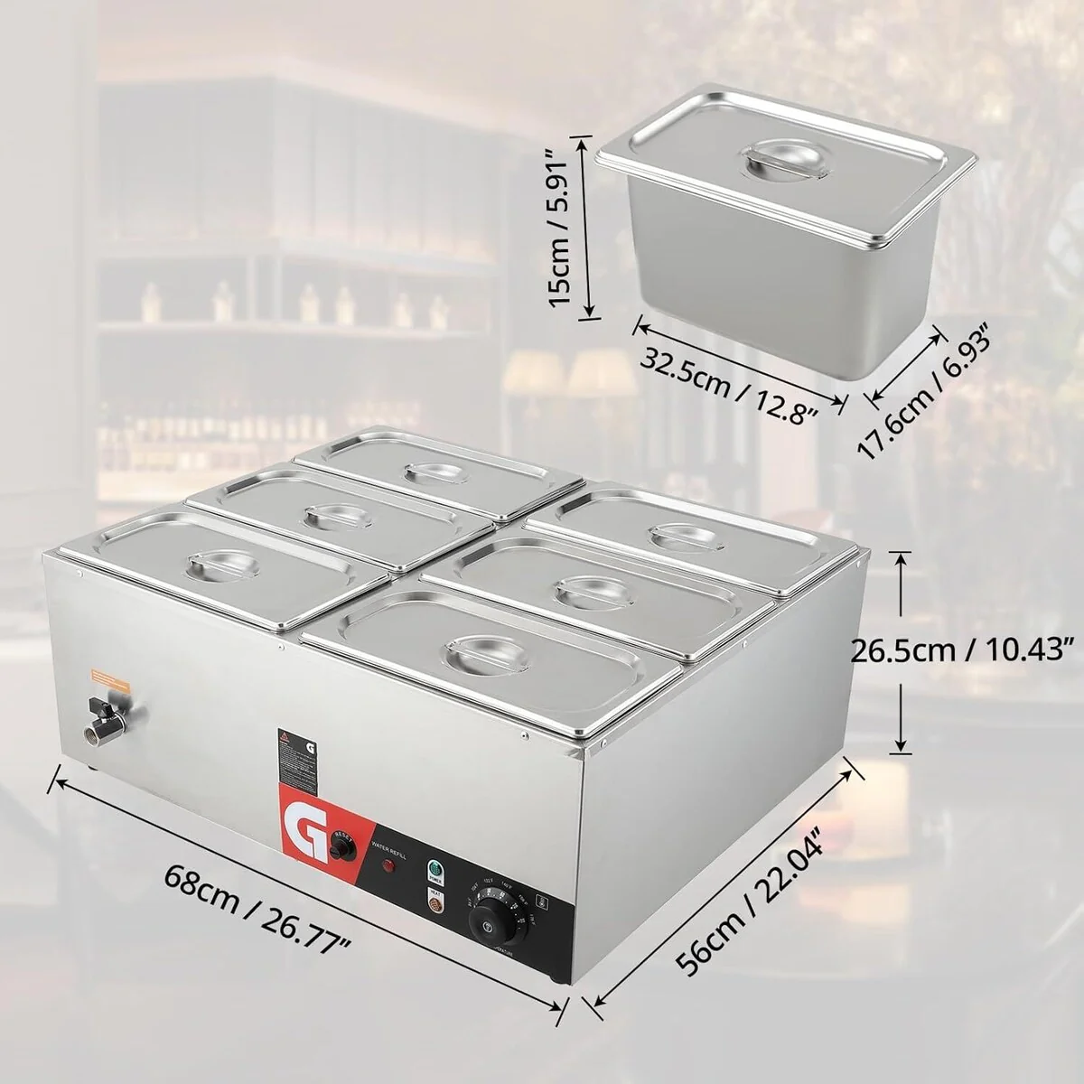 Generous Capacity: The 6-Pan Commercial Food Warmer comes with six electric steam table pans, each measuring 12.8" x 6.9" x 5.9". This spacious design allows you to serve a variety of dishes simultaneously, making it perfect for catering events, buffets, and large gatherings.