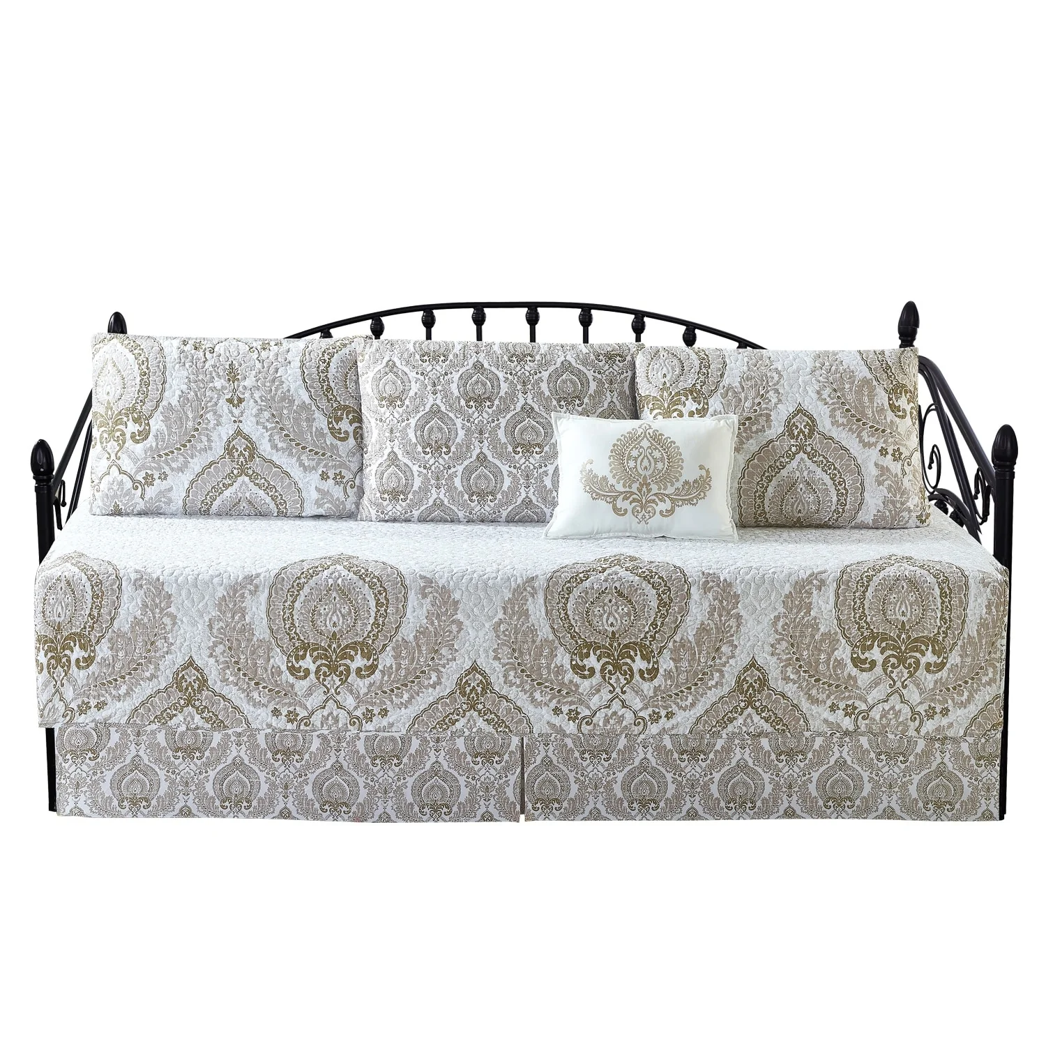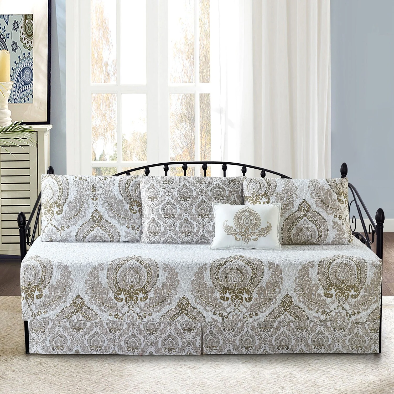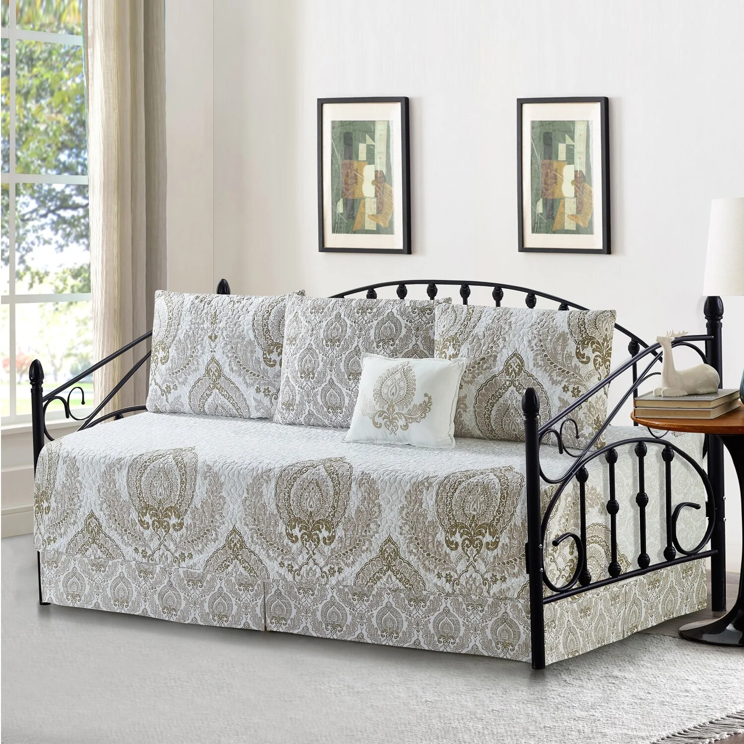 - Set includes 6 pieces: daybed cover, 2 pillow shams, decorative pillow, and bed skirt