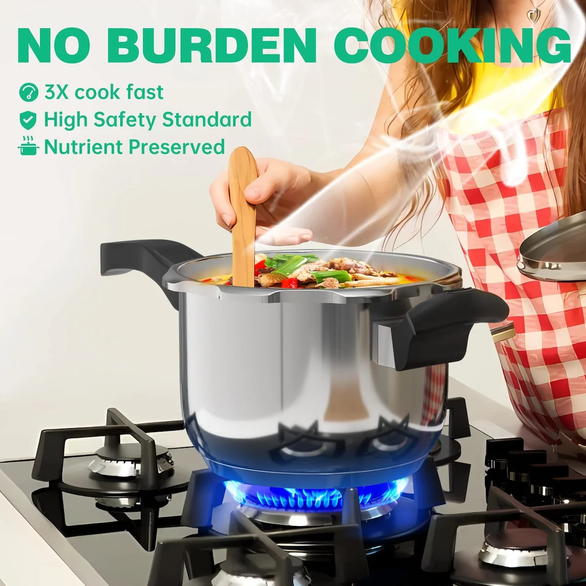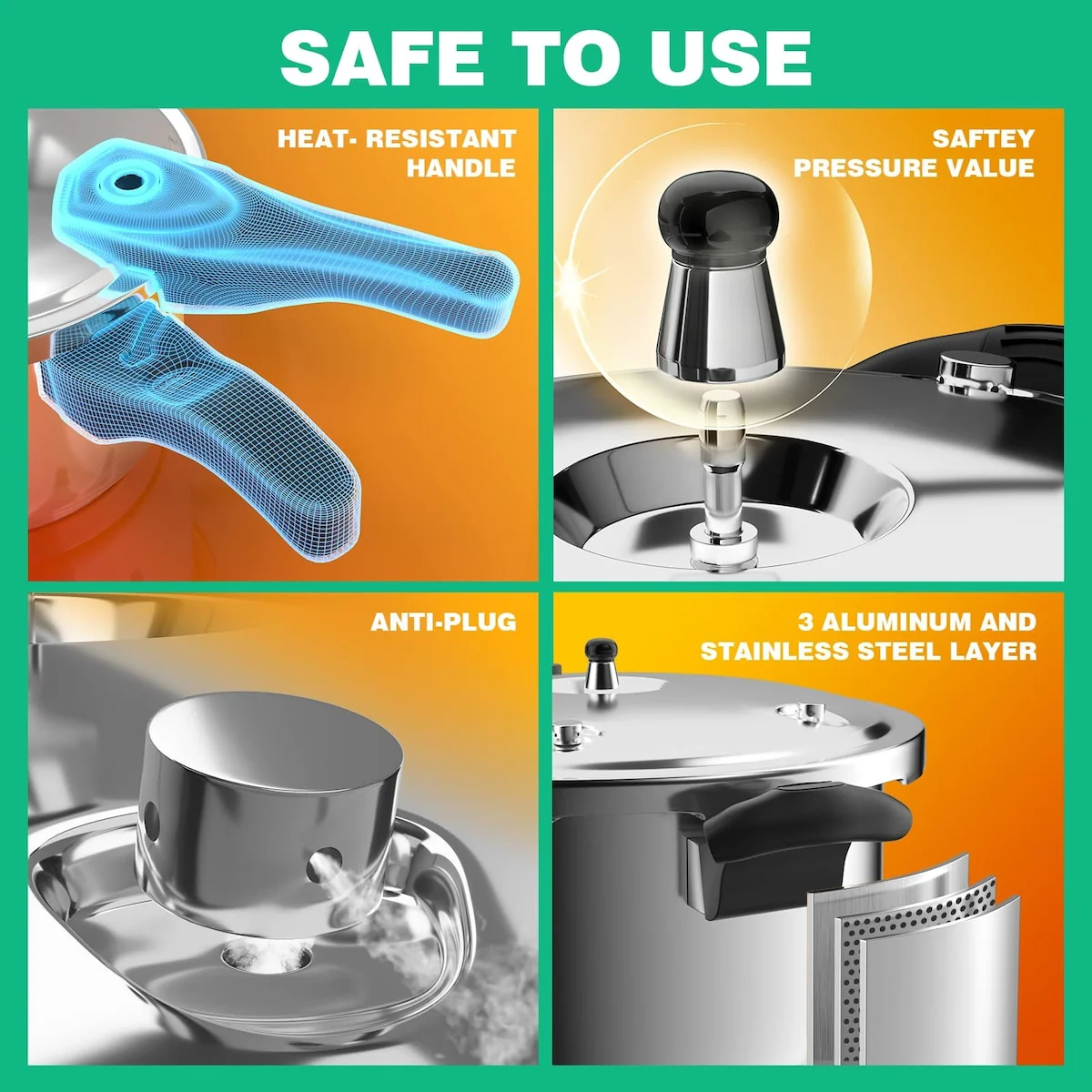 SAFE & DURABLE: The pressure cooker equips multiple safety struction: pressure indicator valve, emergency pressure relief safety device and pressure limiting valve, over pressure gasket release window, a secure locking mechanism to ensure risk-free opening and closing.