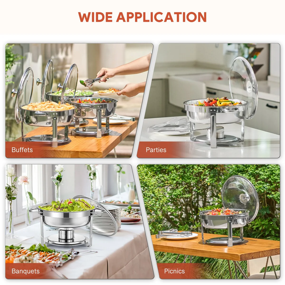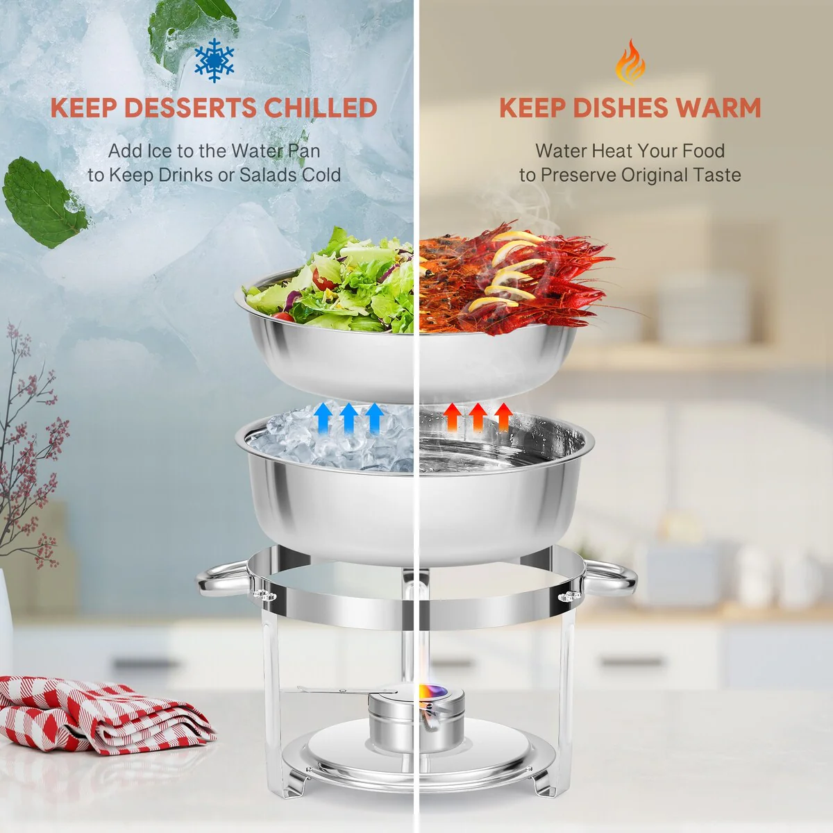 Get ready to wow every guest at your table with our chafing dish buffet set. With its generous 6 qt. capacity, it keeps the food flowing and the party going strong. But that’s not all—this chafing dish set does double duty by keeping your dishes warm and your desserts or drinks chilled. Crafted from sturdy stainless steel, our buffet chafer set makes cleanup a breeze and keeps your culinary creations safe for all to enjoy. Plus, the clear glass lid allows you to sneak a peek at the mouthwatering dishes inside. Whether it’s a wedding, a party, or just a fun get-together, this round chafing dish set has got you covered!
