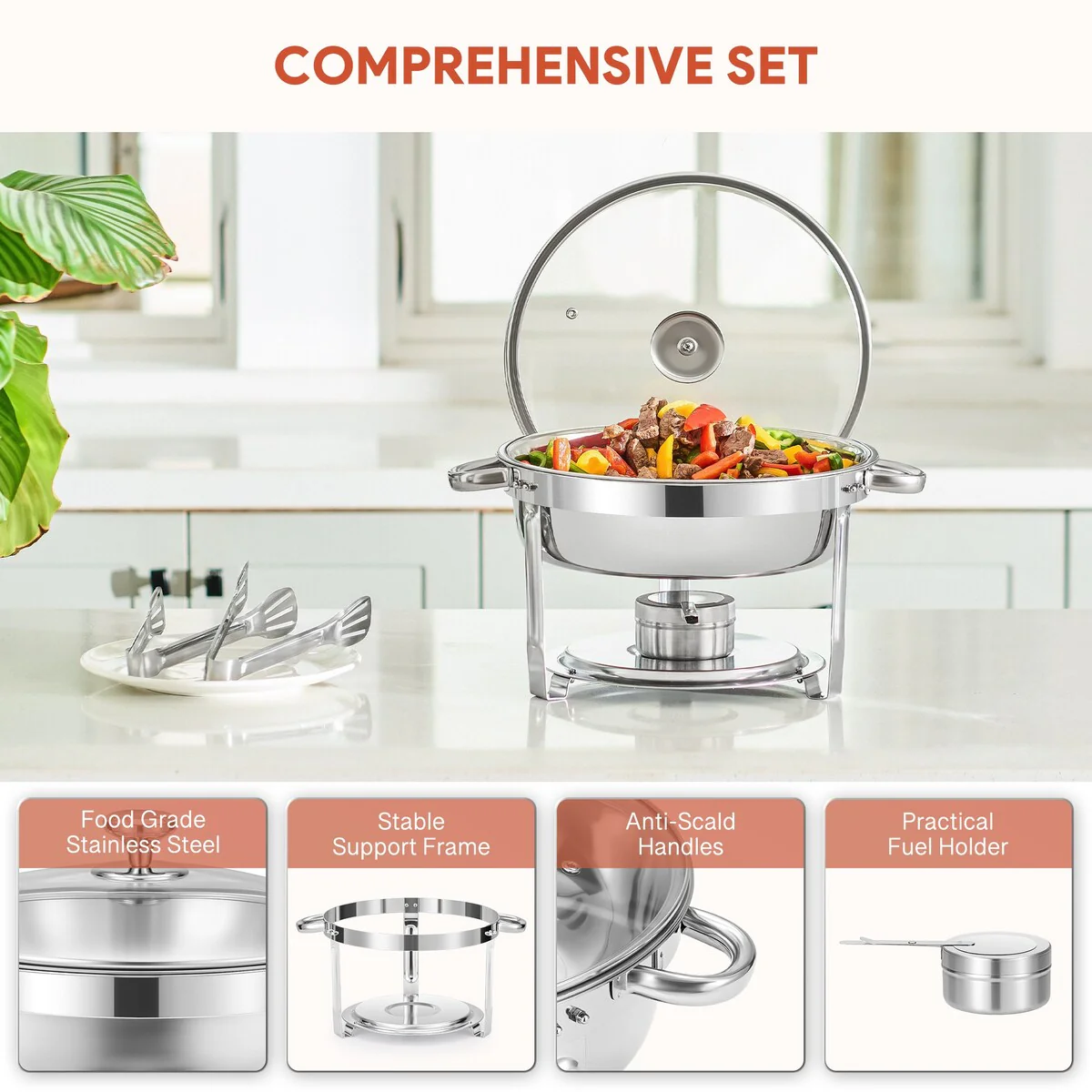 6 qt Stainless Steel Round Chafing Dish Buffet Set for Catering