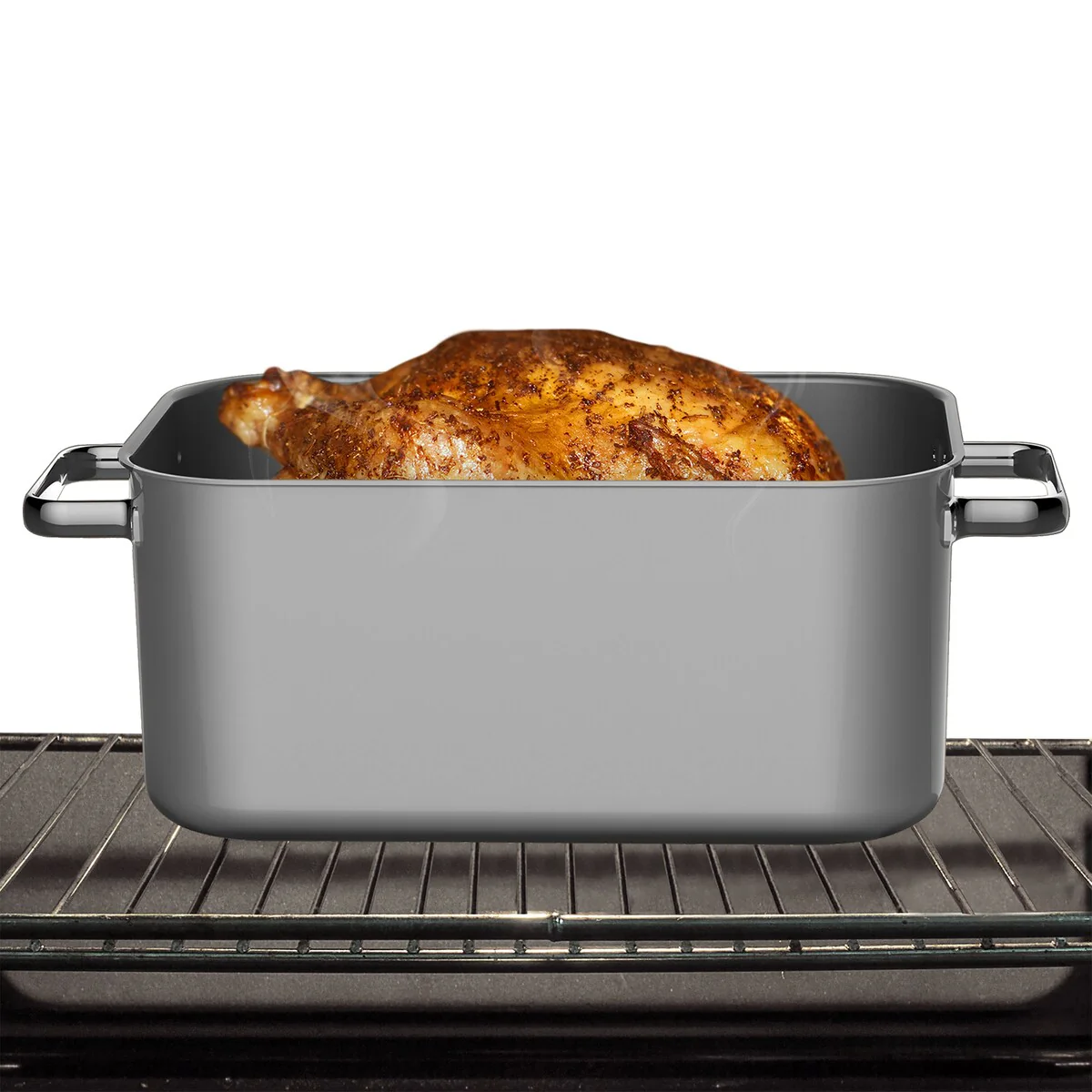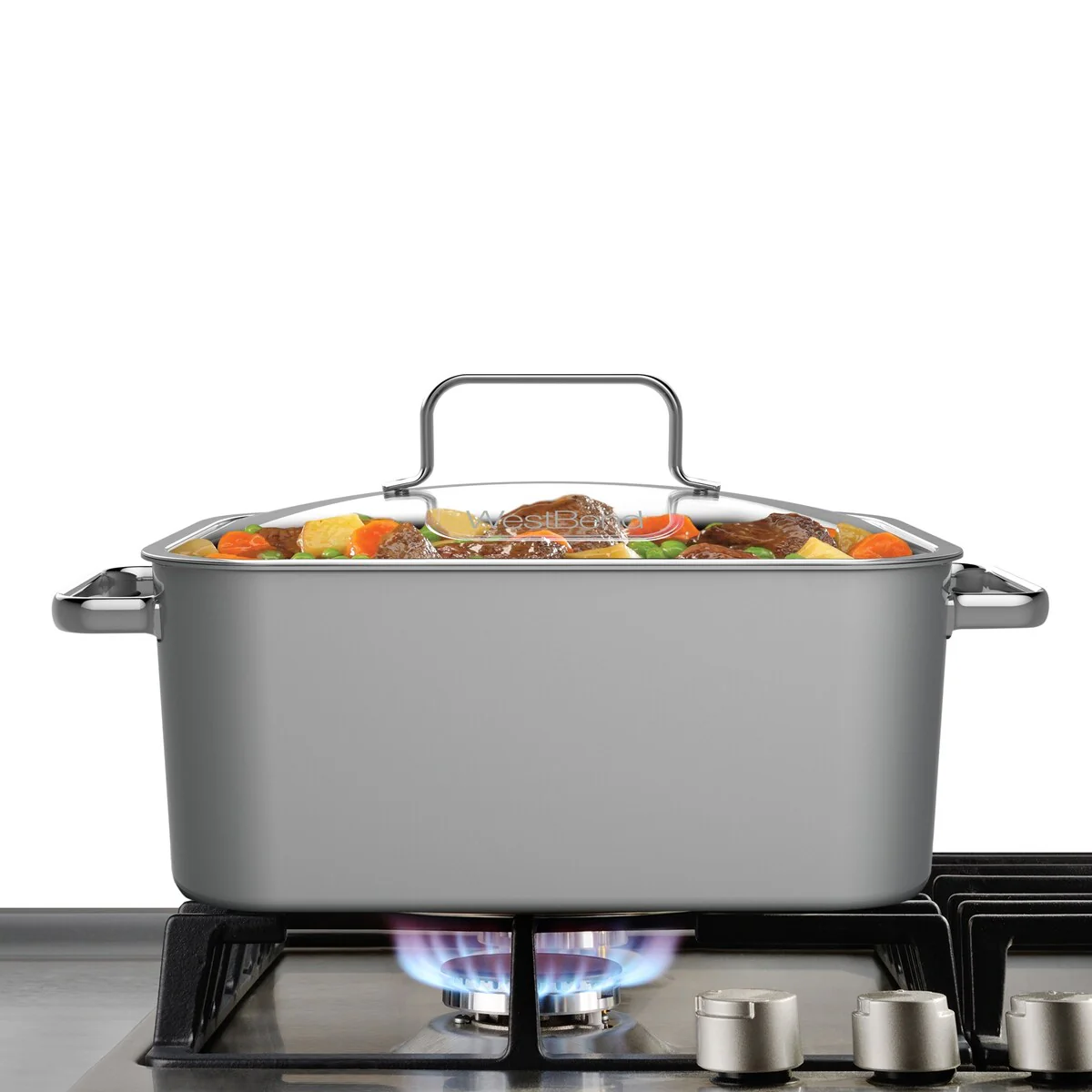 - 6-quart oblong cooking vessel doubles as serving dish for added convenience