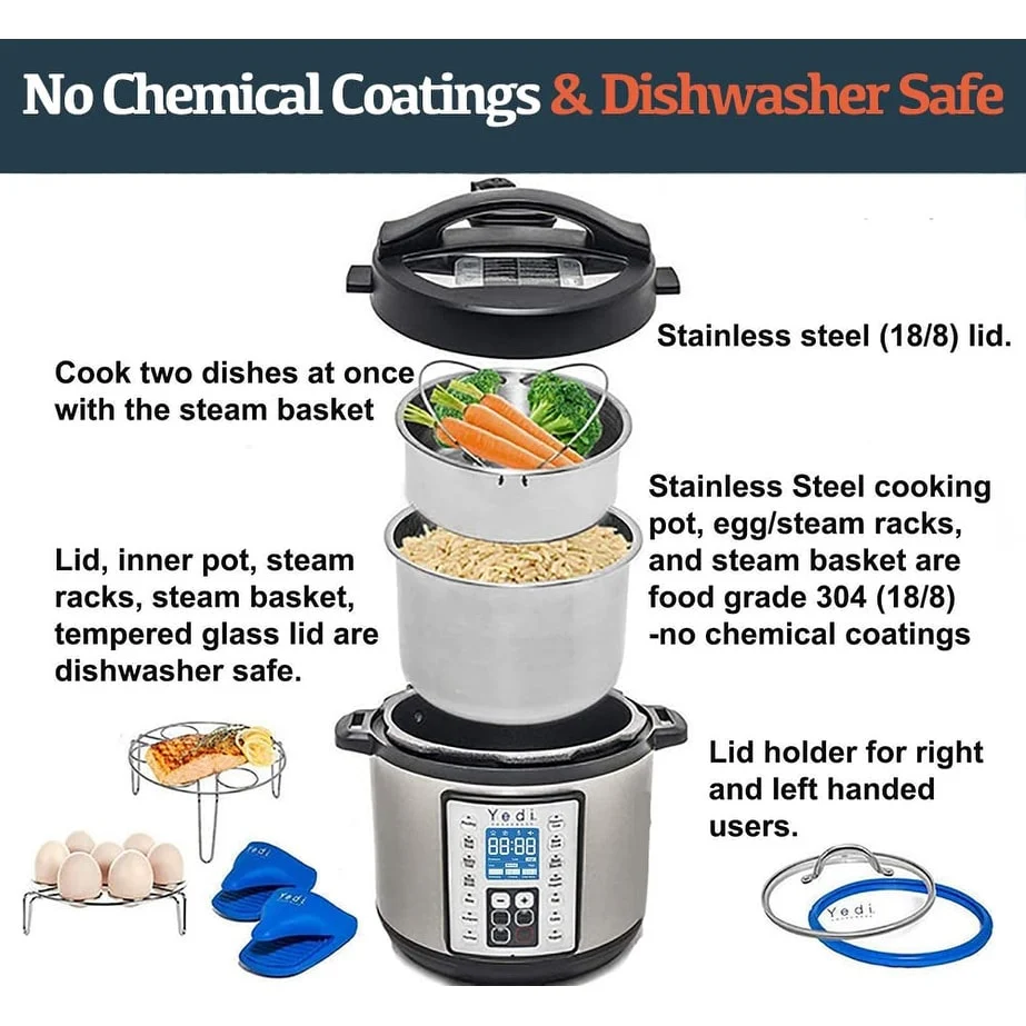 DELUXE ACCESSORY KIT: Included is a tempered glass lid (perfect for slow cooking and sautéing) 2 egg racks/steaming trivets, ladle, rice paddle, cooking mitts, extra silicone sealing ring, stainless steel steaming basket, stainless steel inner cooking pot and a measuring cup  Â