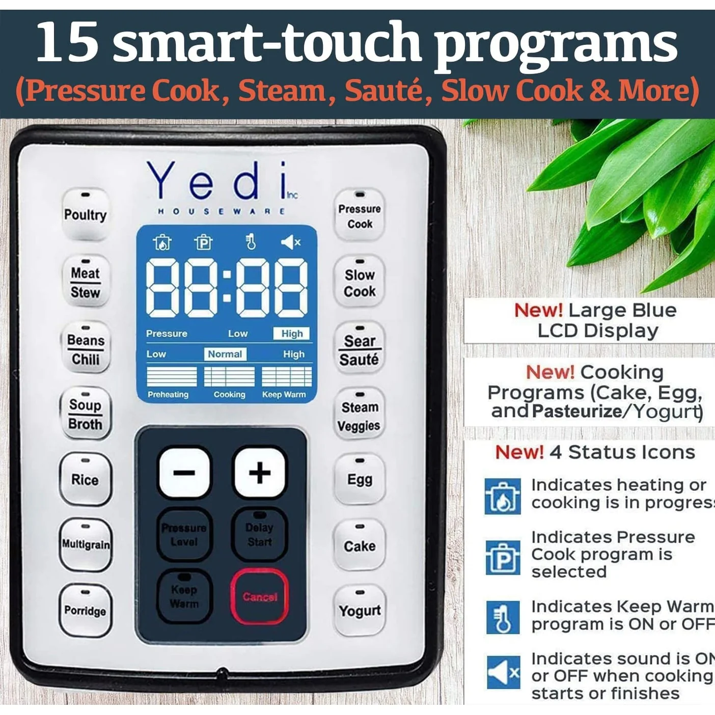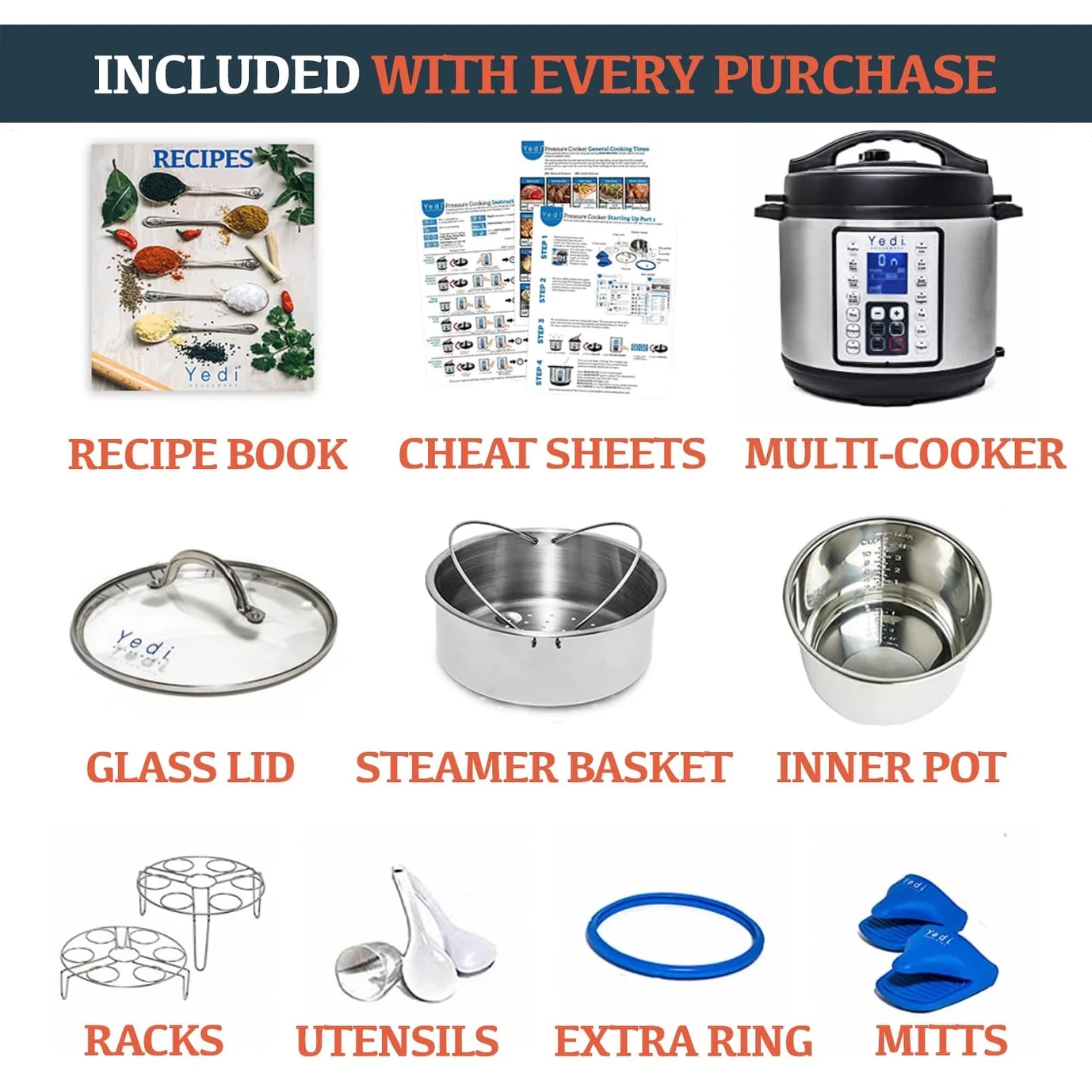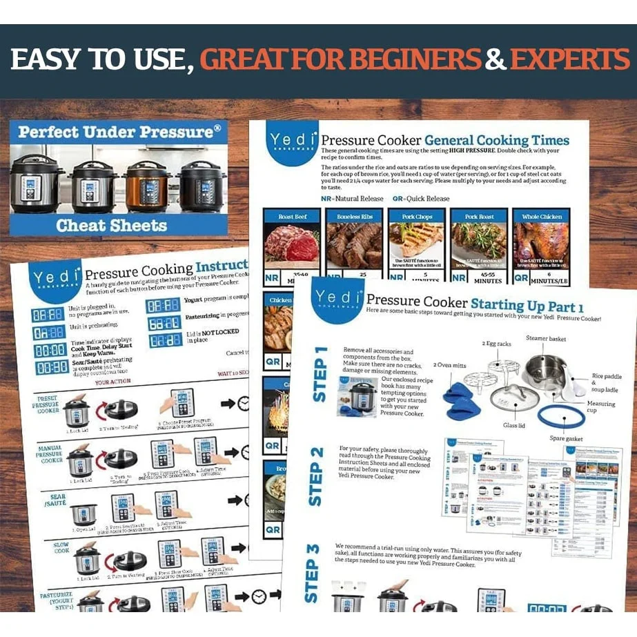 EDUCATIONAL MATERIALS INCLUDED: With every Yedi Total Package Pressure Cooker is a Recipe Book, Cooking Time Tables, and easy to use Cheat Sheets to assist in all cooking endeavors. The User Manual is available for download in Spanish and French too!