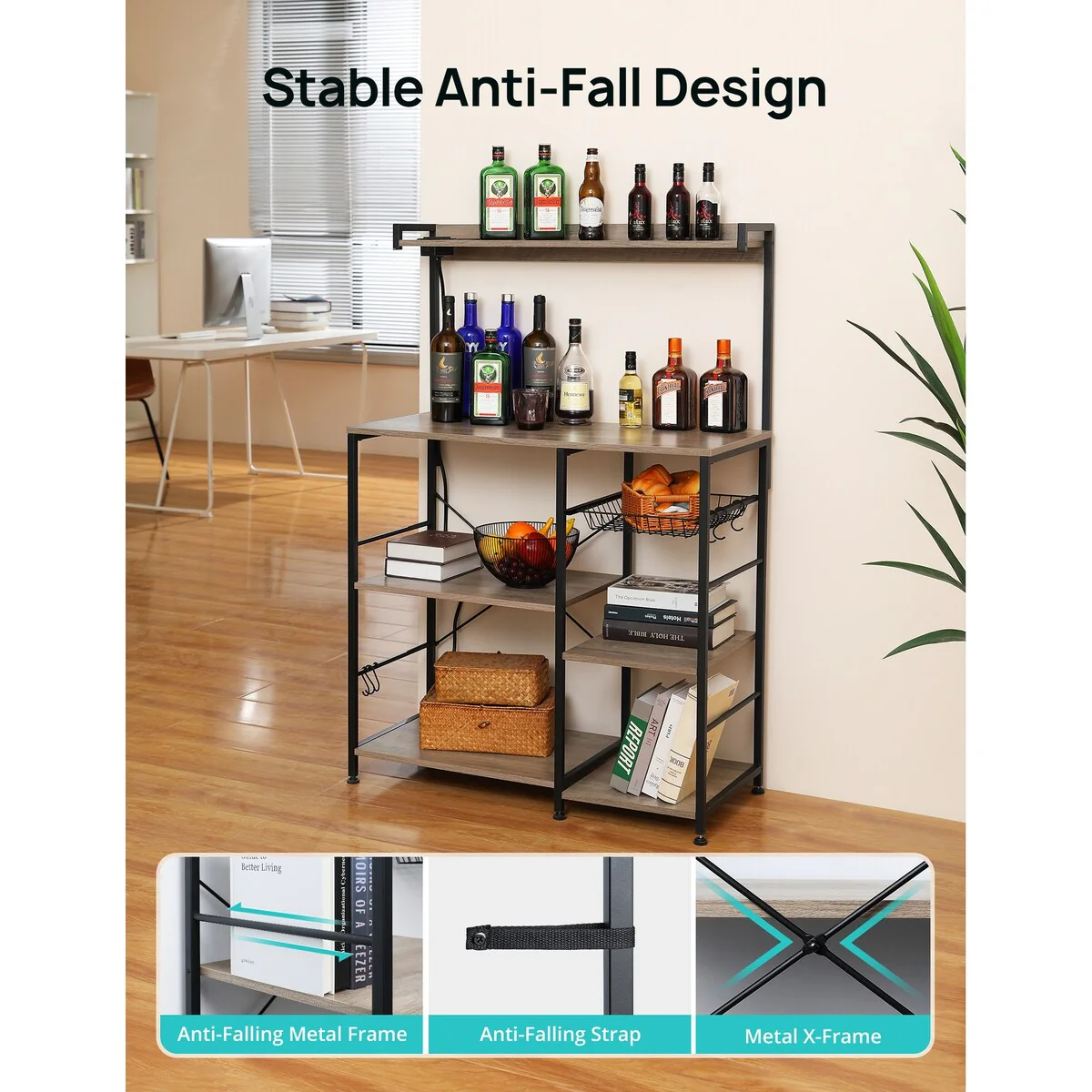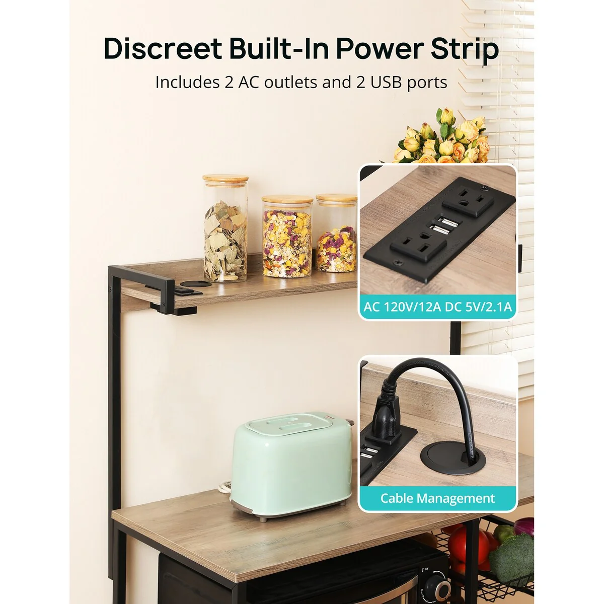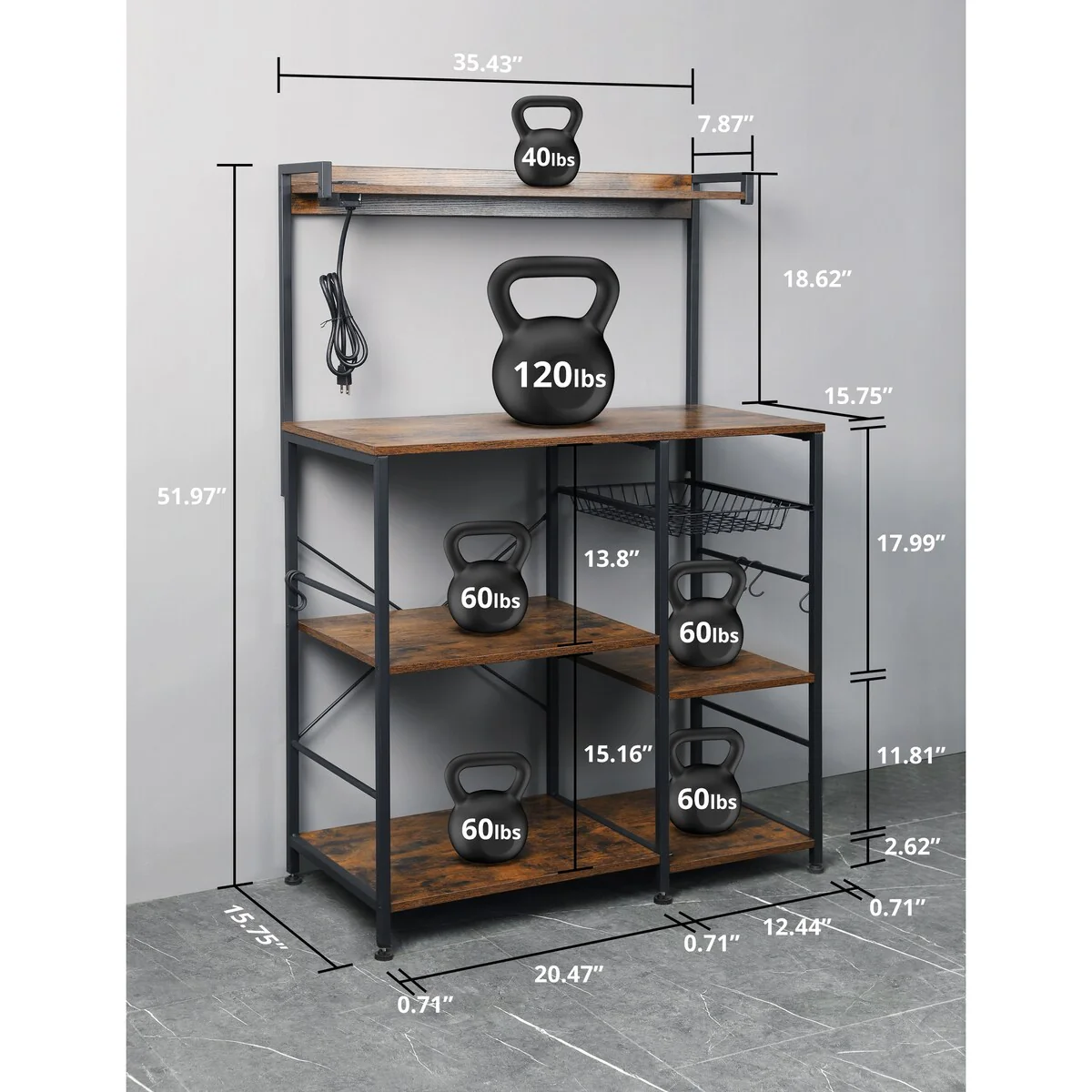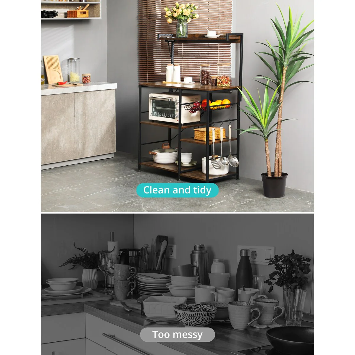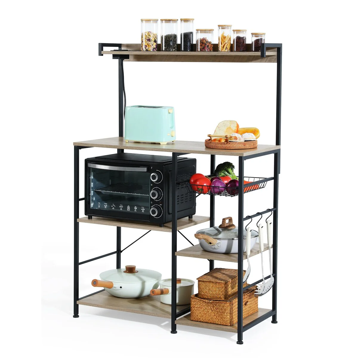The freestanding kitchen microwave rack has 6 spacious shelves, 1 metal mesh shelf and 6 S-shaped hooks, providing plenty of space for a variety of kitchen supplies, from spice bottles to rags to pots and pans to microwaves and more. This multi-functional storage rack is made of high-quality engineered wood and iron frame, which is sturdy and durable with strong load-bearing capacity. What’s special is that the baking rack has a built-in power outlet at the top, providing convenience for using kitchen appliances. Choose our 6-tier kitchen pot rack to keep your kitchen free from clutter! Â Â