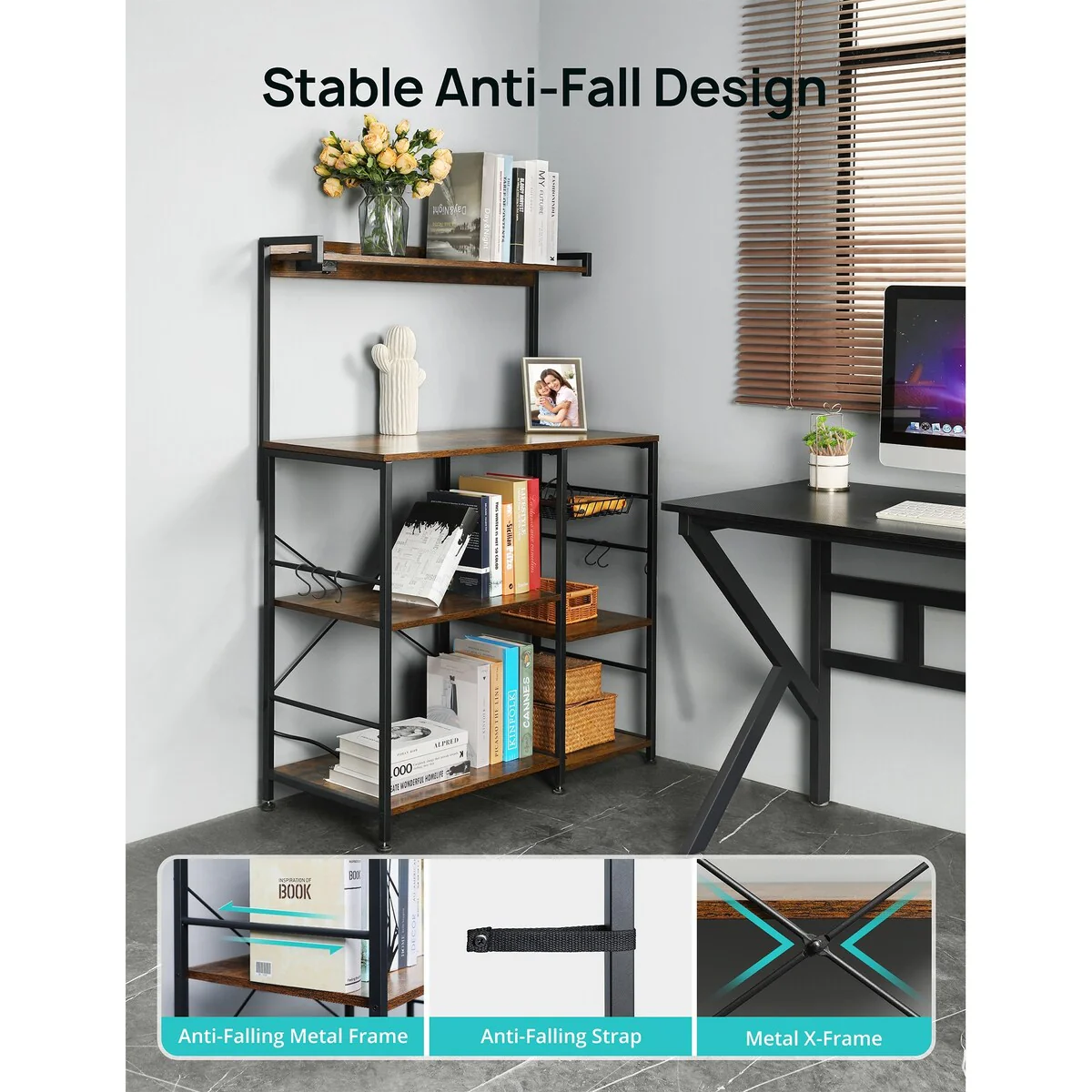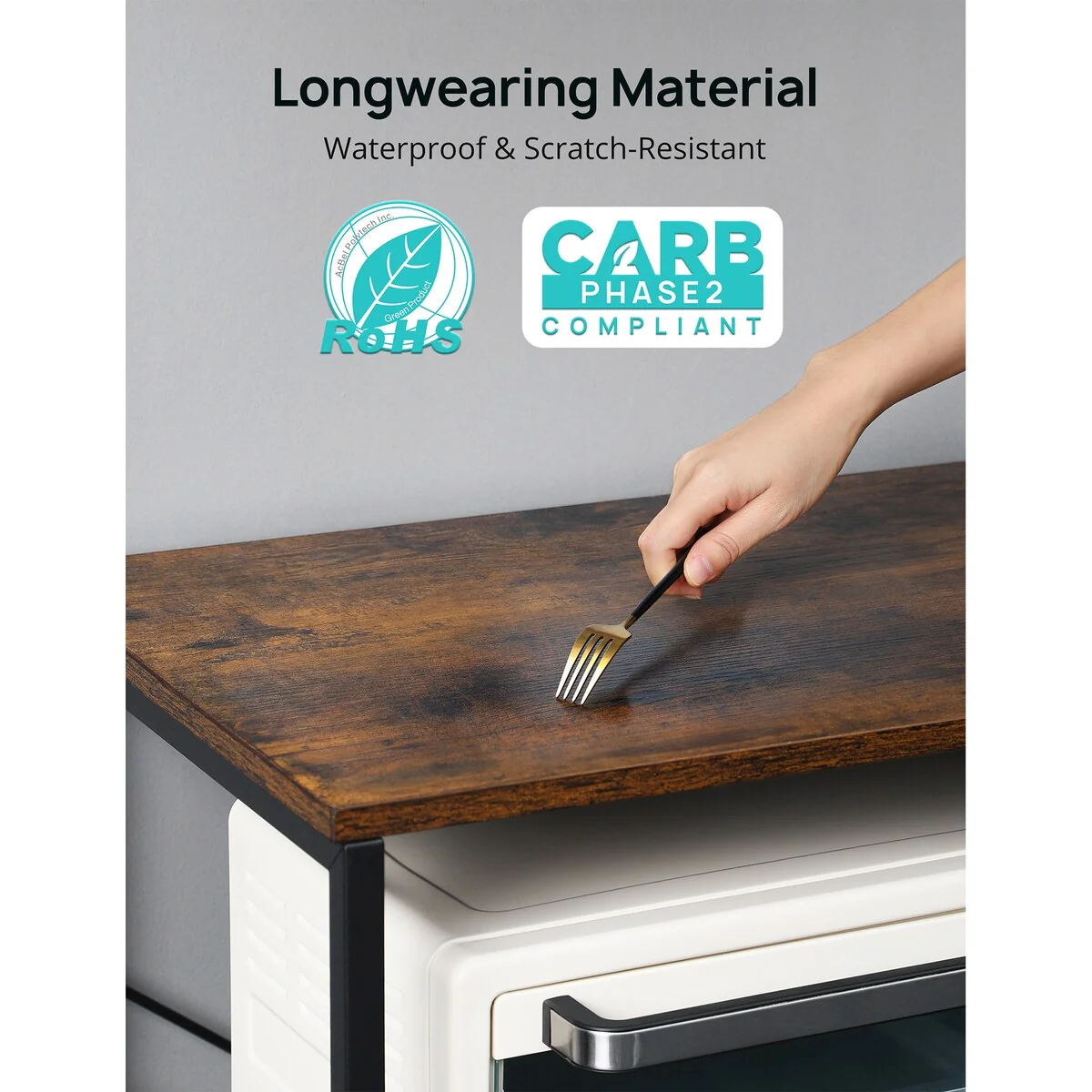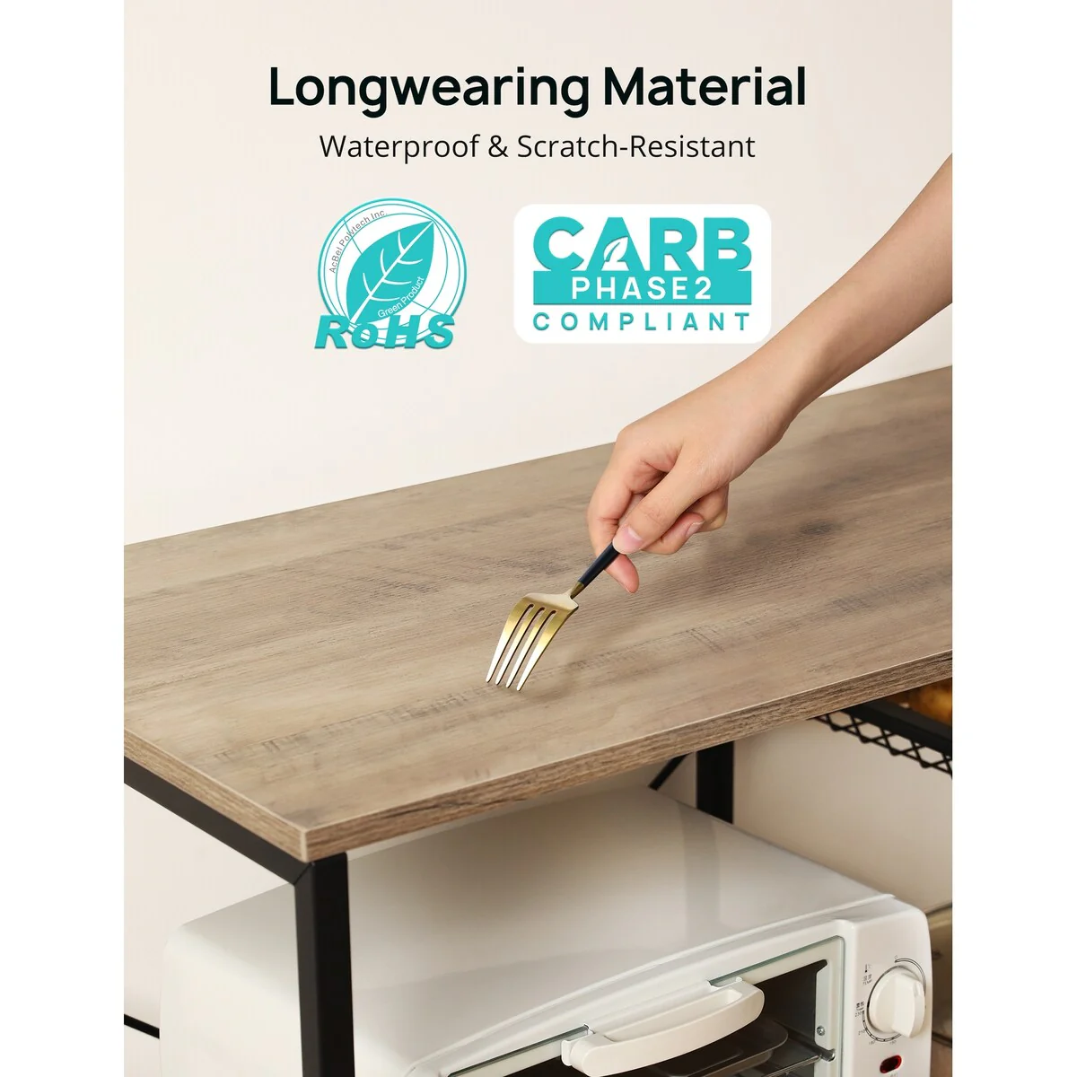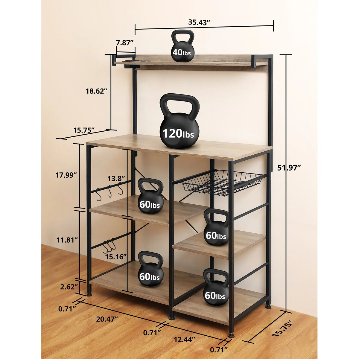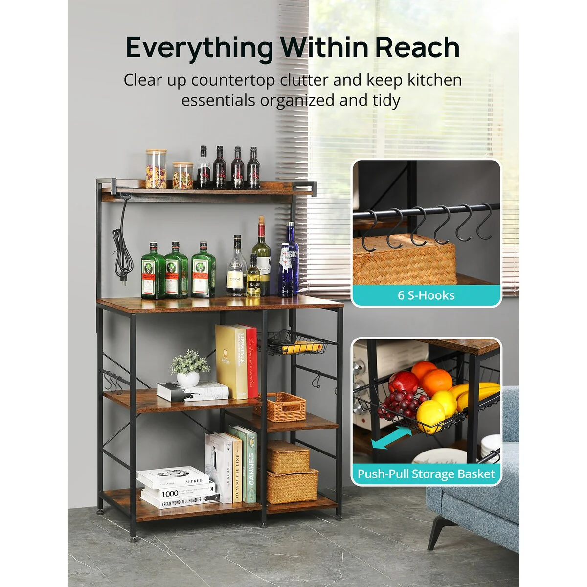 The freestanding kitchen microwave rack has 6 spacious shelves, 1 metal mesh shelf and 6 S-shaped hooks, providing plenty of space for a variety of kitchen supplies, from spice bottles to rags to pots and pans to microwaves and more. This multi-functional storage rack is made of high-quality engineered wood and iron frame, which is sturdy and durable with strong load-bearing capacity. What’s special is that the baking rack has a built-in power outlet at the top, providing convenience for using kitchen appliances. Choose our 6-tier kitchen pot rack to keep your kitchen free from clutter! Â Â