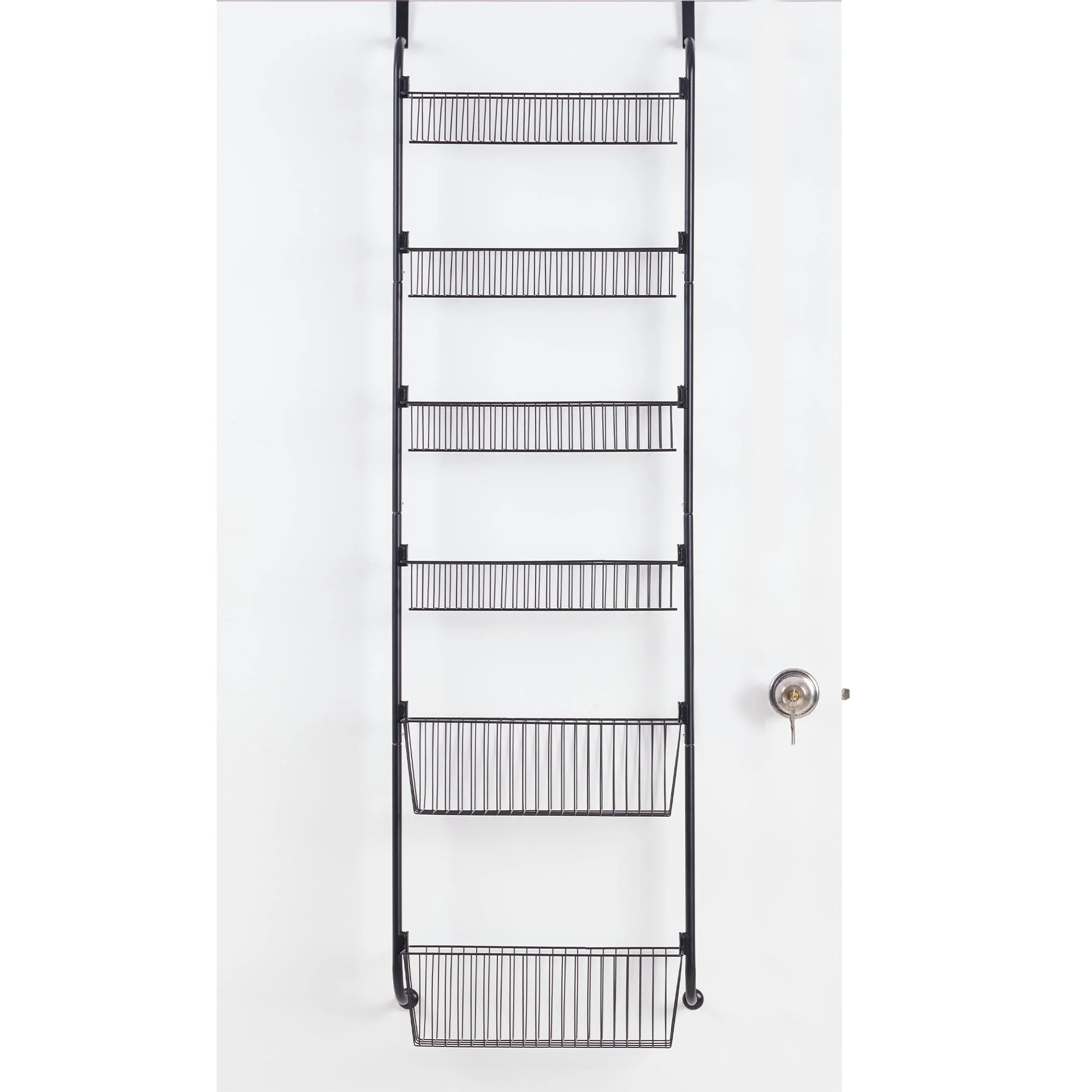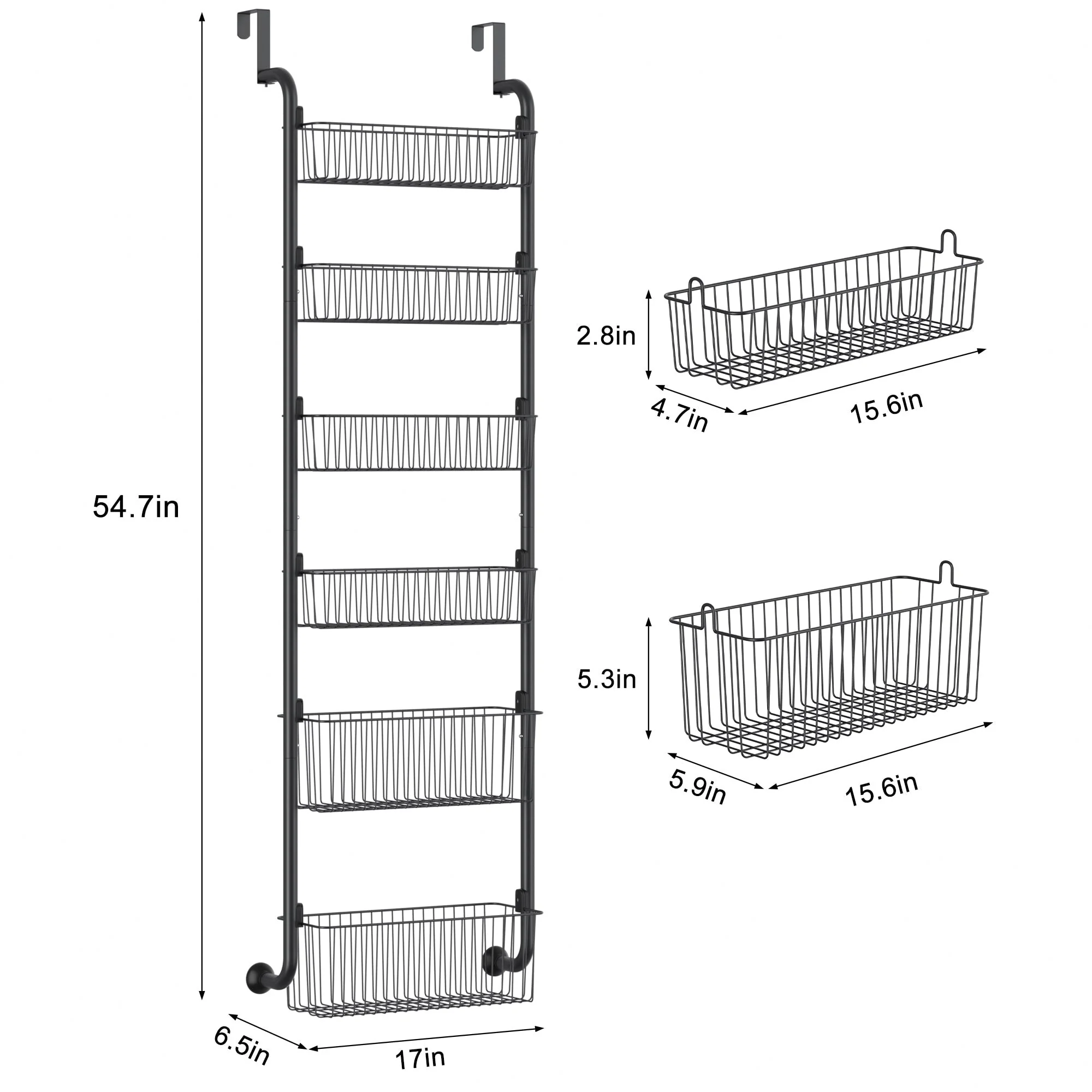 6 Heavy-Duty Metal Baskets: The upper 4 baskets are normal size: 15.5 "L * 4.7" * 2.7" H.​ While the bottom one is deeper: 15.74 "L * 5.9" * 5.3" H.​ Overall size: 16.9 "L * 6.5" W * 54.7 "H.​ Withstands 60 lbs. (10 lbs/tier). Versatile for any need, adding extra storage when space is limited, whether as a pantry door organizer or an over door rack.