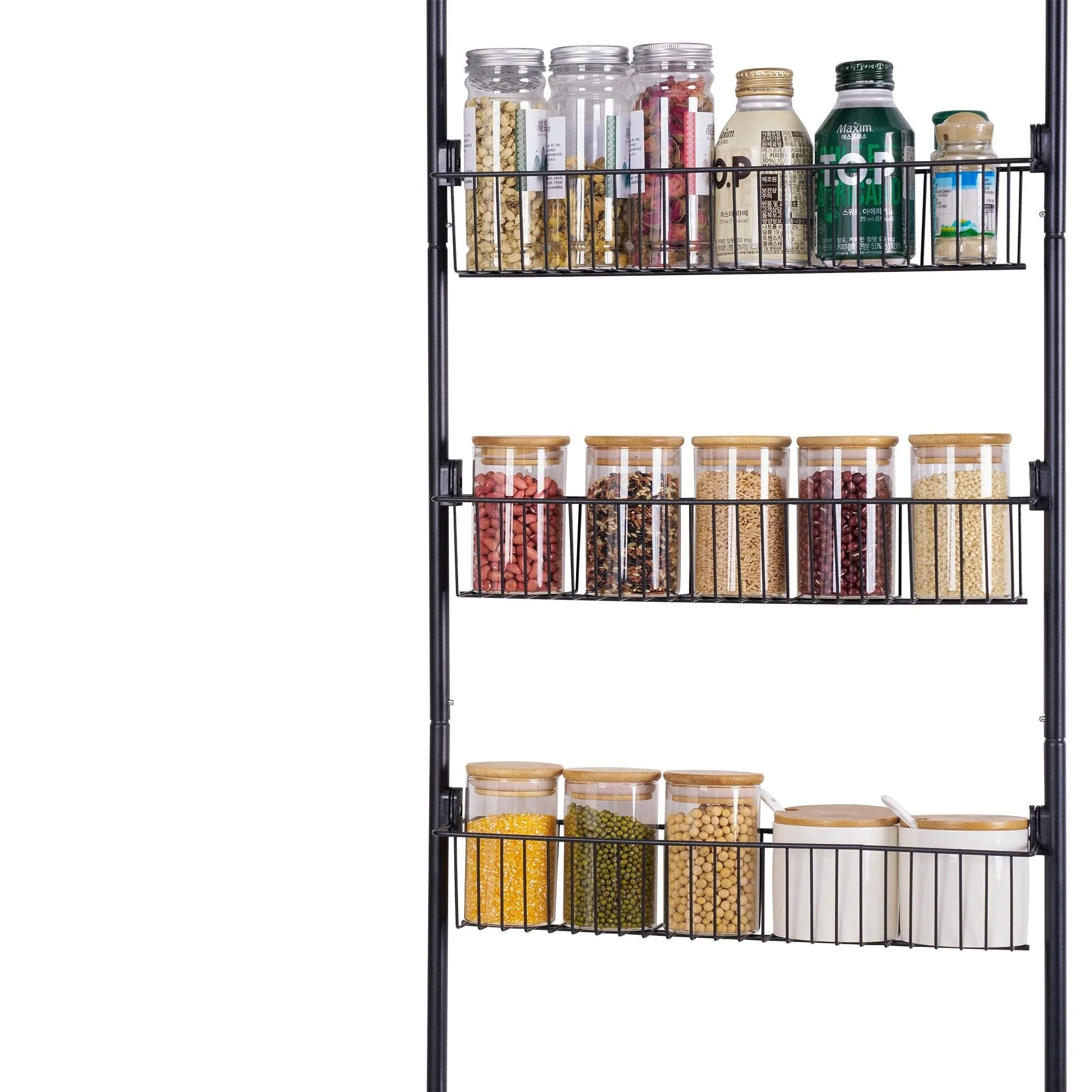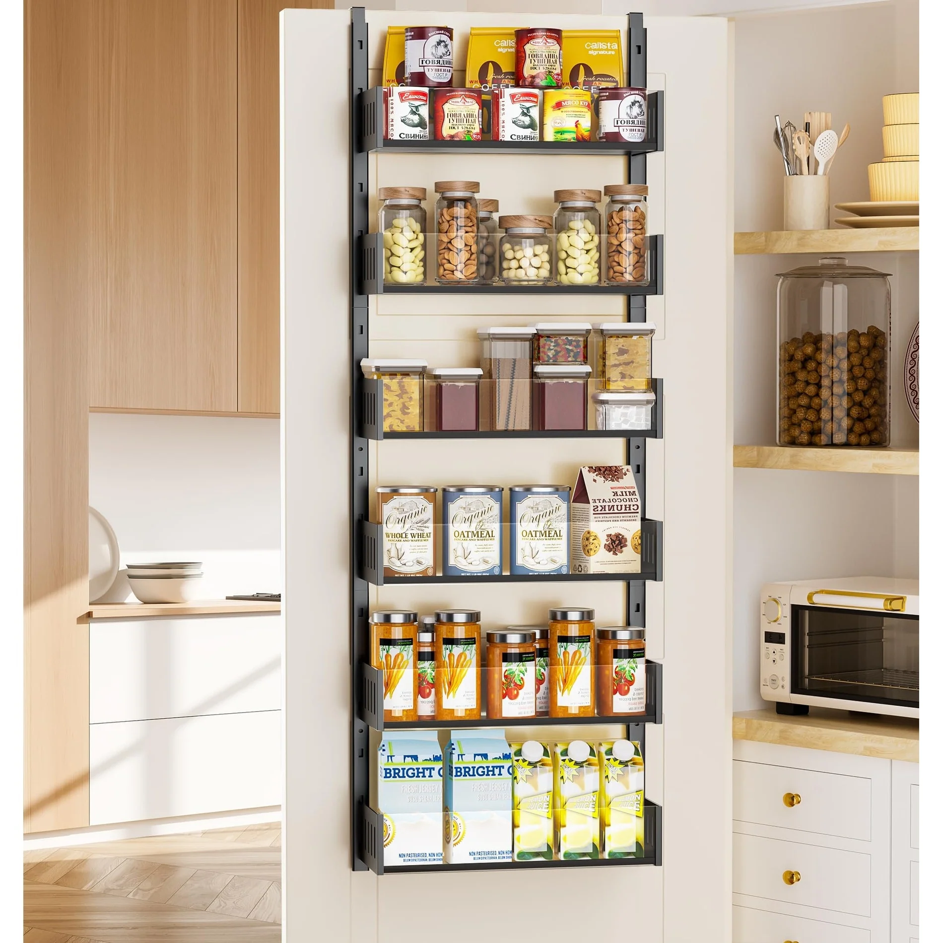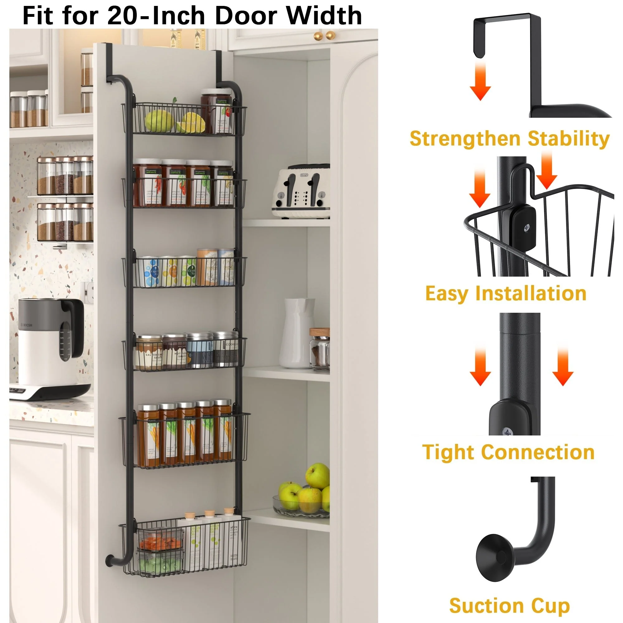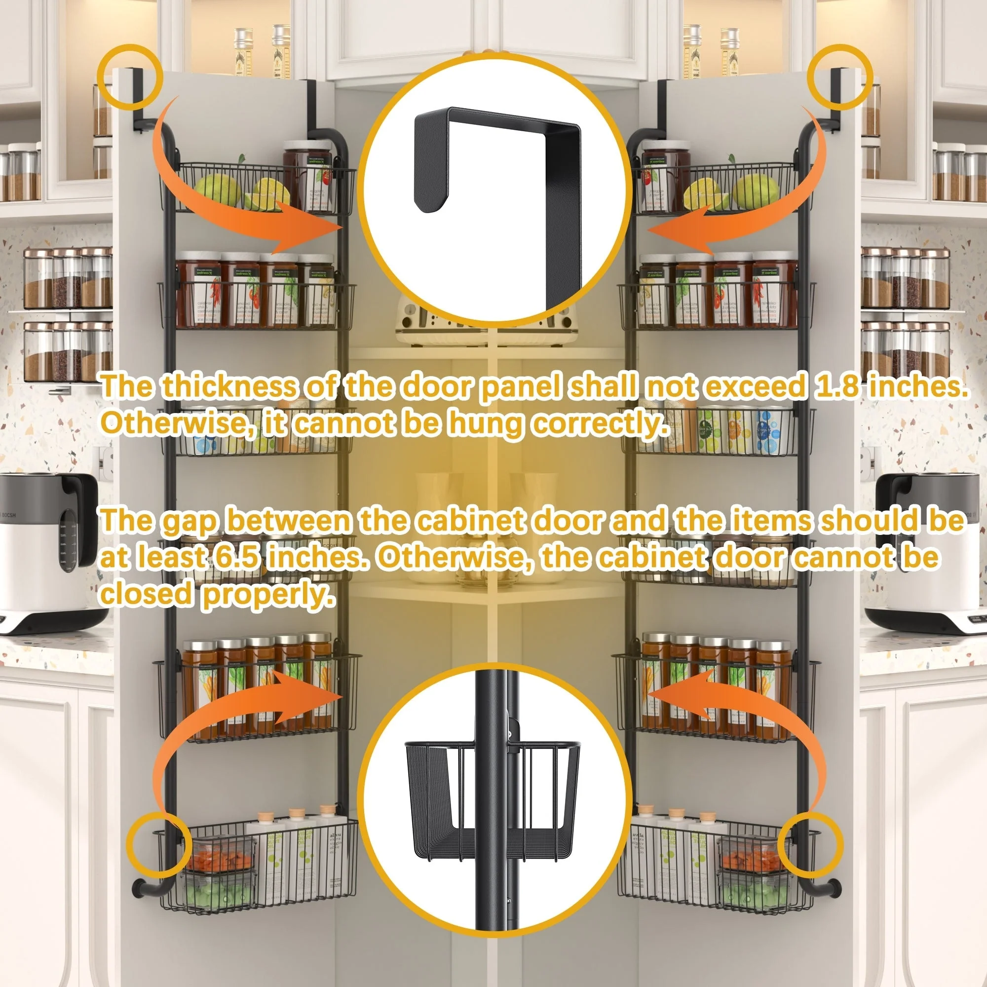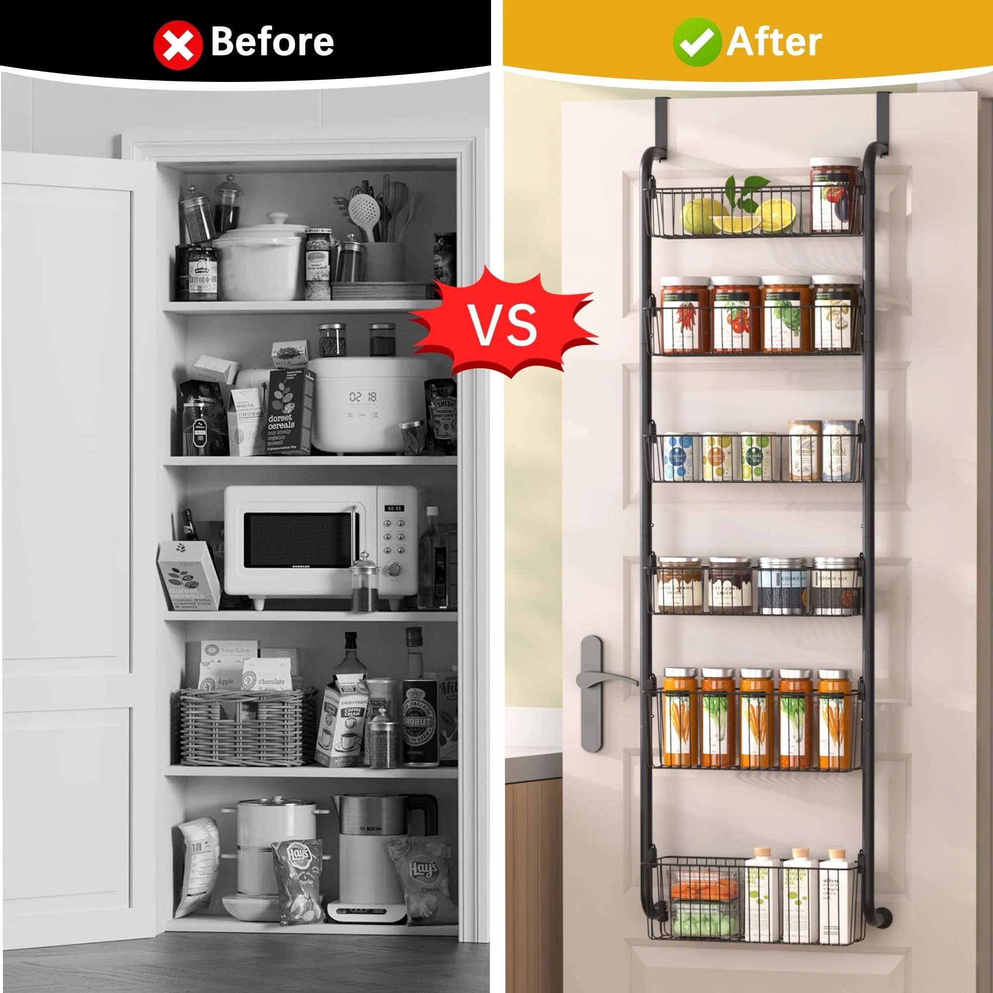 Maximize Storage with Large Capacity: Please measure the width of your door before purchasing to see if it can fit a 16.9 "W shelf. Our 6-Tier over the door pantry organizer is designed to make the most of your storage space, allowing you to store more items in a smaller area such as spice and some jars. Perfect for small kitchens or those with limited storage space.