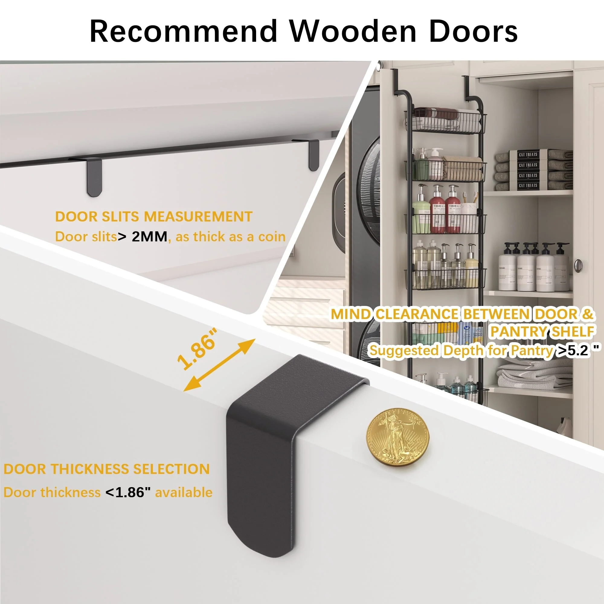 Note: Please measure pantry depth and factor in obstructions (dividers, compartments, etc.) before purchasing our over the door pantry organizer. Allow at least 6.5 inches of clearance between the door and the pantry shelves.