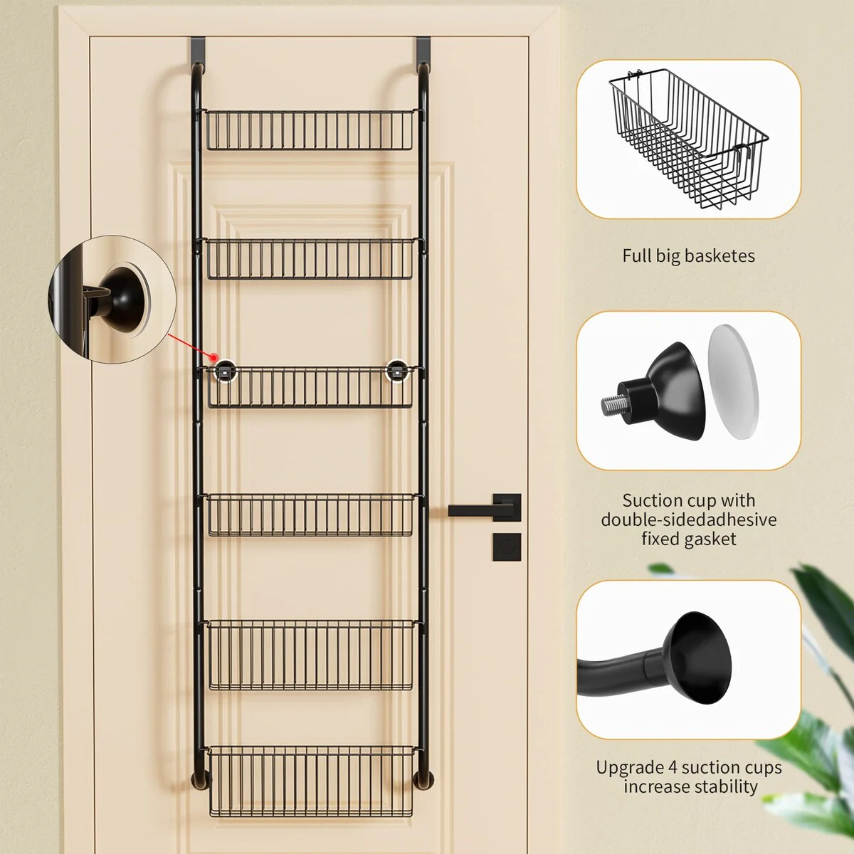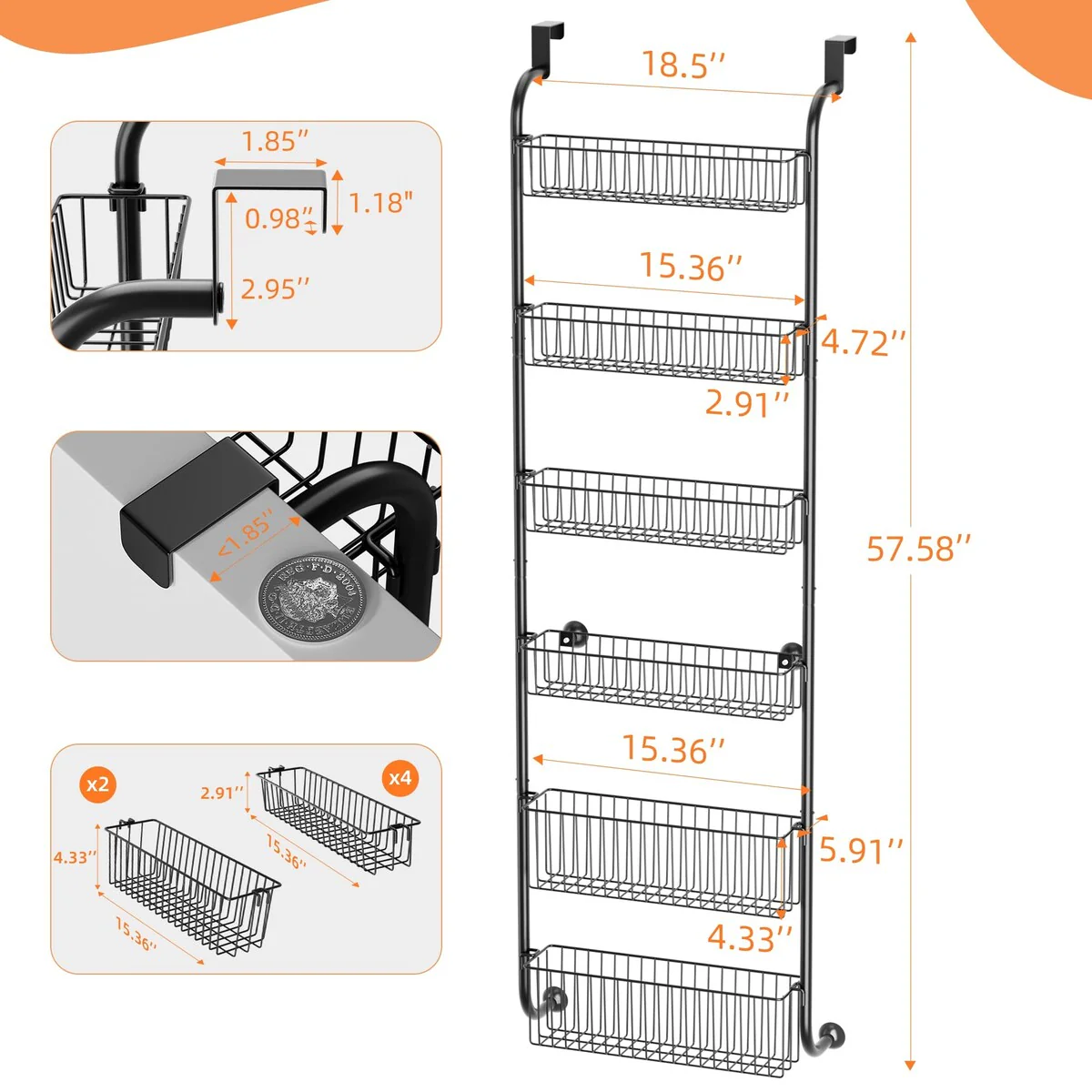 6 Tier Over the Door Pantry Organizer Rack with 4 + 2 Full Baskets, Hanging & Wall Mount Spice Rack Kitchen Storage Rack