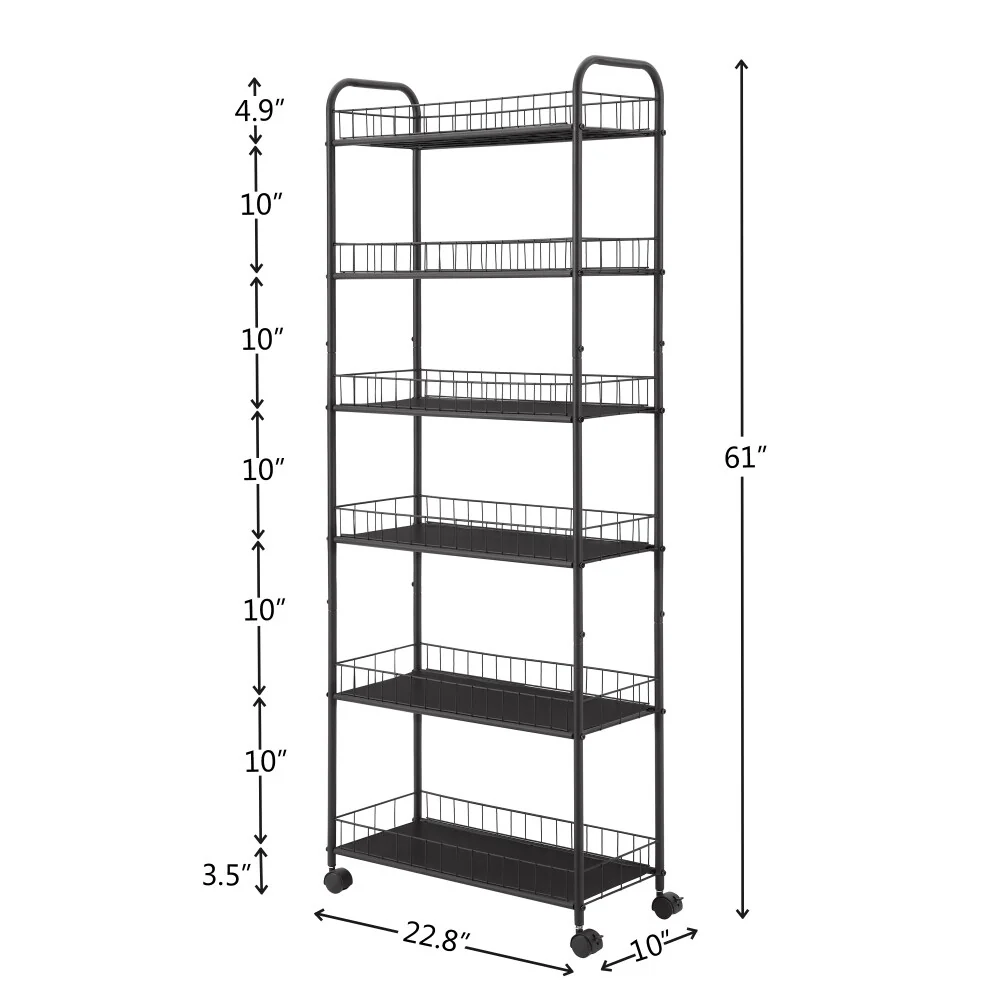 This 6 slim storage cart measures 10"D x 22.8"W x 61"H making it perfect for storage in small spaces around your home. The slim cart easily slides between closets, kitchens, bathroom, garages, laundry rooms, offices, or in-between your washer and dryer.