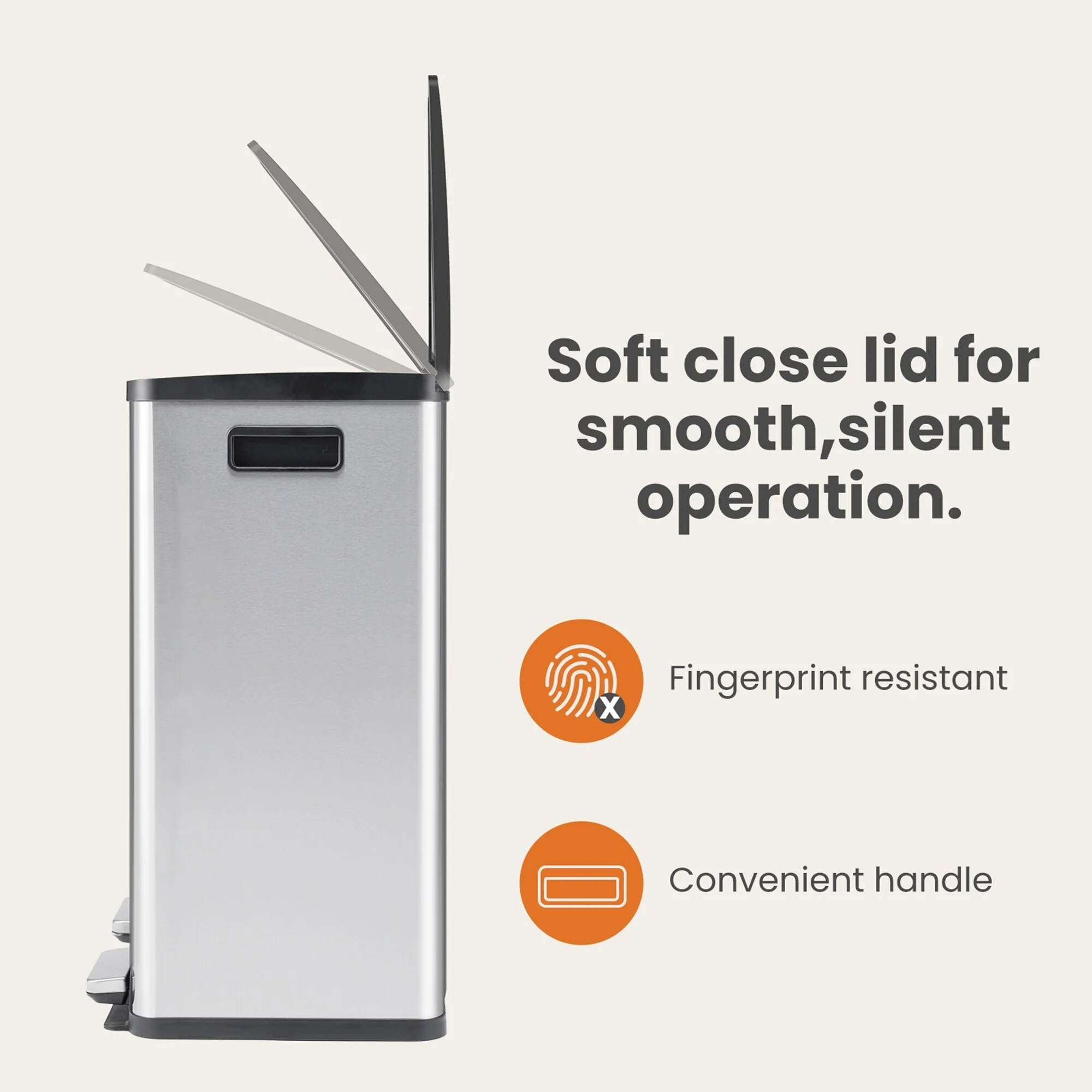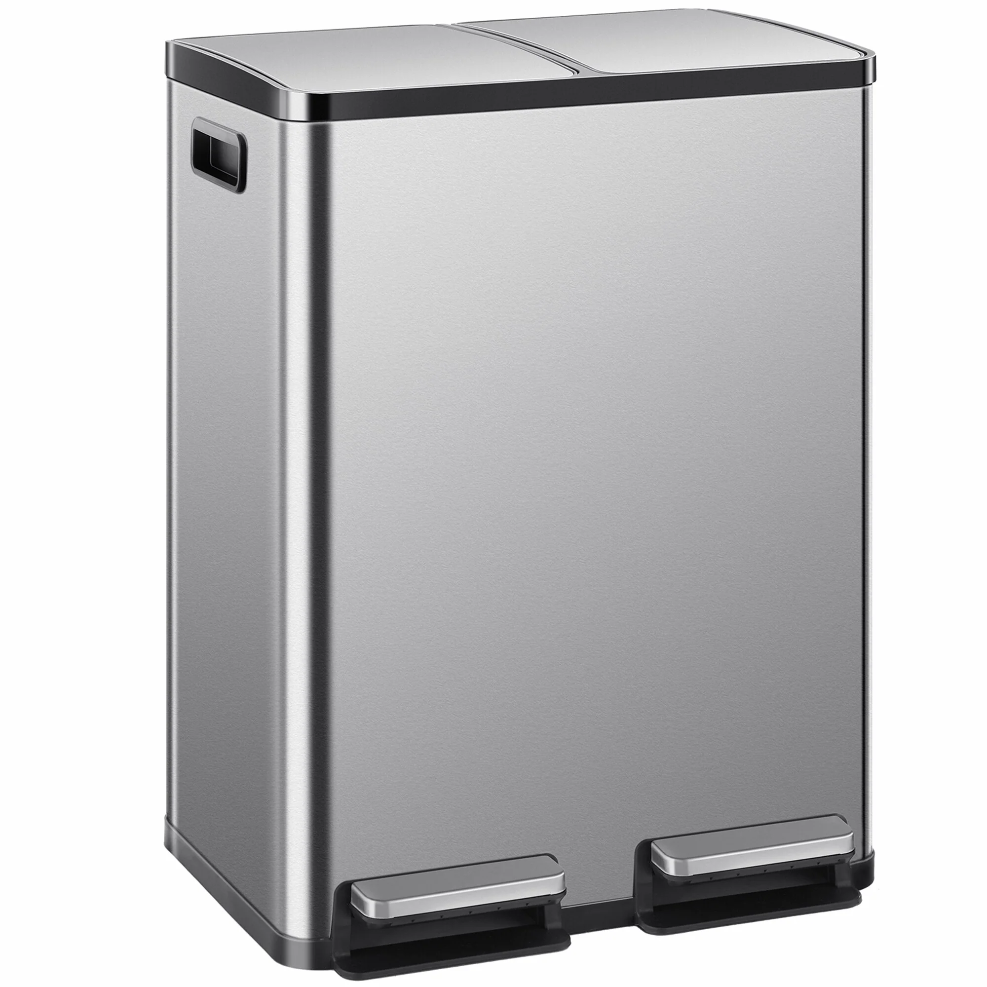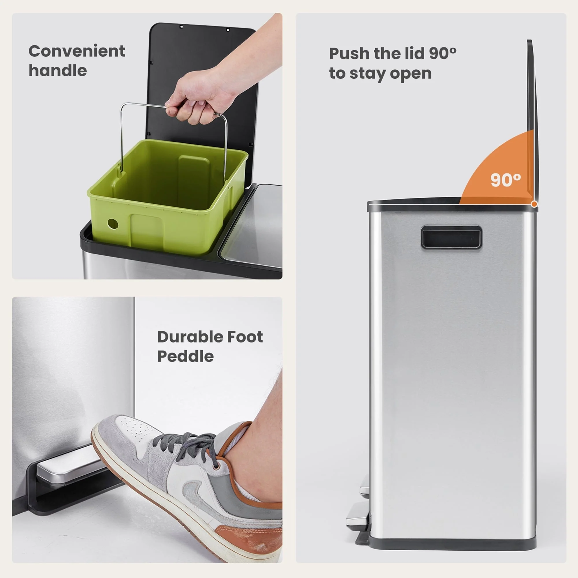 【Product Features】★Dual Compartments: This trash can features two separate compartments, allowing for easy separation and disposal of recyclables and regular waste.Sturdy Construction: Crafted from durable stainless steel, this bin is built to withstand daily use and maintain its sleek appearance.★Soft-Close Lids: The lids are designed with a soft-close mechanism, preventing loud slamming and ensuring a quiet operation.★Pedal Operation: Hands-free pedal controls make opening the lids effortless, promoting cleanliness and convenience.★Compact Design: With its space-saving dimensions, this trash can fits seamlessly into any kitchen, office, or living area without compromising on capacity.【Keep it looking its best】1.Fabric furniture Care;Dust regularly. Clean gently with a clean, slightly damp cloth. Professional cleaning is recommended.2.Wood Furniture Care:We recommend dusting frequently with a clean, soft, dry, lint-free cloth. Clean the surface by rubbing in the direction of the grain and wipe dry.3.Avoid direct sunlight.4.Avoid the use of all chemicals, household cleaners, abrasives, or cleaners that contain lemon, vinegar, or other acids that may damage the finish.5.Do not place hot appliances, such as curling irons and hot hair dryers directly on the countertop.6.Spot clean using distilled water and water-based cleaning agents, foam or mild water-free cleaning solvents. 7.Always test a small inconspicuous area first.8.Hardware may loosen over time; periodically check to make sure all connections are tight【Notes】1.Size Notice:Manual measurement has been used, there may be some reasonable errort, thanks for your understanding.2.Color Notice:Due to factors such as display equipment and shooting environment, the color of the item may be slightly different from the picture, which is a normal phenomenon, please refer to the actual item3.Assembly Notice:Please read assemble manual in advance. Please do not over-tighten nuts, as this may cause distortion or breakage.4.It is recommended to put a layer of foam or soft cushion on the floor when installing to avoid scratching the floor.5.If the item has any defects, damage or missing parts, please contact us with pictures or videos so that we can understand your needs and help you quickly, and always remember to retain its original packaging to ensure any return requests. We will try our best to solve any problems you may have.6.If you receive the wrong product, please attach the product picture, the infographic of the outer package and the picture containing SKUs, so that we can verify and quickly deal with it for you