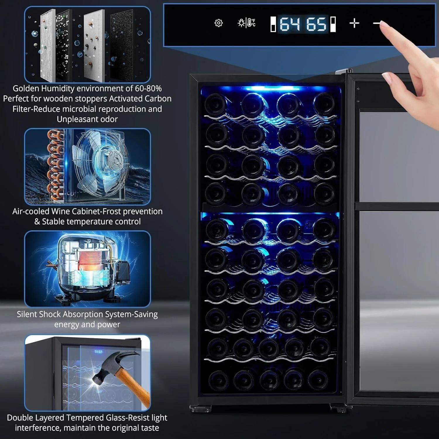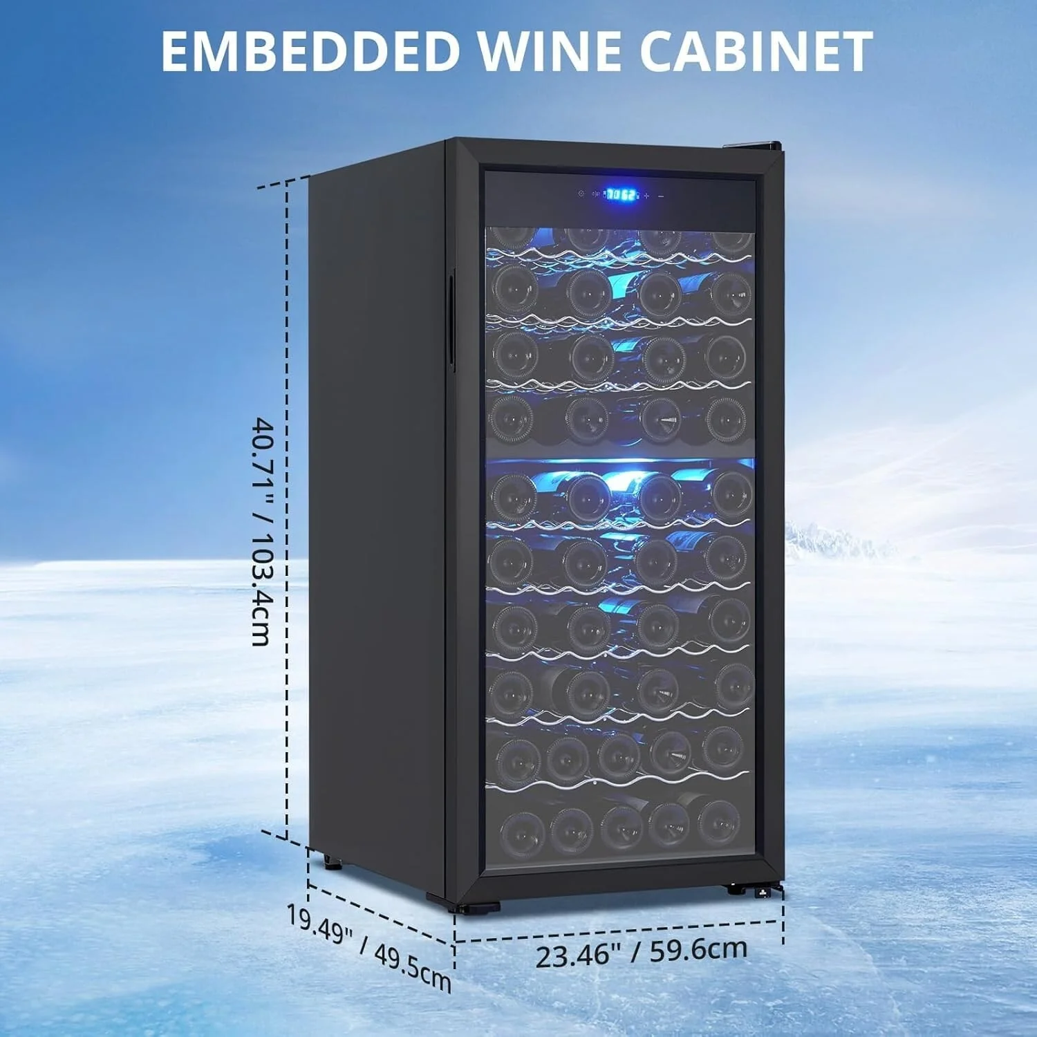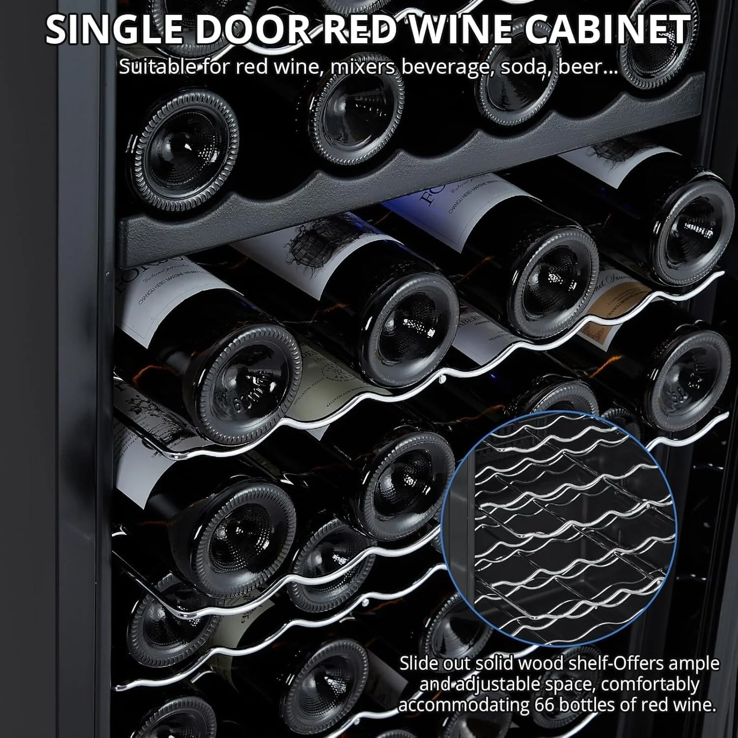 **Product Description for 66-Bottle Wine Cooler Refrigerator**Elevate your wine storage experience with our premium Wine Cooler Refrigerator, designed for the true wine enthusiast. With a generous capacity of 66 bottles, this freestanding wine cabinet is perfect for both red and white wines, ensuring your collection is stored at the ideal temperature for optimal flavor and aroma.**Key Features:**- **Dual Zone Temperature Control:** Enjoy the flexibility of storing different types of wine at their perfect temperatures. The dual temperature zones allow you to set the ideal climate for both red and white wines, ranging from 5℃ to 18℃.- **Digital LED Touch Control:** Effortlessly adjust and monitor the temperature with our user-friendly digital LED touch control panel. The sleek design ensures that you have complete control at your fingertips, providing a modern touch to your wine storage.- **Soft Interior Lighting:** Showcase your wine collection with elegance. The soft interior lighting beautifully illuminates your bottles, making it easy to select your favorite vintage while adding a touch of sophistication to your space.- **Freestanding Glass Door Design:** The stylish glass door not only offers a clear view of your collection but also enhances the aesthetic of any room. The black wine cabinet complements any décor, making it a perfect addition to your home, bar, or kitchen.- **Versatile Storage:** Ideal for sparkling wine storage and other beverages, this wine fridge is designed to accommodate various bottle shapes and sizes, ensuring that your favorite drinks are always on hand.**Why Choose Our Wine Cooler?**Invest in a wine cooler that combines functionality with elegance. Our Wine Cooler Refrigerator is not just a storage solution; it’s a statement piece that reflects your passion for wine. Whether you’re a casual drinker or a serious collector, this wine fridge will keep your bottles perfectly chilled and ready to enjoy.