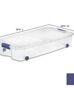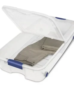 Keep your space organized with this 66 Quart Underbed Latch Box. The size and shape of this Latch Box allow it to fit conveniently under the bed to maximize unused storage space, ideal for clothing, linens, and shoes, with smooth gliding wheels to easily slide it into place. The clear base and lid allow easy viewing of contents, and features secure latches that keep the lid attached to the base, yet are still easy to unlatch. The hinging lid allows access to stored contents, without having to remove the whole lid. The recessed lids allow same size storage boxes to stack neatly on top of each other to use vertical storage space efficiently.Â