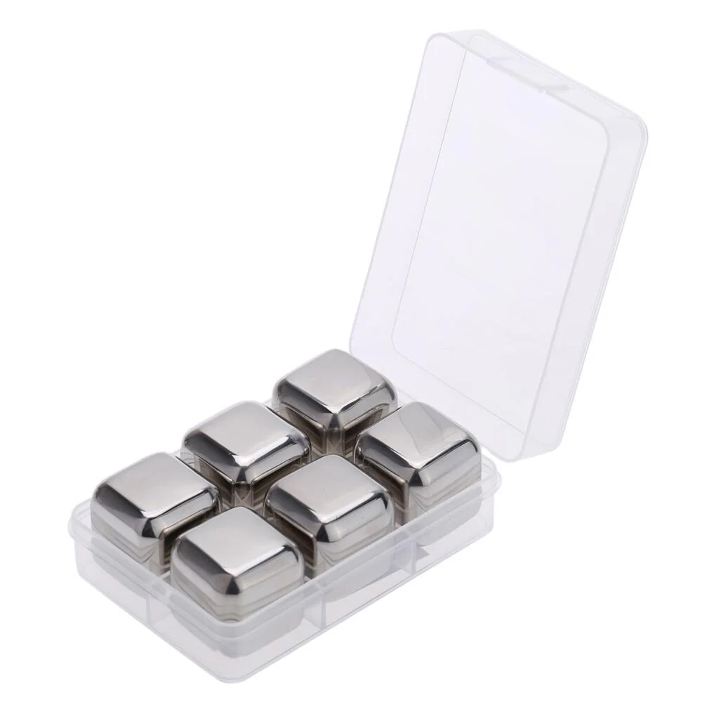 Tired of your whiskey getting watered down by ice? Keep your whiskey cold without ice diluting it with these 6-piece Stainless Steel Whiskey Stones. Includes 6 reusable stainless steel chilling stones and a plastic storage tray to keep your whiskey stones clean and organized. Food-grade, non-corrosive stainless steel is odorless and non-porous, so it will not affect your drinks flavor. Easy to wash and clean, Hand wash. Run cubes under water until slightly damp, then store them in the freezer for at least 4 hours before use. Dampness will not dilute your drink, it will help the cubes lower drink temperature by a few degrees more. Style options: Square, Round.