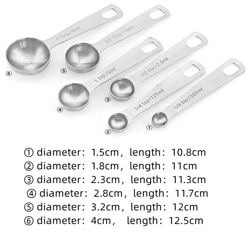 - 6 Different Sizes: The set includes 6 spoons of varying sizes: 1/8 tsp, 1/4 tsp, 1/2 tsp, 1 tsp, 1/2 tsp, and 1 tsp, covering all your measuring needs for both small and large quantities.