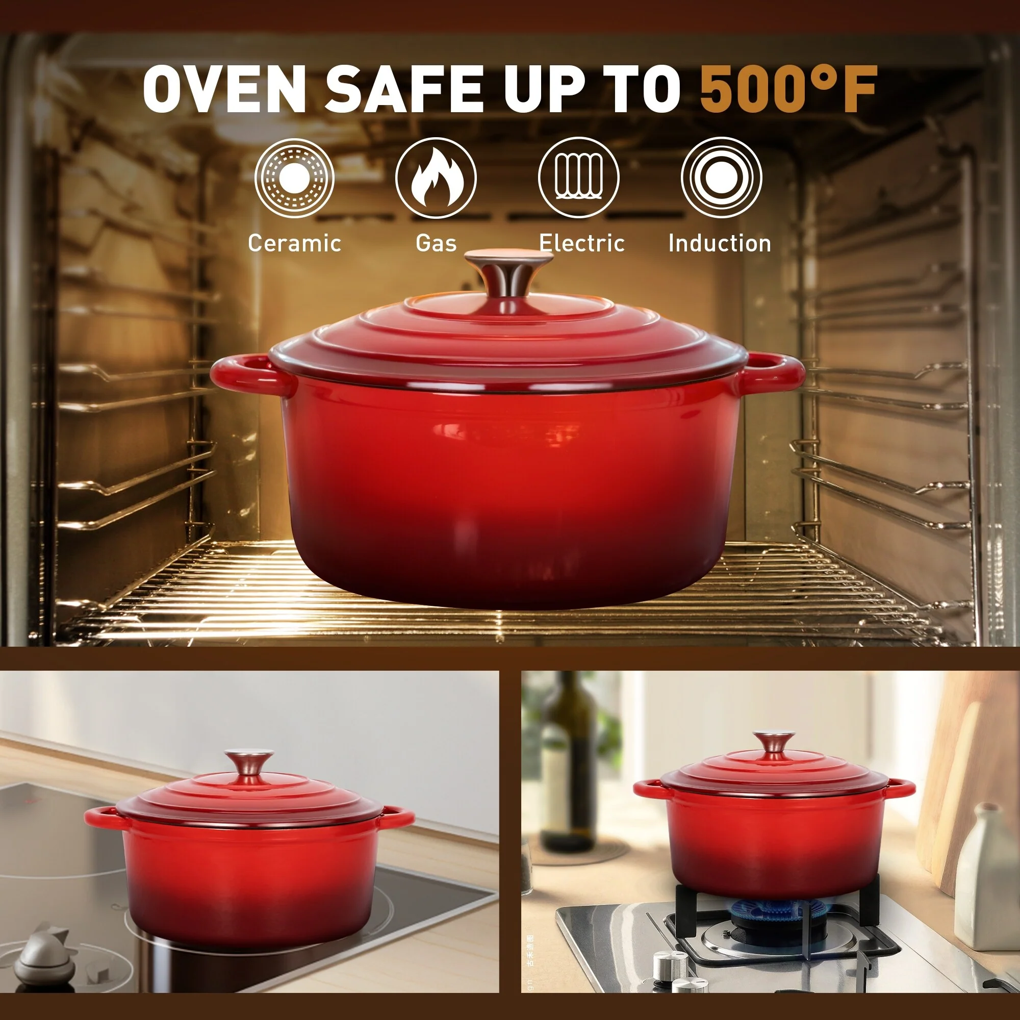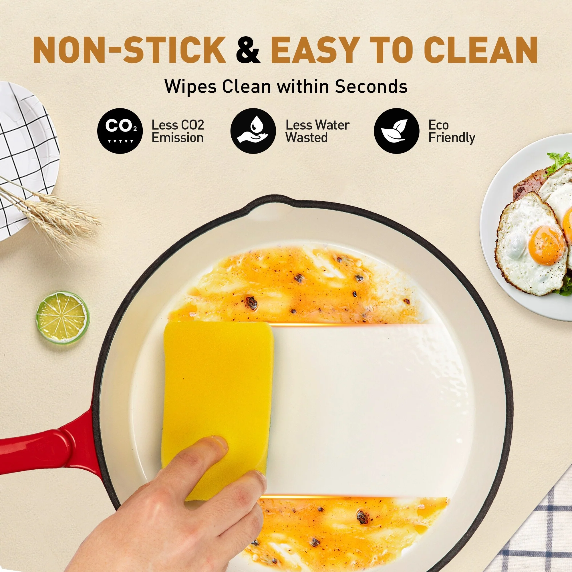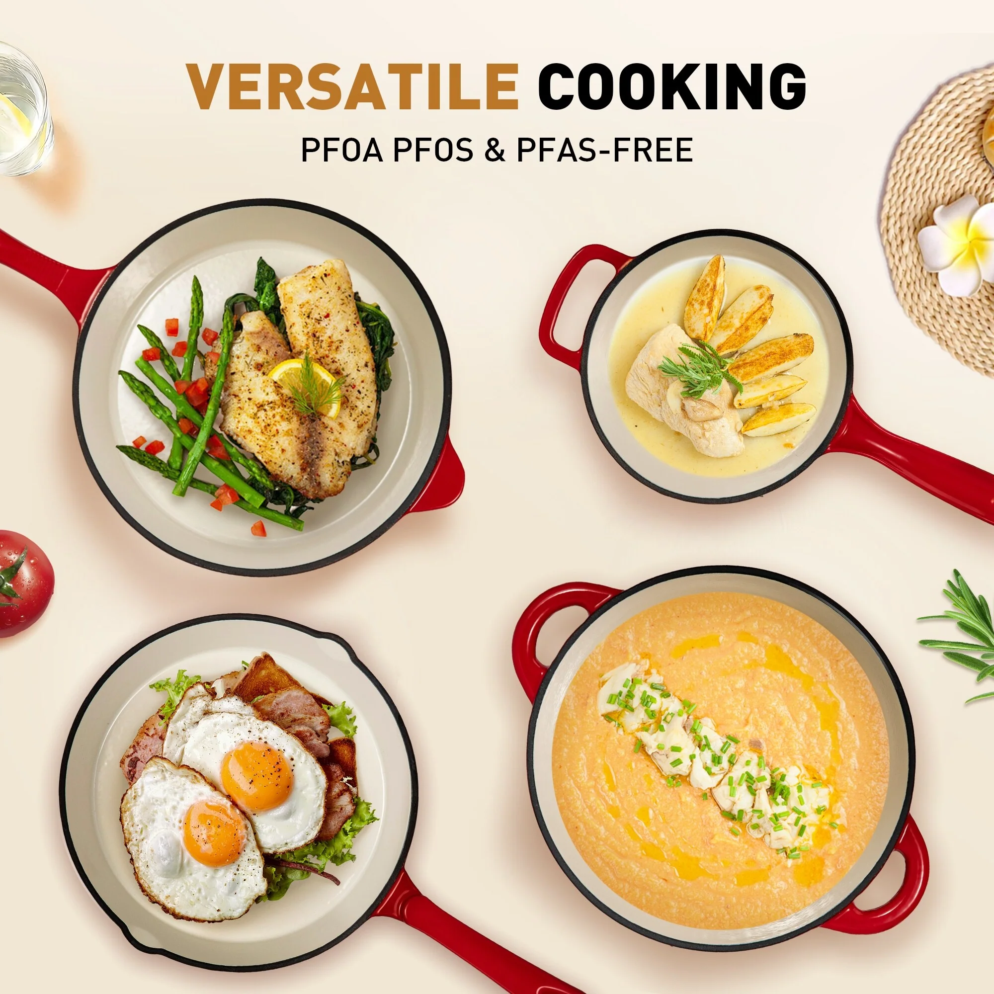 Healthy Cookware Sets: This gorgeous red cookware set features a durable enamel coating that resists cracking and scratching. The non-stick surface makes cleanup quick and easy, with most spills wiping away effortlessly. Plus, our coating is free of PFOA, PTFE, lead, and cadmium, making it an ideal choice for healthy cooking.