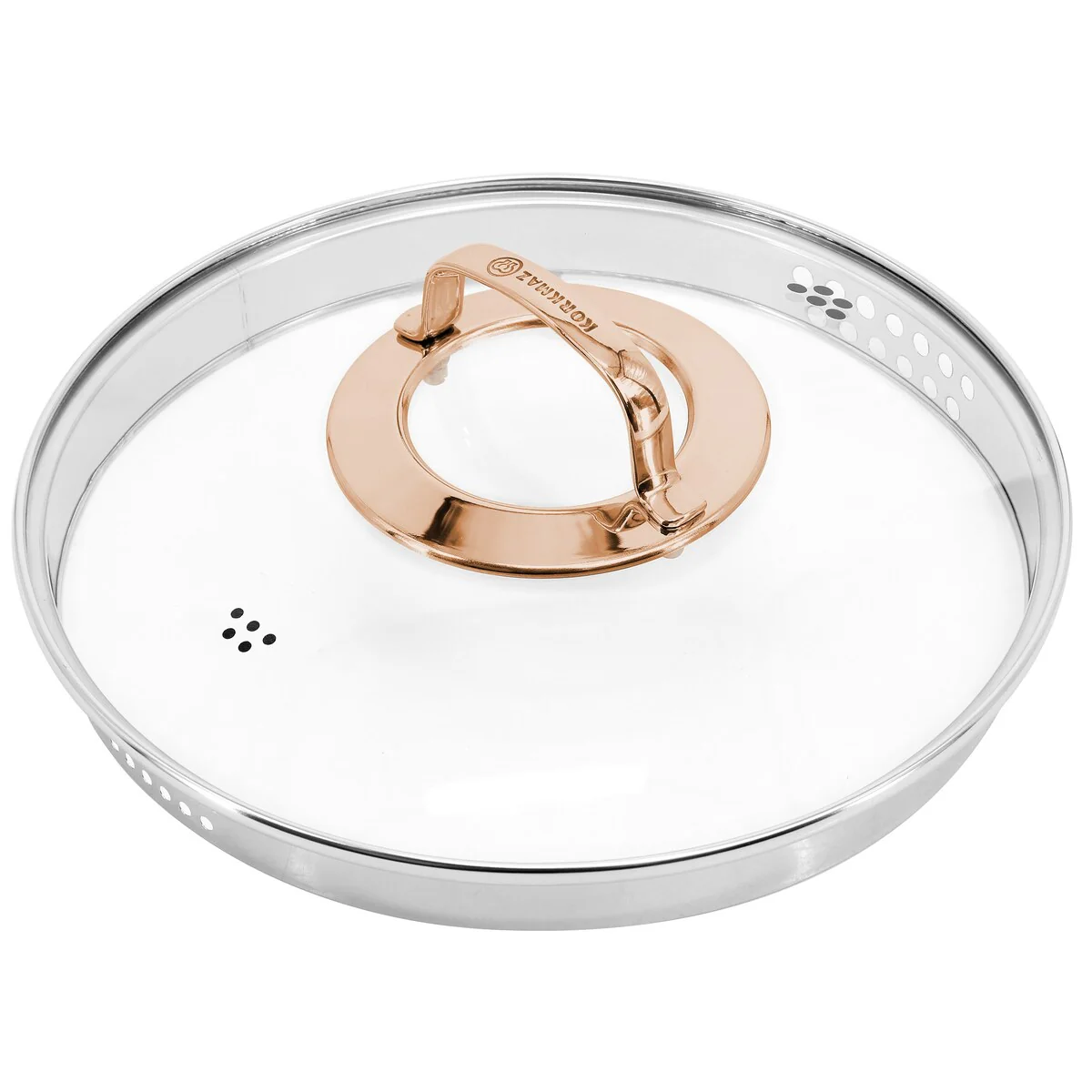 Complete all your favorite meals and more with the Galaksi 7 Piece Non Stick Aluminum Cookware Set in Black. This set comes with all the essentials for your every day cookware needs, including one 8in casserole, one 9.5in casserole, one 10in low casserole, and one 10in frying pan. Each piece in this set is designed with a Volcanic-looking PTFE coating with excellent non-stick properties, making low fat cooking and easy clean up possible. Made with PFOA, cadmium, and lead free materials for a healthy and sustainable long term solution to providing the very best for your family. Features a scratch resistant surface, and a Solar Base base system that provides the highest heat transfer on all types of stoves, including induction. Offer your family the very best with this durable, versatile and convenient all in one cookware set!Material: Aluminum base, glass/stainless steel lids and handlesColor: Black Speckle/ Rose GoldVolcanic-looking PTFE Nonstick CoatingScratch resistant surfaceLead, cadmium, and PFOA FreeHigh Heat ConductivityDishwasher SafeTwo-way strainer coverEasy filtering with strainer lidSet includes: 0ne 8in casserole, one 9.5in casserole, one 10in low casserole, and one 10in frying panPer Item Measurements:Large Casserole- 13.5in length, 9.75in diameter, 4.75in height, 7.5in height with lid, 4.35lb weightSmall Casserole- 12in length, 8in diameter, 3.8in height, 6.5in height with lid, 3.3lb weightLow Casserole- 14in length, 10.5in diameter, 2.75in height, 5.5in height with lid, 4.05lb weightFrying Pan- 18.5in length, 10.5in diameter, 1.8in height, 2.10lb weight