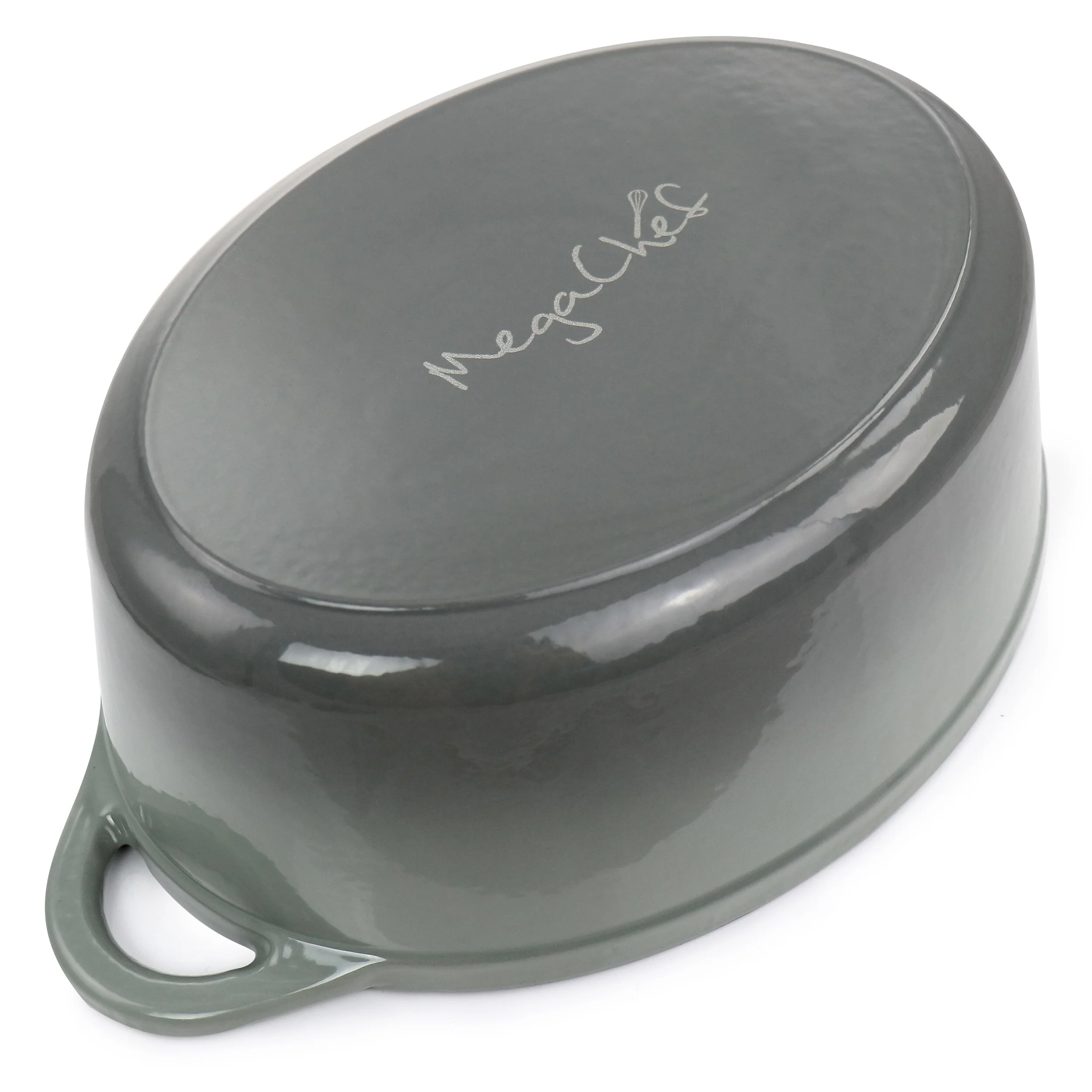 The MegaChef Oval Enameled Cast Iron Casserole in Gray, provides the ideal size and shape for a multitude of dishes. Its cast iron make allows for even and long lasting heat distribution for the evening supper. With an oval shape, the dutch oven can accommodate whole chicken and larger cuts of meat; perfectly suitable for grand dinner parties. Cut down in oils and fats with the non-stick enamel coating, creating healthier daily meals! Create an array of dishes ranging from seasonal delicacies to common year round morsels for all to enjoy! Item Dimensions: 16.50" x 10.50" x 15.00"Item Weight: 15.00lbs