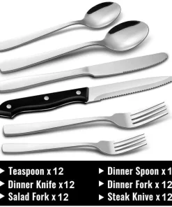 - 72 Piece Silverware Set for 12: Includes 12 dinner forks, 12 salad forks, 12 dinner knives, 12 steak knives, 12 dinner spoons, and 12 teaspoons, making this a must-have piece of flatware for the home or restaurant. Whether for everyday use or preparing for a dinner party or gathering, this set is an irreplaceable dining tool.