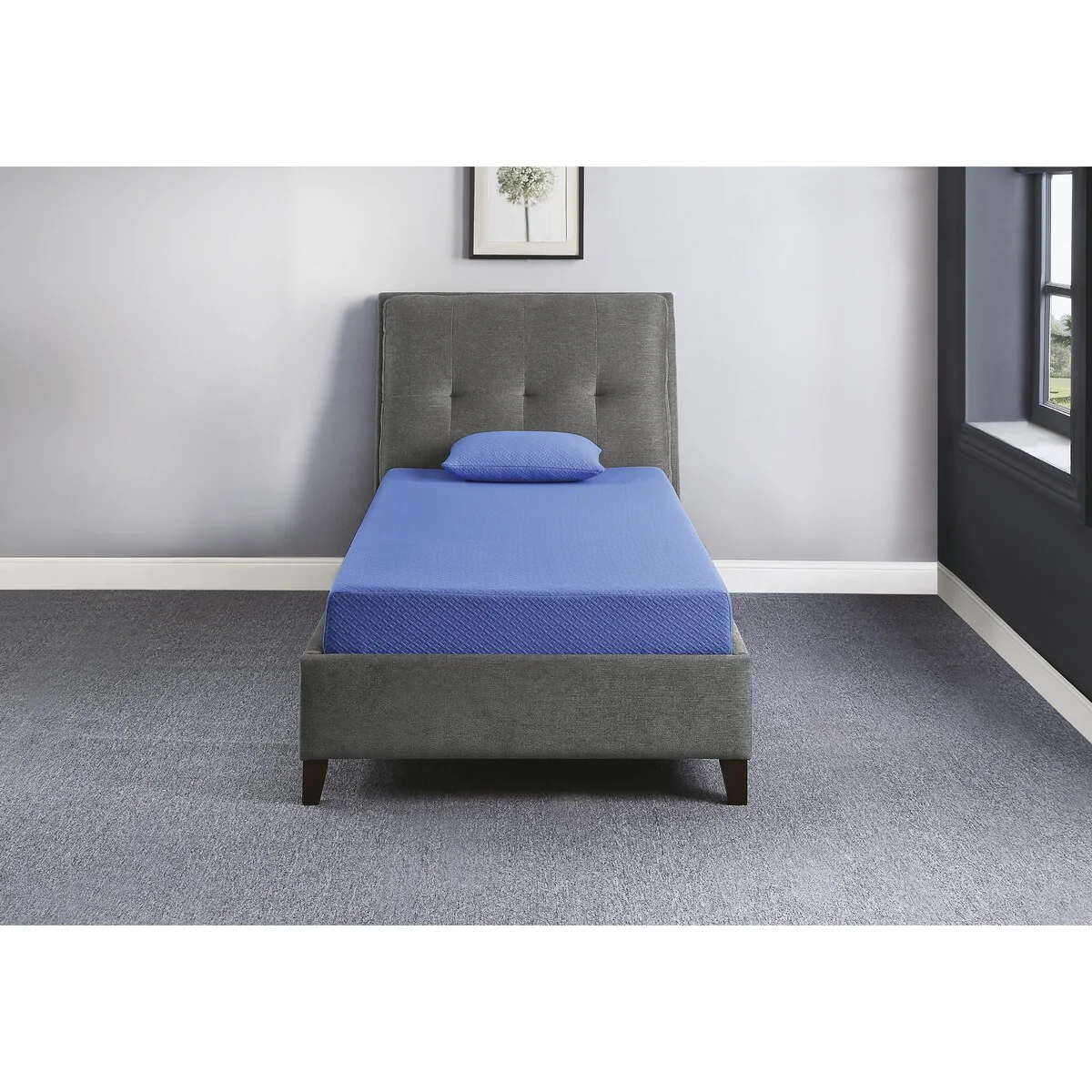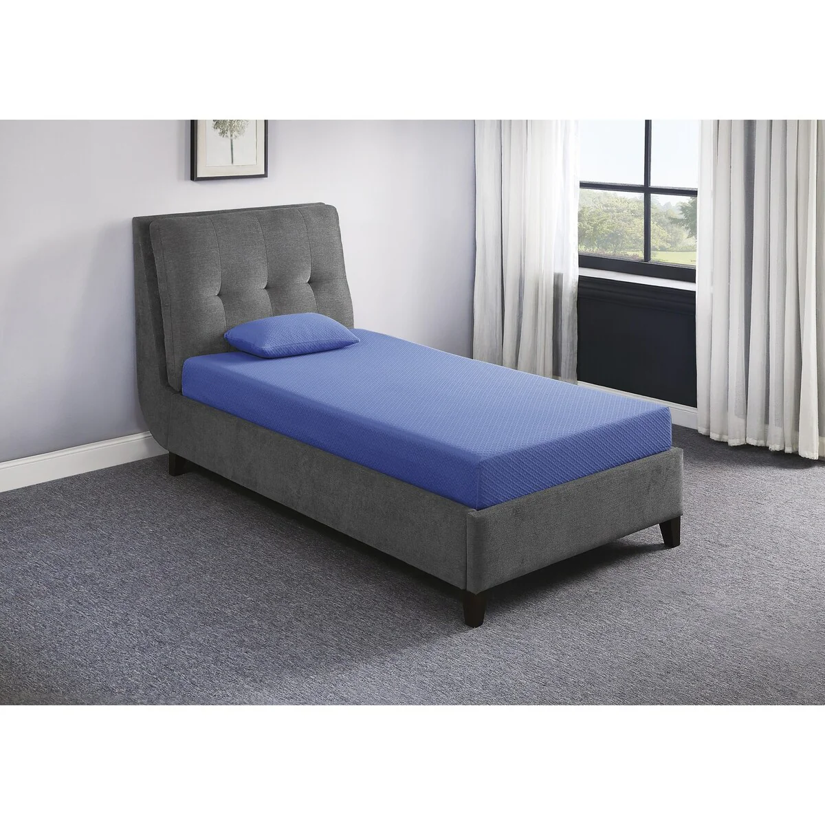 The blue fabric covering the full mattress is breathable, which allows for a comfortable night’s sleep no matter the season.