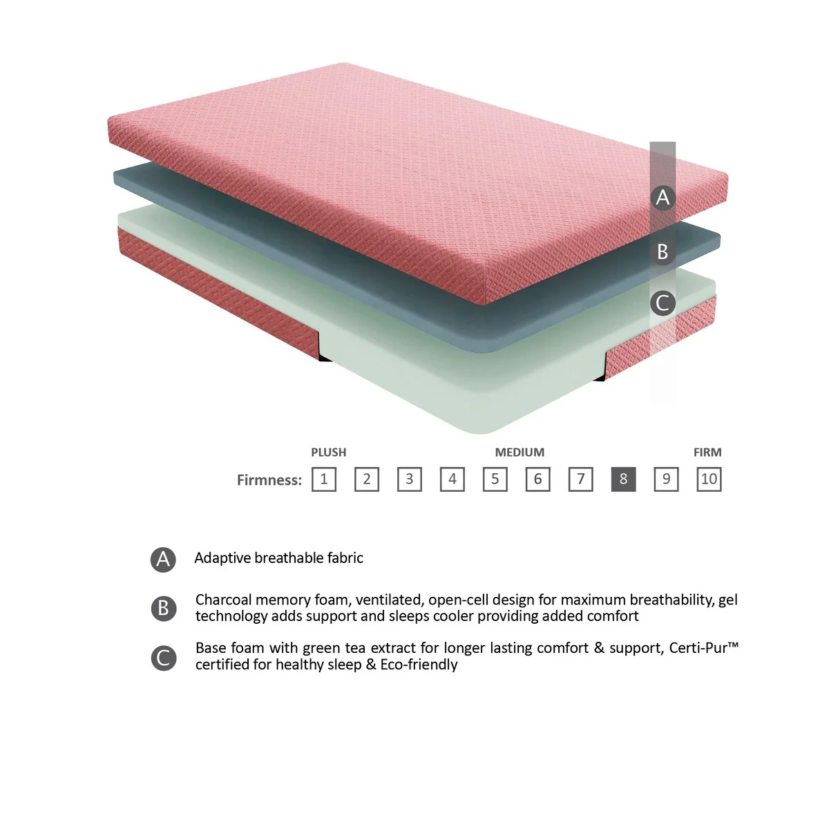 Our 7-inch mattress features a double layer construction that consists of: 1-inch gel-infused charcoal memory foam and 6-inches of high-density base foam that is infused with green tea extract.