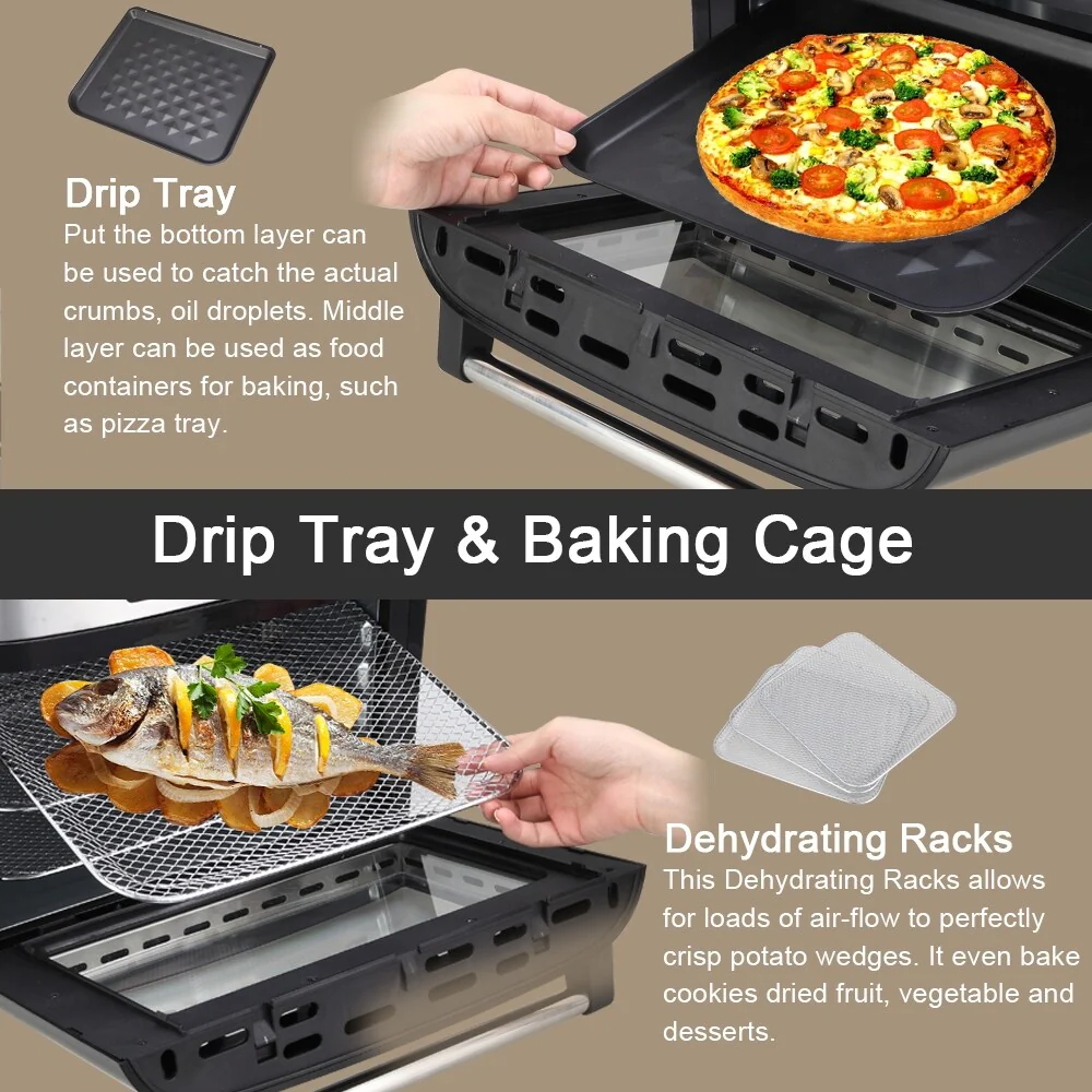 3. 8 Accessories allow you to do more than fry , one of the best parts about the Air Fryer Oven is its versatility. With the 8 included accessories, each Deluxe Air Fryer Oven comes with a Fry Pan (Drip Tray) , three Fry Net, Chicken Fork , Rotating Basket , Skewer Rack , Fetch Rack