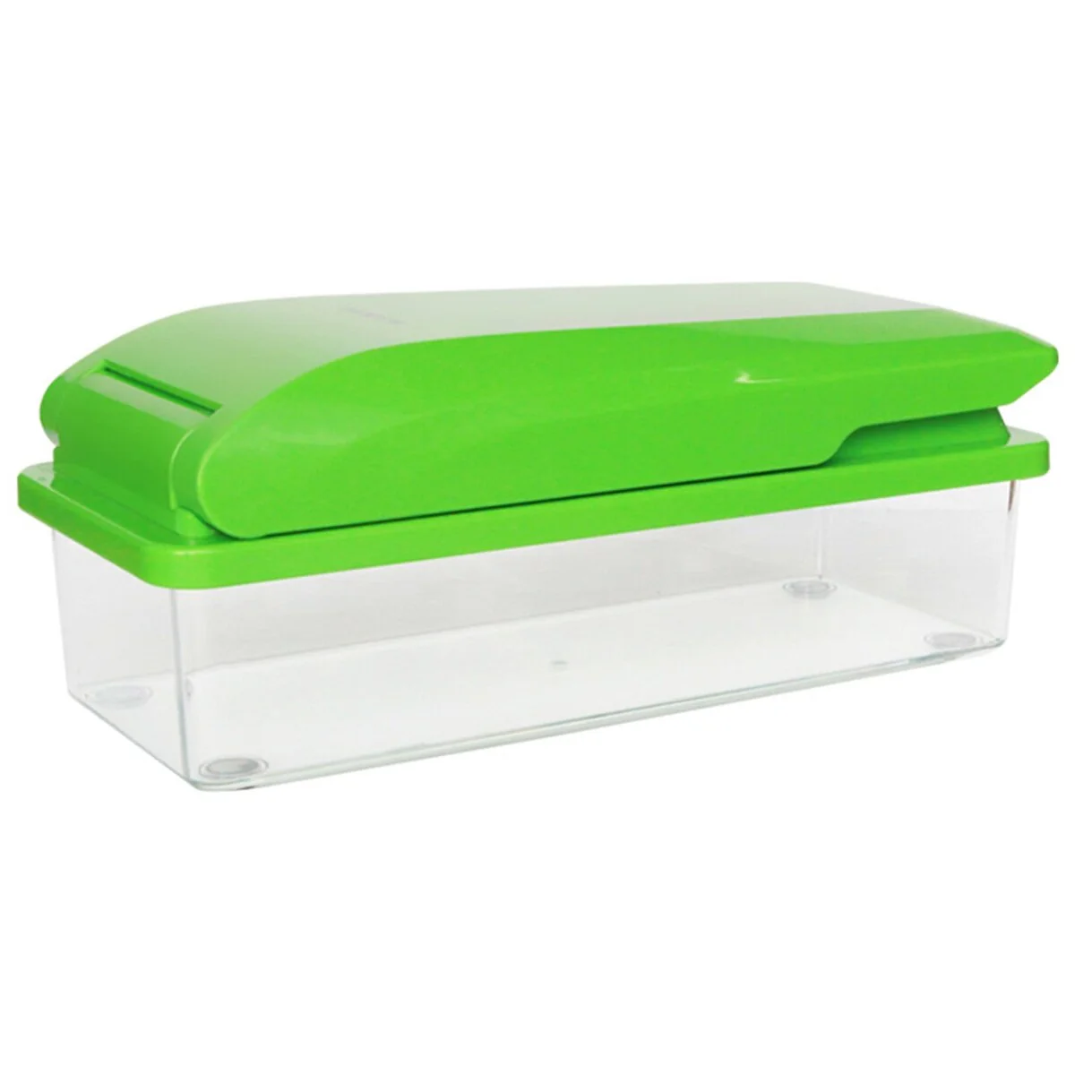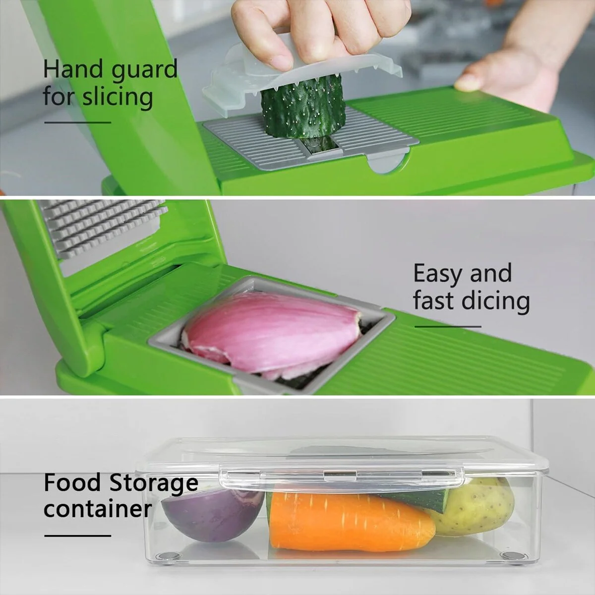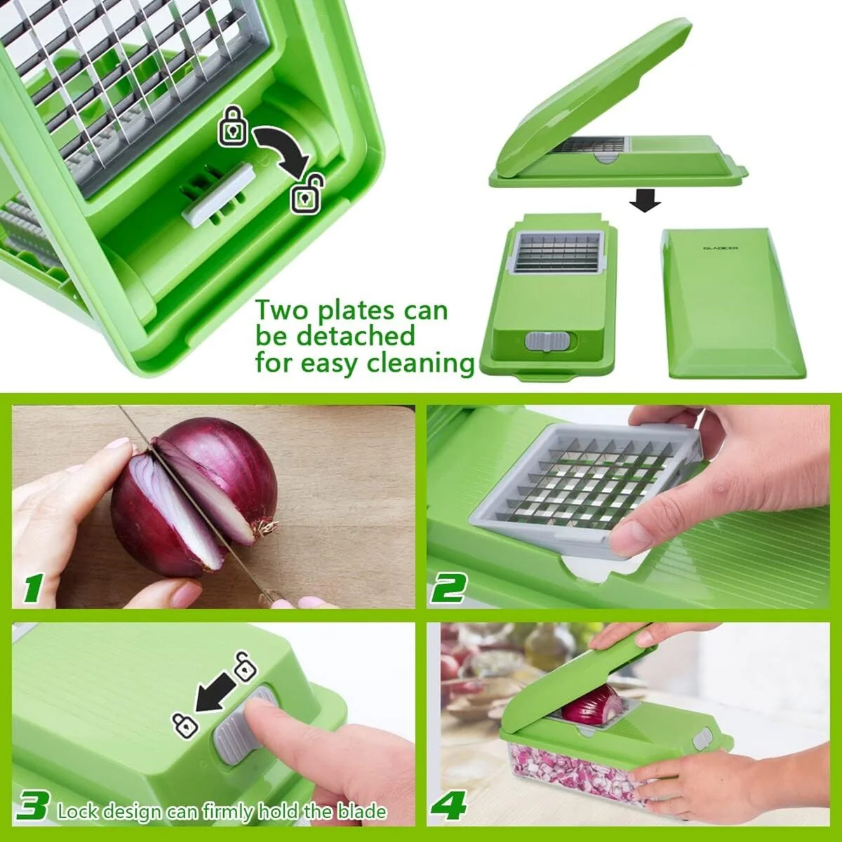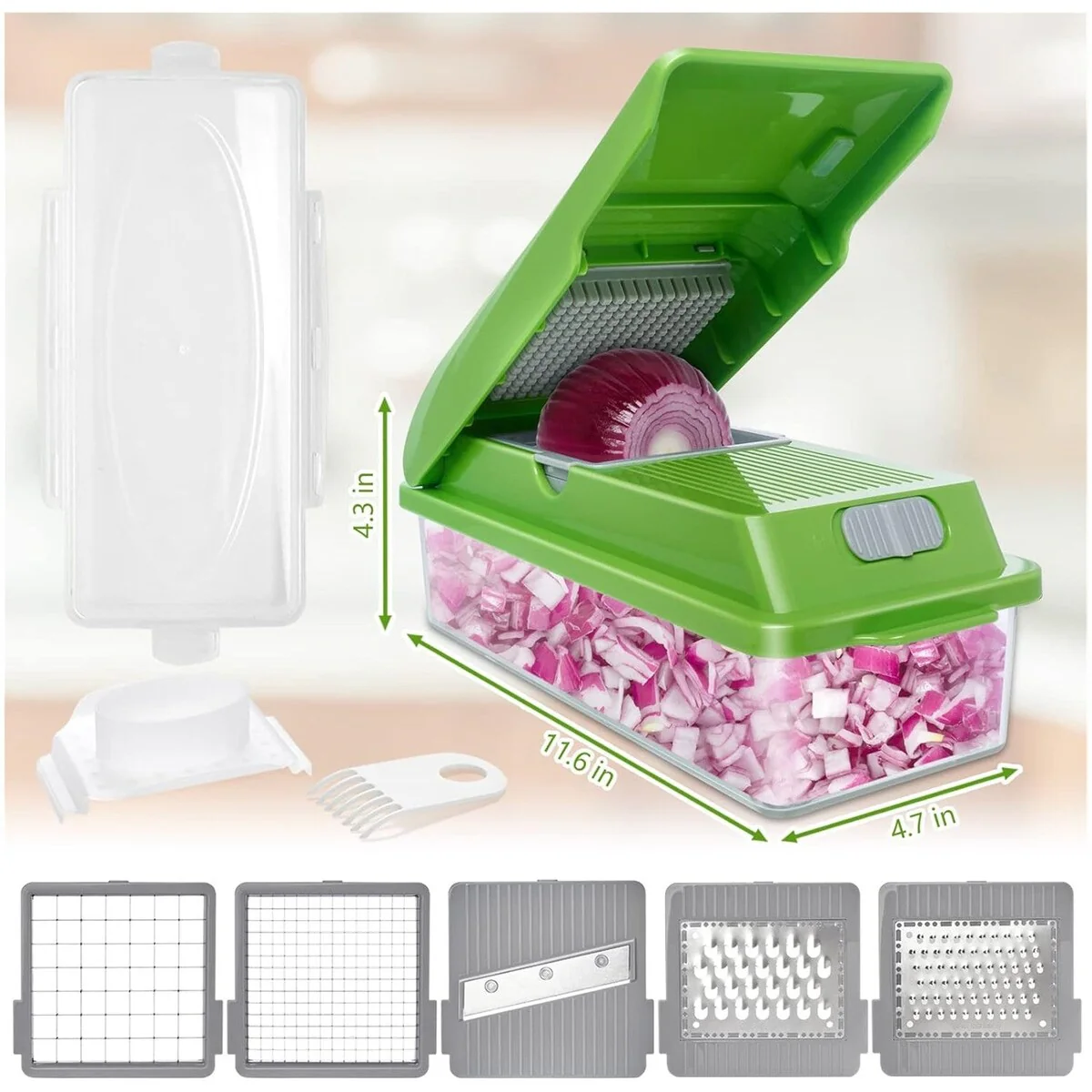 [HIGH QUALITY RUST RESISTANT BLADES] -The onion chopper is made of high-quality Stainless Steel and food-grade plastic, BPA-free, and durable. The heavy-duty stainless steel blade is sharp enough, and the high-quality stainless steel blade can chopping tough vegetables and can cut most types of vegetables and fruits. Multifunctional vegetable chopper, which can help shorten your preparation time.[MULTI-FUNCTIONAL CHOPPER] 5 interchangeable Blades snap in and out with ease. With a large capacity of 1.6L storage box, with a sealed lid, can be used as a food preservation box. Removable top cover for easier use of various blades. Remove the top cover for easy use of slicing, shredding and shredding blades.[5 INTERCHANGEABLE BLADES]-The veggie chopper has 5 interchangeable blades for julienne, grating and slicing with ease. Built-in chop lid lets you cut foods directly into the collection tray without the mess of a knife and cutting board. Storage container lets you hold prepared vegetables in the Vegetable Cutter until you are ready to begin cooking.The Perfect Home Cooking Gadget![SAFE and ERGONOMIC DESIGN]-The manual food chopper offers an effective hand protector for protecting your fingers from accidental nicks. And we have lock buckle design can fix the blade during use, which is more safe. All the blades can store inside the vegetable chopper container after using it.[KEEP CLEAN]-Use the container that comes with the multi-function chopper to free up space on the countertop. The vegetable slicer can be completely disassembled. Use a cleaning brush to scrape off the residue on the pressure plate, and the residue on the blade can be wiped clean. It can be easily cleaned in a few minutes by using the matching scrubbing fork.
