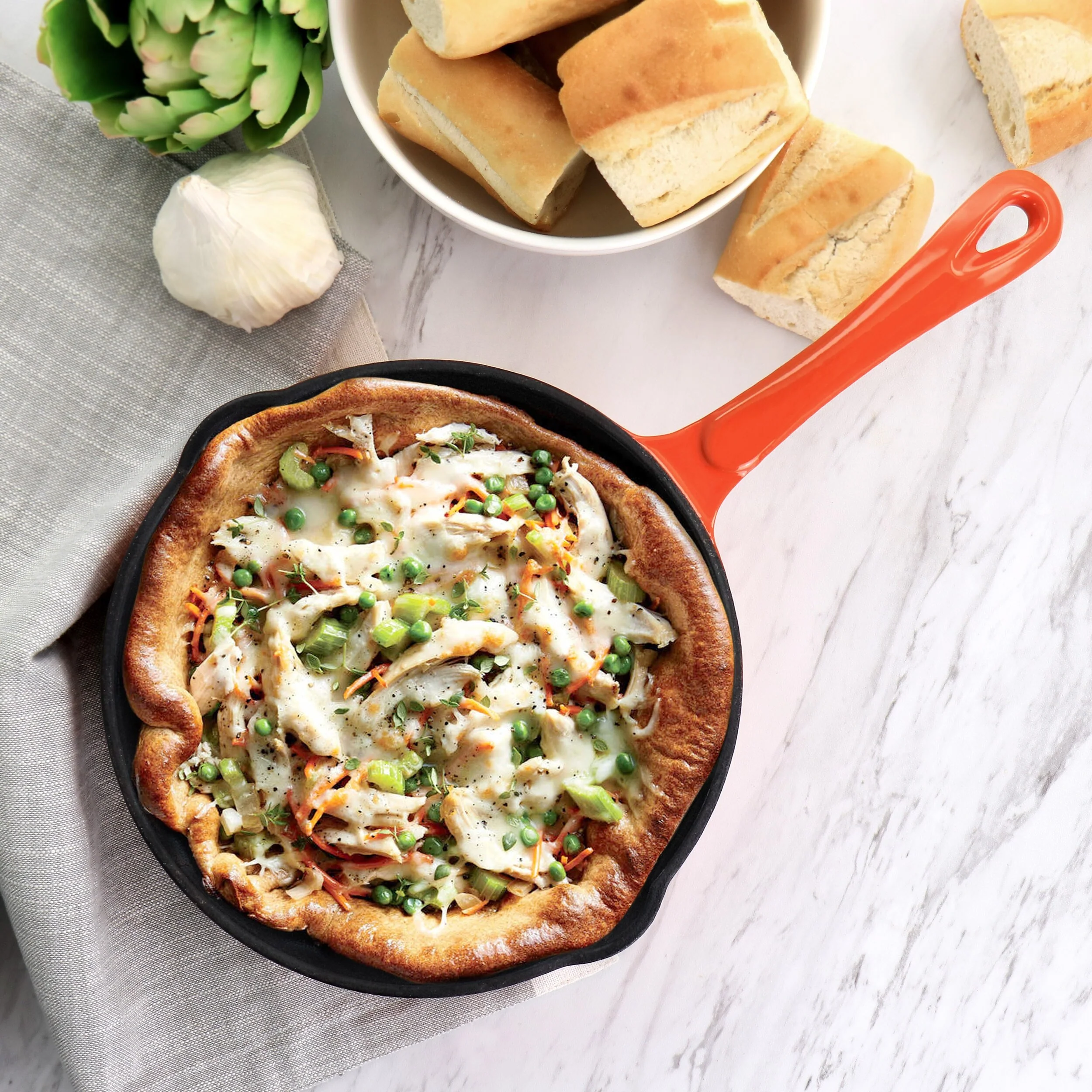 The MegaChef enameled round 8in pre-seasoned cast iron pan is an every day essential for your cooking needs. Small 8in size is great for one to two person meals, side dish prep, reheating, and more. Enameled handle and outer coating adds a pop of color and a smooth handling surface. Versatile cast iron material is great for consistent even heating, and bringing your dish from the stove top to finish in the oven- oven safe up to 500F. Features include a hanging hole on handle that offers storage options, and pour spouts at the sides that are convenient for draining meat juices and pouring sauces. Preseasoned coating prevents rust while sitting in storage and means you can get to cooking right away! Item Dimensions: 14.20" x 8.50" x 1.60"Item Weight: 3.05lbs