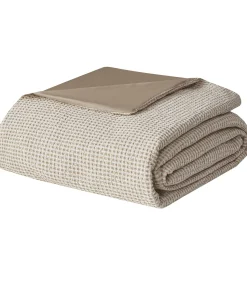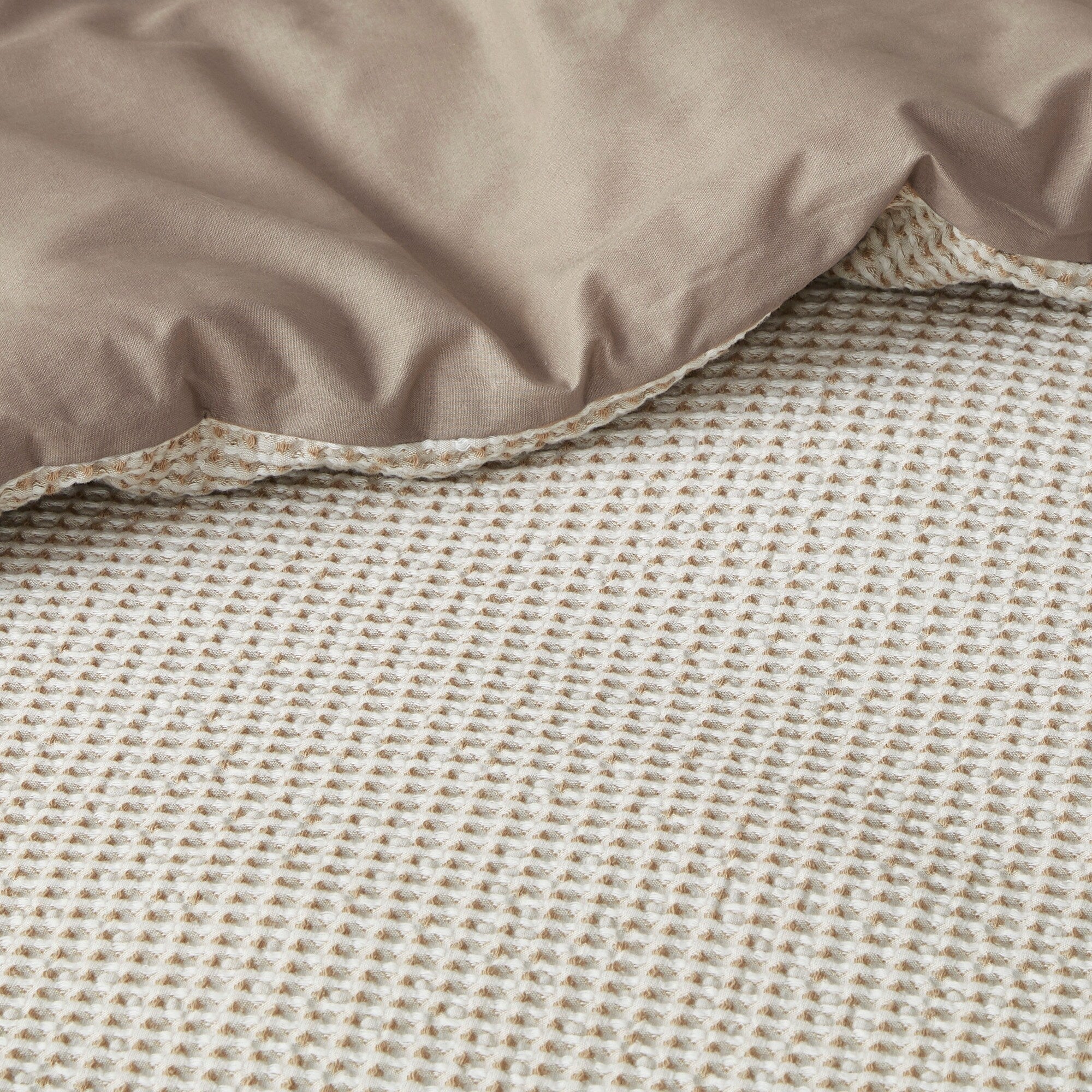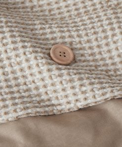 - 50-percent cotton, 50-percent rayon from bamboo, yarn dyed waffle washed face, cotton solid back, duvet and sham, button closure. Antimicrobial treatment.