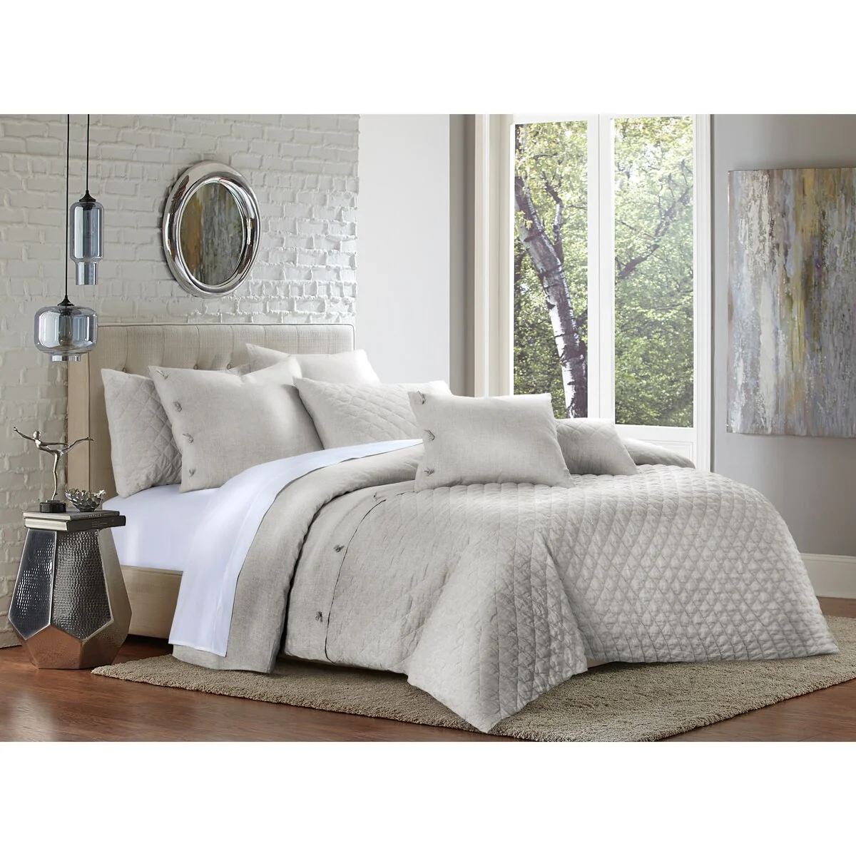 The Gibson linen duvet set is all about cool luxury, and the beautiful, washed linen makes it possible! Woven in China using Belgium flax linen, this natural fabric features quilting and solid details to create a faux closure on the top of the duvet with a hand-tied look. The charming effect is enhanced by unique button hole and knot tie closures on the shams and accessories. The Gibson bedding is all you need to turn your bedroom into a restful retreat. The 2 decorative pillows have removable covers and feather fills. All components reverse to linen. Sold as a 7 Pc Queen and 8 Piece King set.