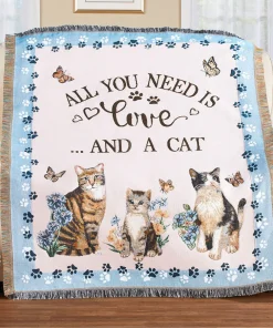 This cute and colorful throw is a delightful gift for the cat lover in your life. Featuring a trio of adorable cats sitting among pretty flowers, the throw reads, "All You Need Is Love…And A Cat." It has a border of sweet paw prints and is finished with multicolor fringe trim. Machine wash. Polyester and cotton; imported. 60"L x 50"W.