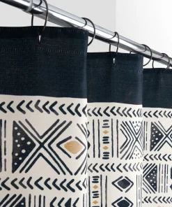 Make a dramatic statement in your bathroom with the Amal Shower Curtain by Allure Home Creation. This global inspired aztec themed design features a medley of geometric motifs in alternating bands shown in a neutral pallet of black with honey accents on a cream background. This unique pattern will add bold texture and sophisticated interest to your room. This all over design is printed on 100% easy care textured polyester fabric. It measures 70" x 72" and will fit most standard sized tubs and shower areas. The reinforced buttonhole top works with standard shower hooks and curtain rods. Not only will this shower curtain bring trendy fashion to your bathroom, it will help prevent water from splashing outside of your tub or shower stall. The reinforced button-hole top on this fabric shower curtain works with standard shower hooks and curtain rods. Use of a liner is recommended. Machine wash and tumble dry on low heat.